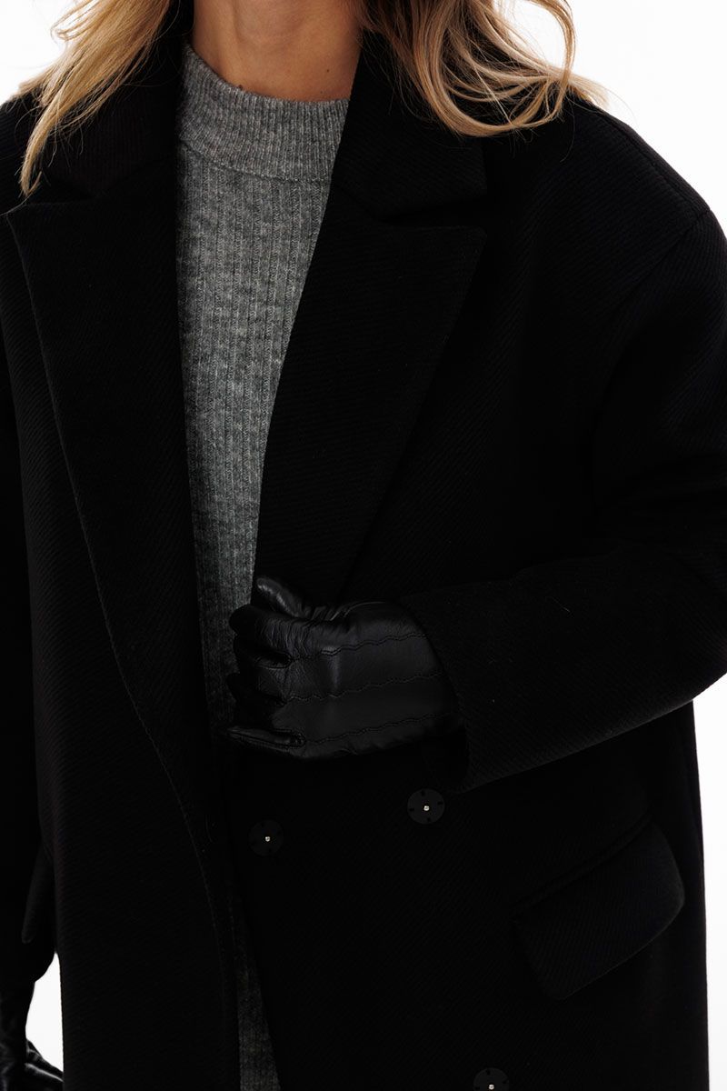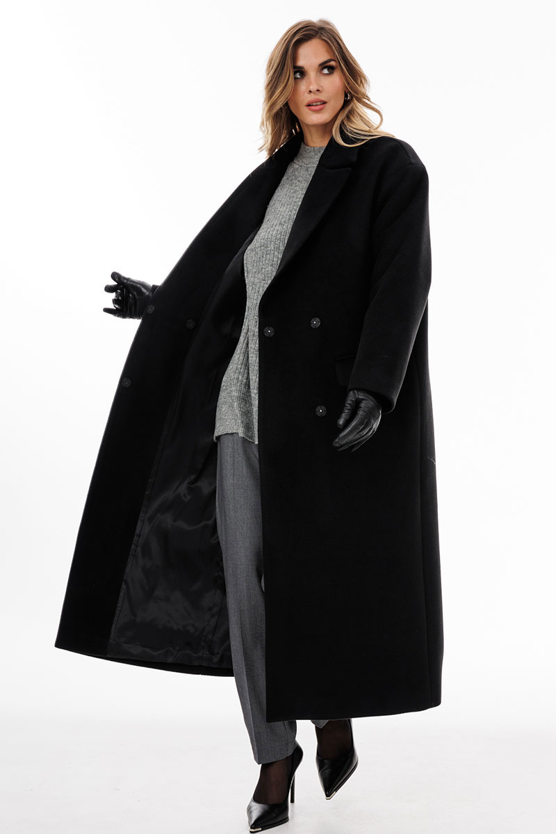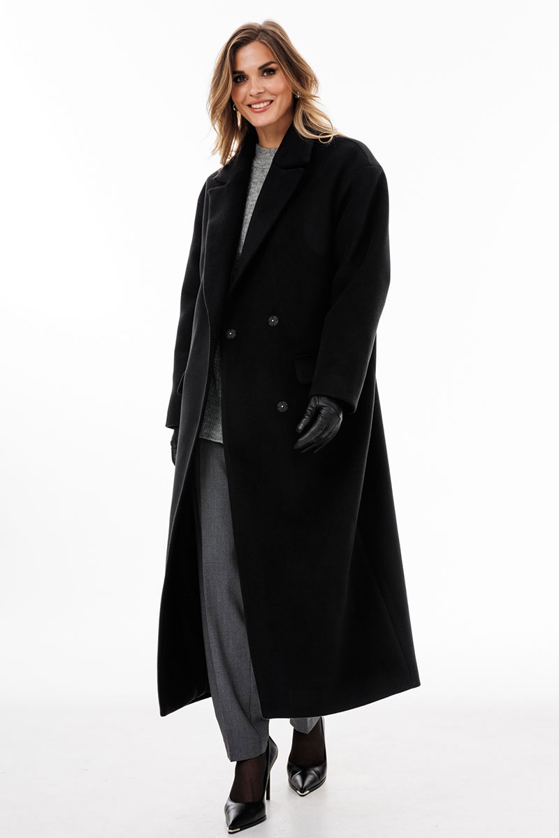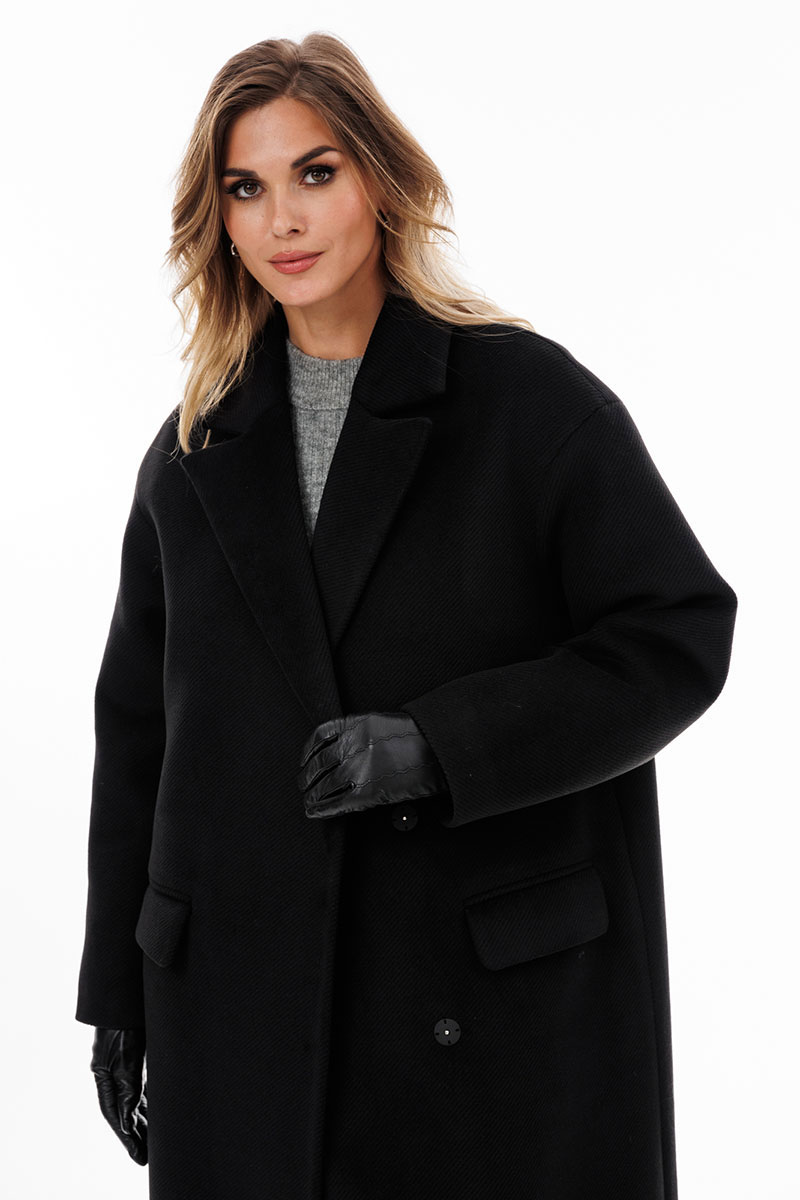 Пальто выполнено из пальтовой ткани в рубчик. Пальто прямого силуэта, длиной до середины икры. Спереди застежка двубортная на пришивные кнопки, горизонтальные прорезные карманы. Спинка со средним швом со шлицей по низу. Воротник пиджачного типа. Плечевой шов спущен. Рукав одношовный. Пальто на притачной по низу подкладке.
