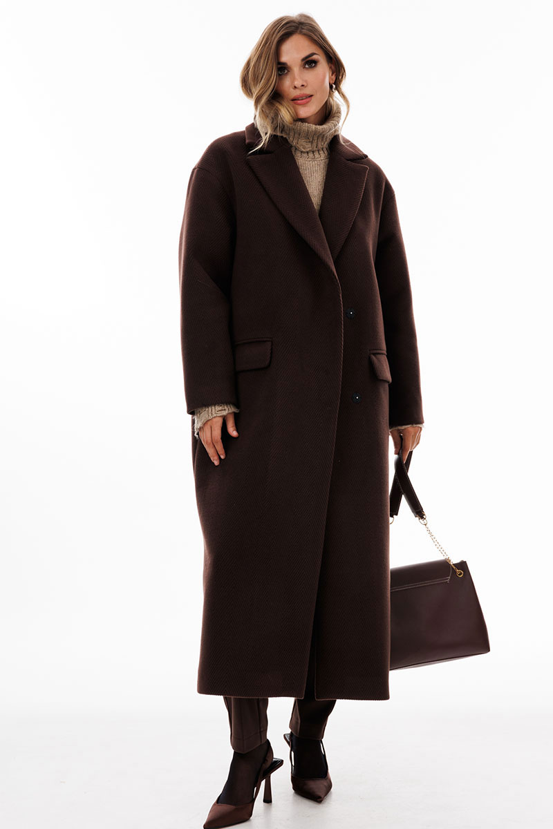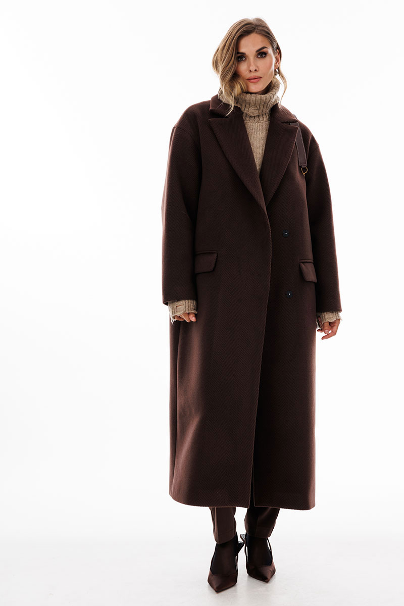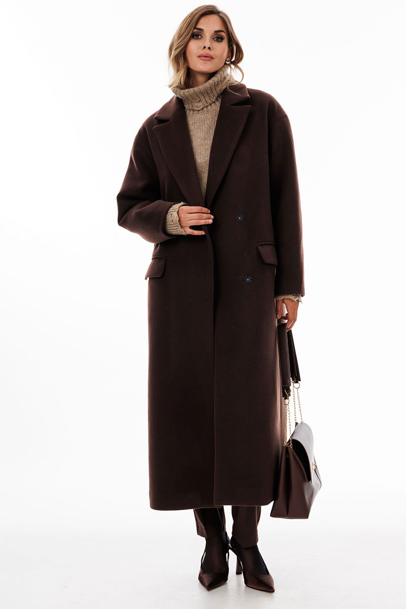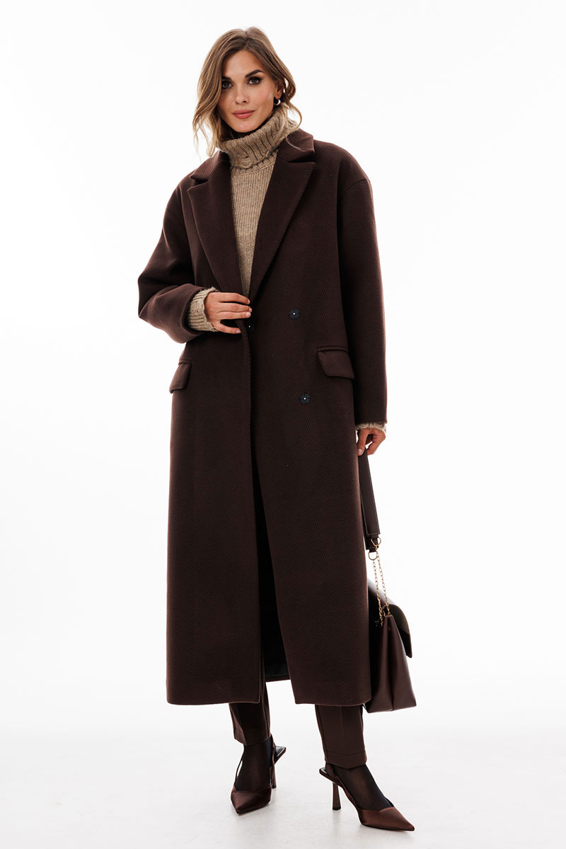 Пальто выполнено из пальтовой ткани в рубчик. Пальто прямого силуэта, длиной до середины икры. Спереди застежка двубортная на пришивные кнопки, горизонтальные прорезные карманы. Спинка со средним швом со шлицей по низу. Воротник пиджачного типа. Плечевой шов спущен. Рукав одношовный. Пальто на притачной по низу подкладке.