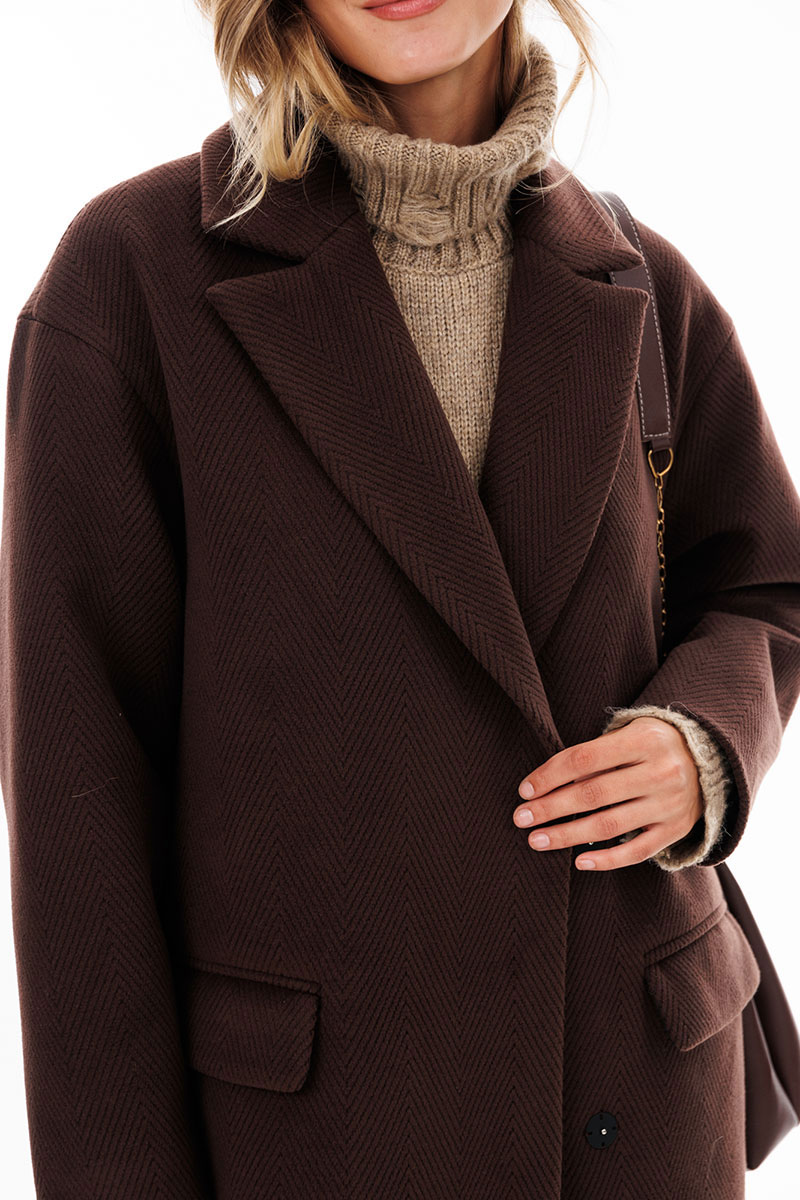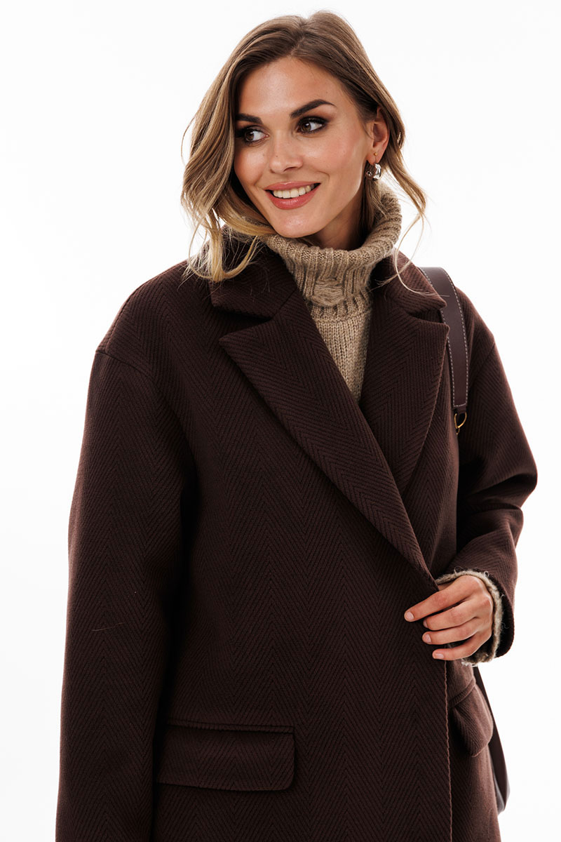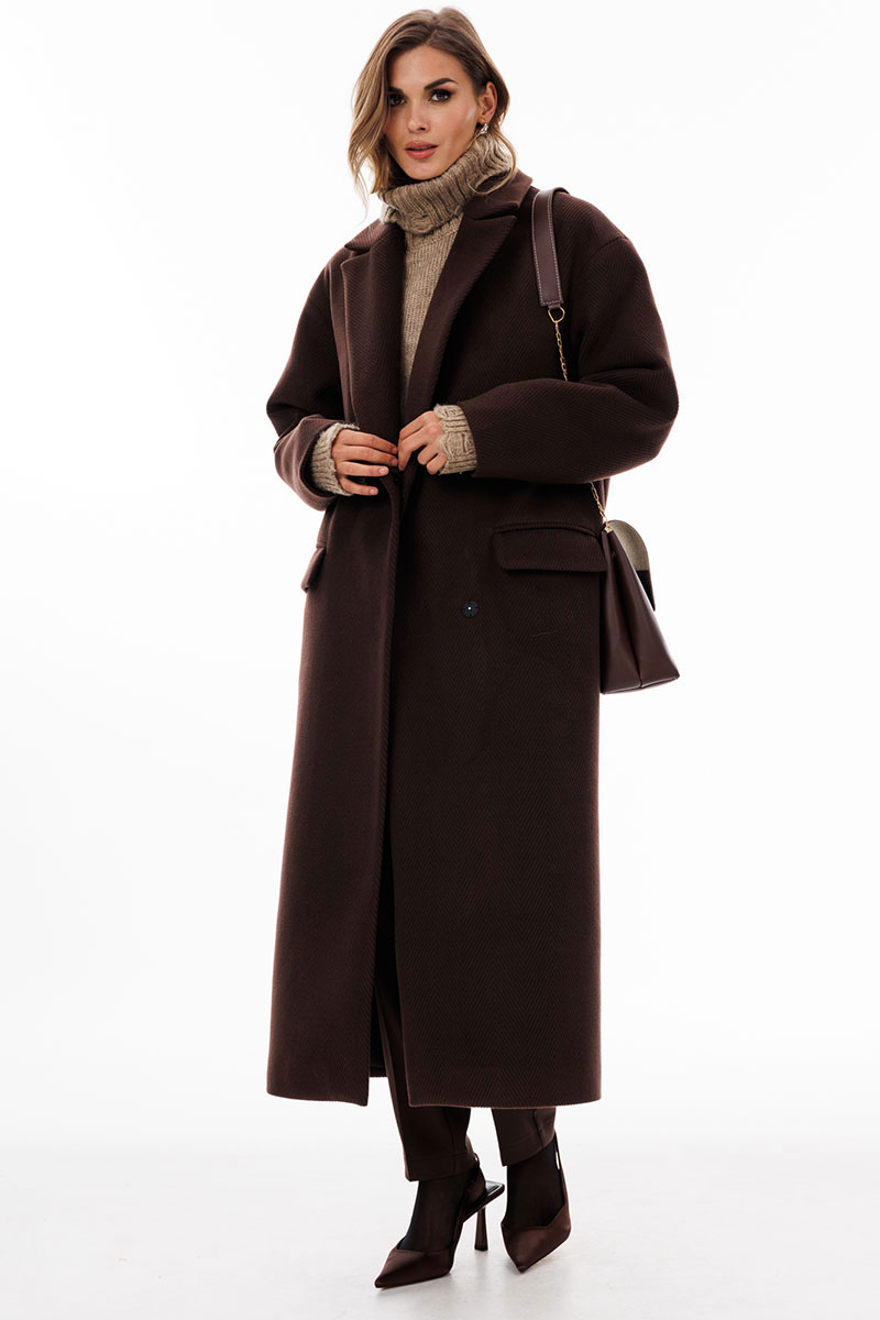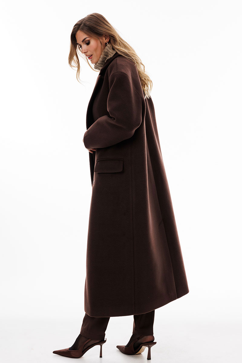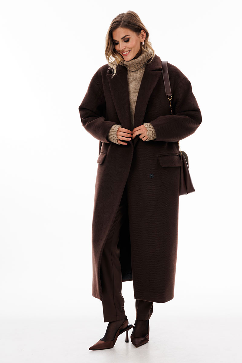 Пальто выполнено из пальтовой ткани в рубчик. Пальто прямого силуэта, длиной до середины икры. Спереди застежка двубортная на пришивные кнопки, горизонтальные прорезные карманы. Спинка со средним швом со шлицей по низу. Воротник пиджачного типа. Плечевой шов спущен. Рукав одношовный. Пальто на притачной по низу подкладке.