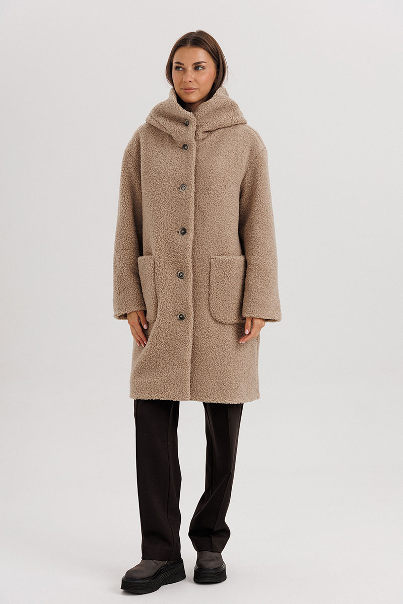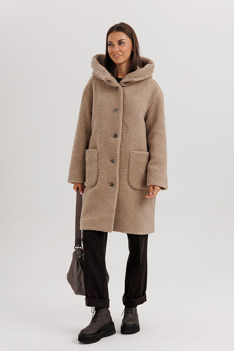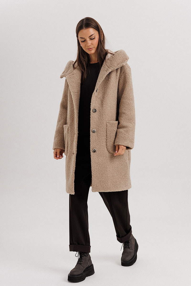 Сегодня на повестке дня – модное пальто! Поскольку половина золотой осени почти прошла, актуальность пальто достигает своих вершин. Casual в виде однобортного пальто выше колен, стильный oversize, в модели кокон, трендовый «Teddy bear». Это пальто элегантно и лаконично, нет слишком замысловатых форм и броского декора. Свободный силуэт со слегка заниженной линией плеча, рубашечный покрой, застежка центральная на петли и пуговицы и необычный капюшон-воротник. На полочке наклонно расположены накладные карманы. Рукав с широкой подгибкой, которая может быть использована как отложенная манжета.