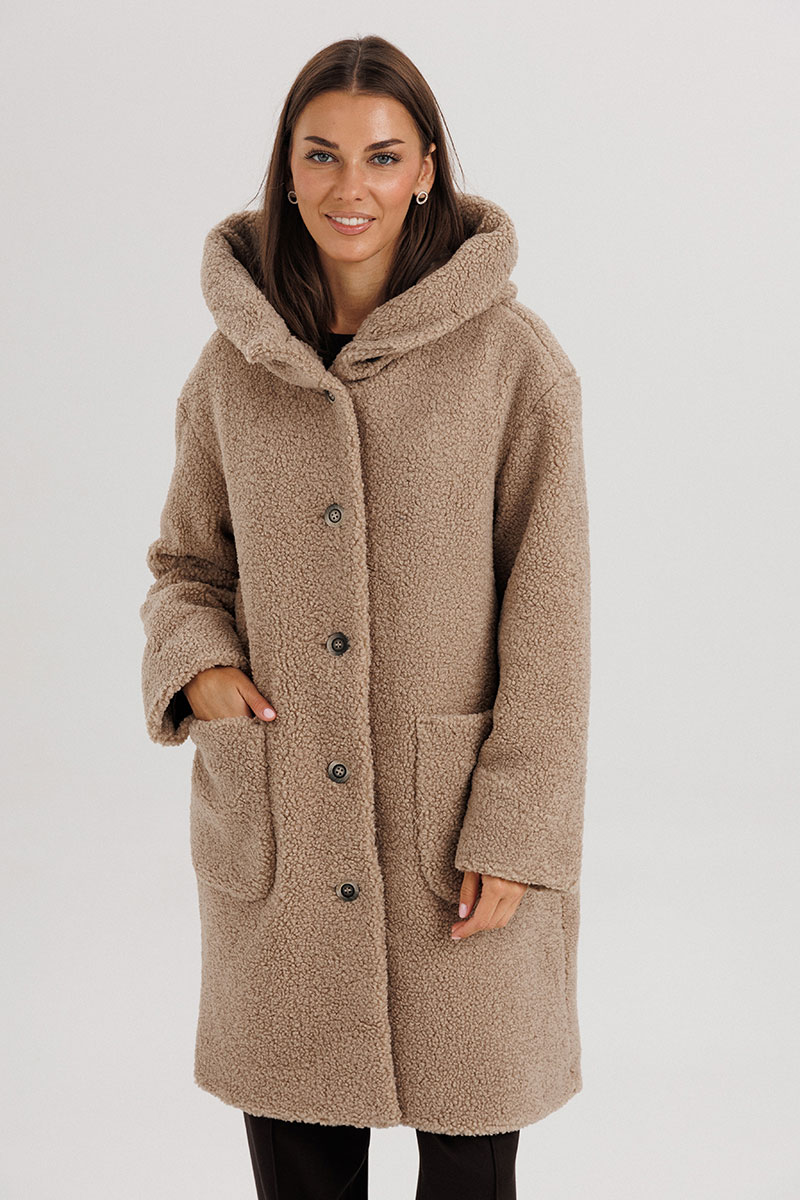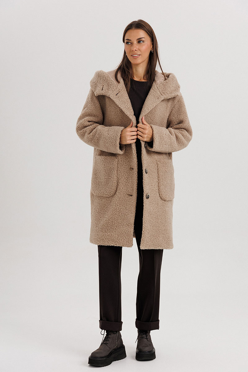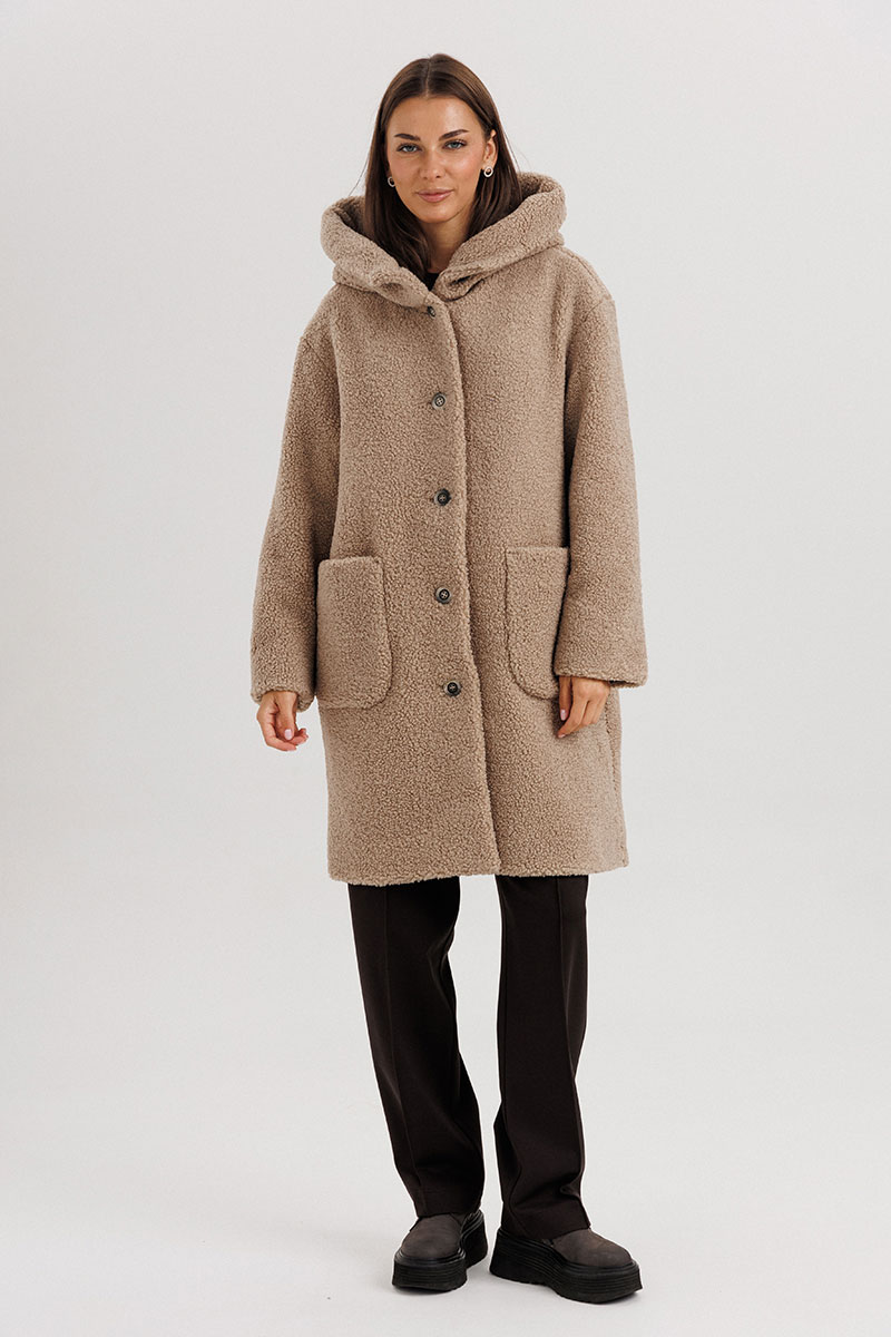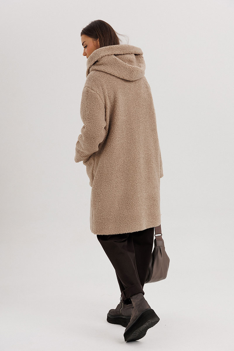 Сегодня на повестке дня – модное пальто! Поскольку половина золотой осени почти прошла, актуальность пальто достигает своих вершин. Casual в виде однобортного пальто выше колен, стильный oversize, в модели кокон, трендовый «Teddy bear». Это пальто элегантно и лаконично, нет слишком замысловатых форм и броского декора. Свободный силуэт со слегка заниженной линией плеча, рубашечный покрой, застежка центральная на петли и пуговицы и необычный капюшон-воротник. На полочке наклонно расположены накладные карманы. Рукав с широкой подгибкой, которая может быть использована как отложенная манжета.