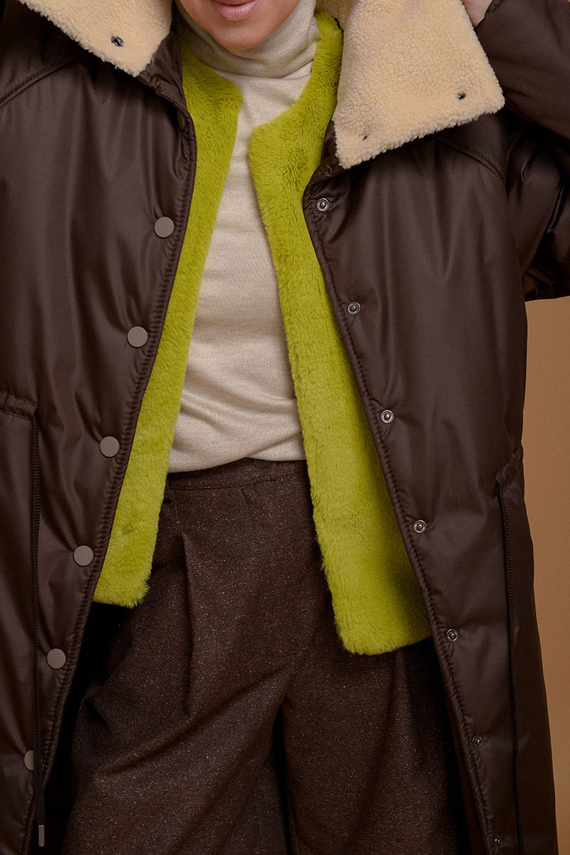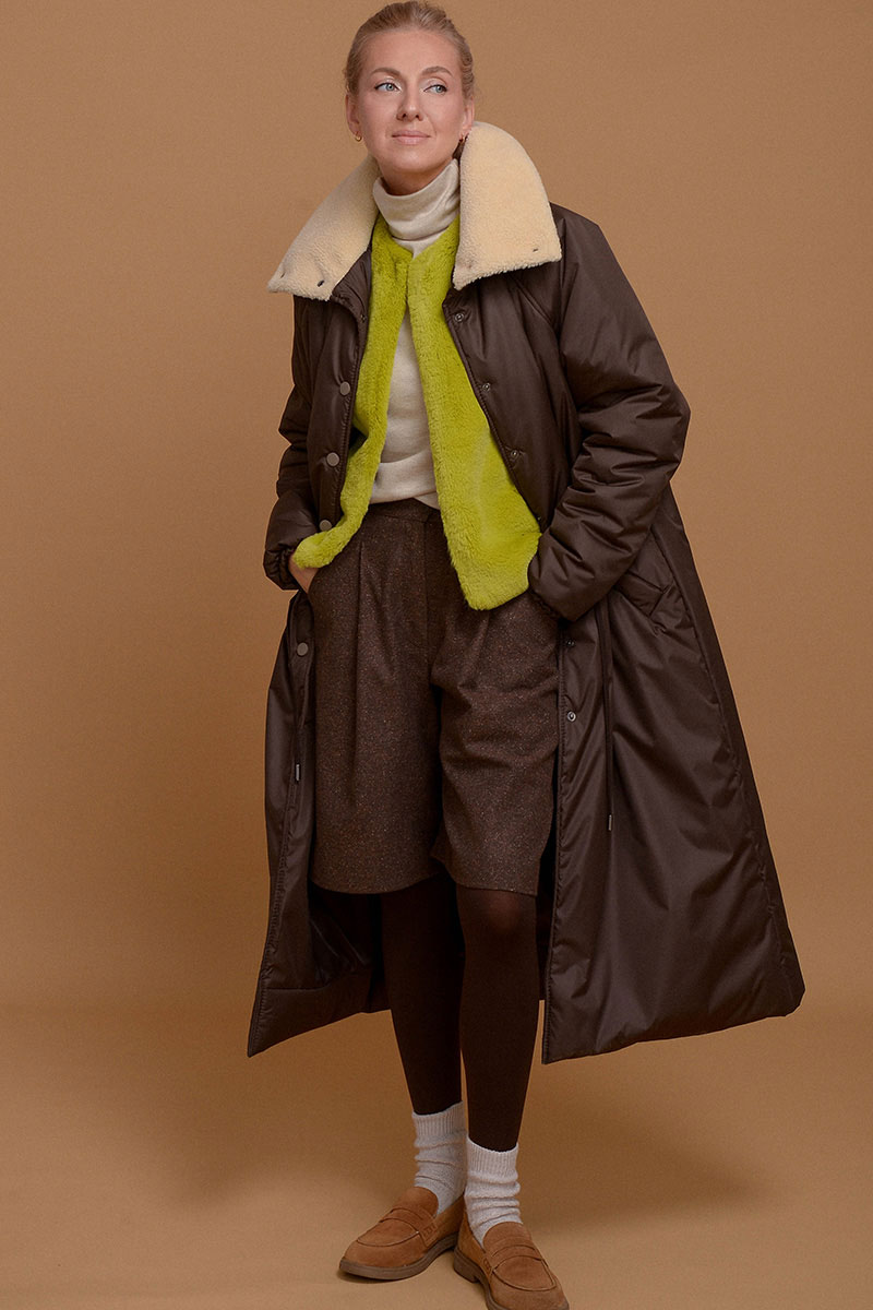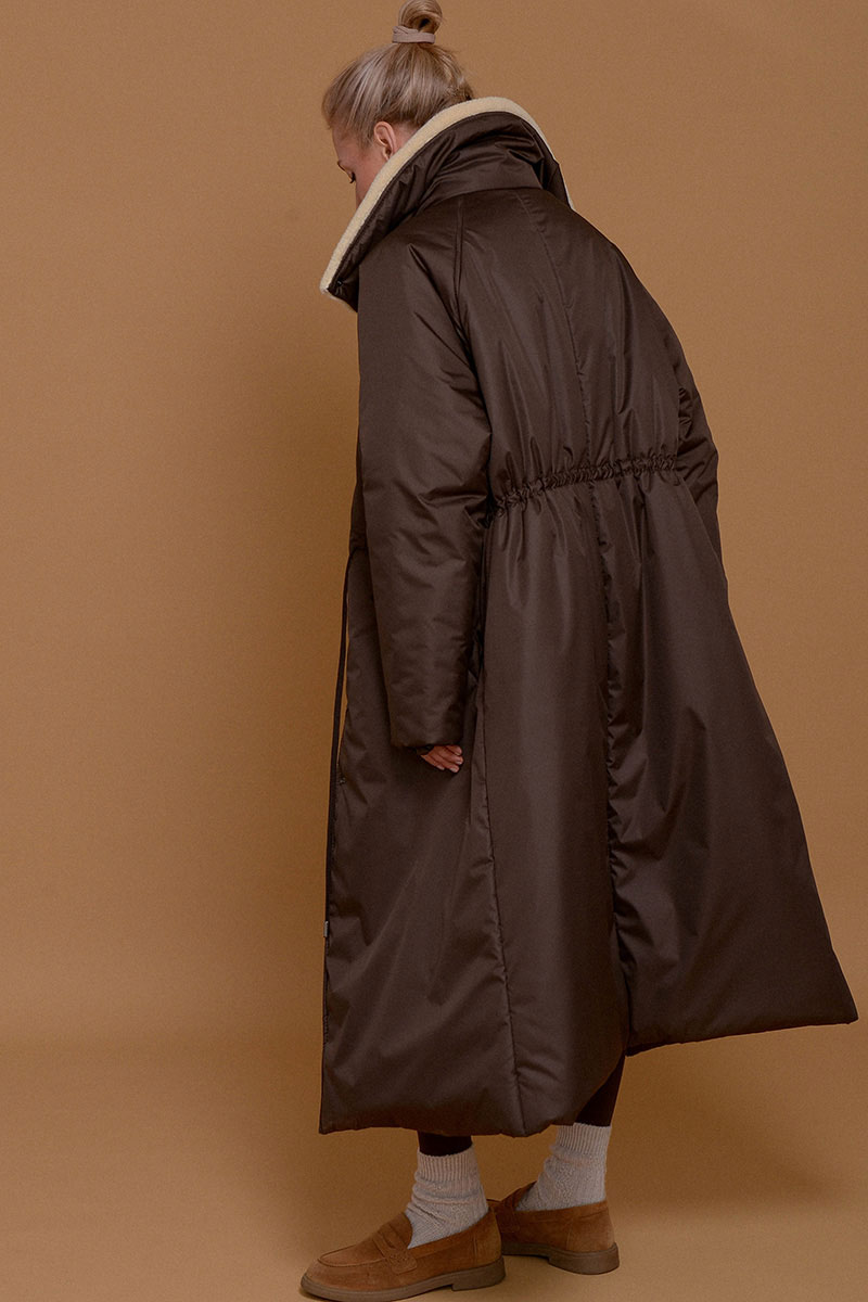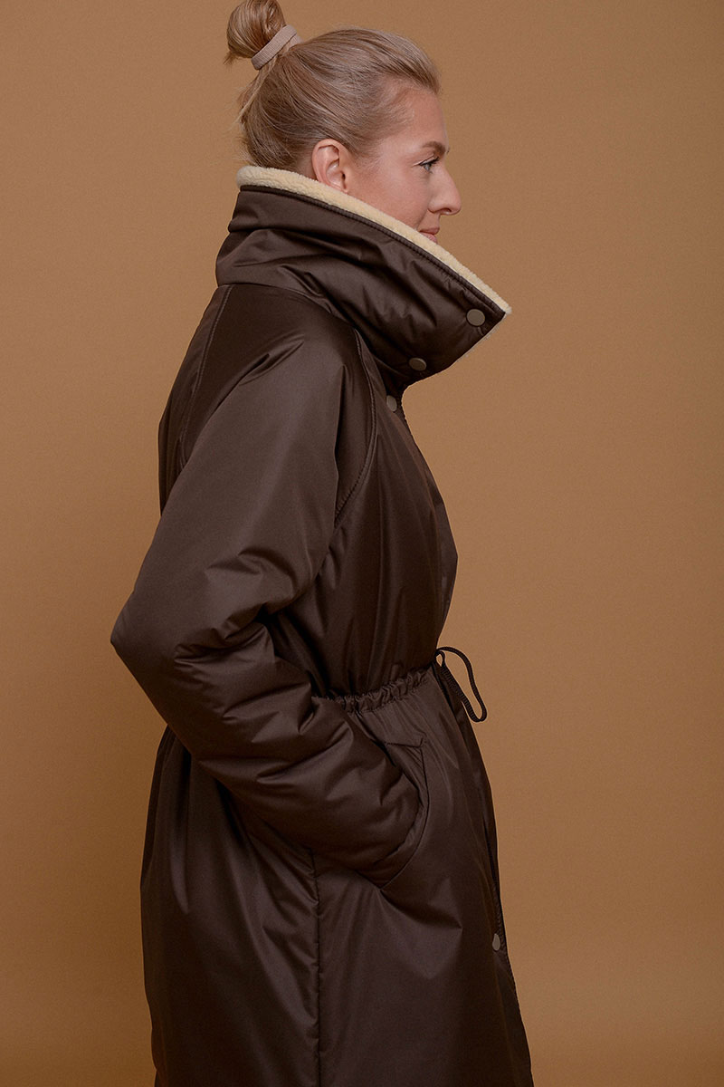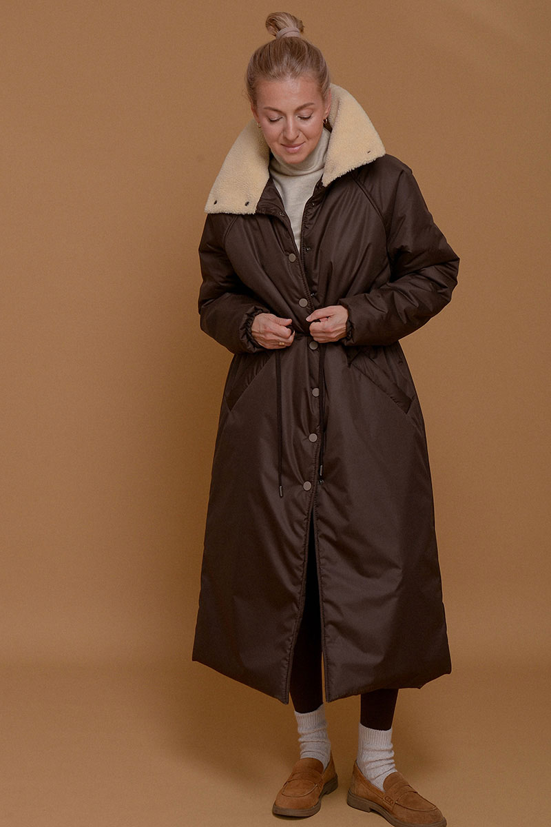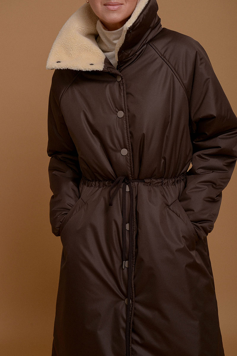 Невероятно легкое и одновременно теплое и уютное пальто в оттенке темного шоколада. С ним можно носить любимые платья даже в морозы. Плотная ткань не пропускает ветер и влагу, высокий воротник-стойка с мягким итальянским мехом и манжеты на резинке помогают сберечь тепло. С помощью кулиски на поясе можно сделать силуэт прямым или подчеркнуть талию. Утеплитель Isosoft хорошо сохраняет тепло и не утяжеляет изделие. Подкладочная ткань - из приятного к коже твила. Рукав реглан смягчает линию плеча и обеспечивает свободу движений. Застегивается на кнопки.