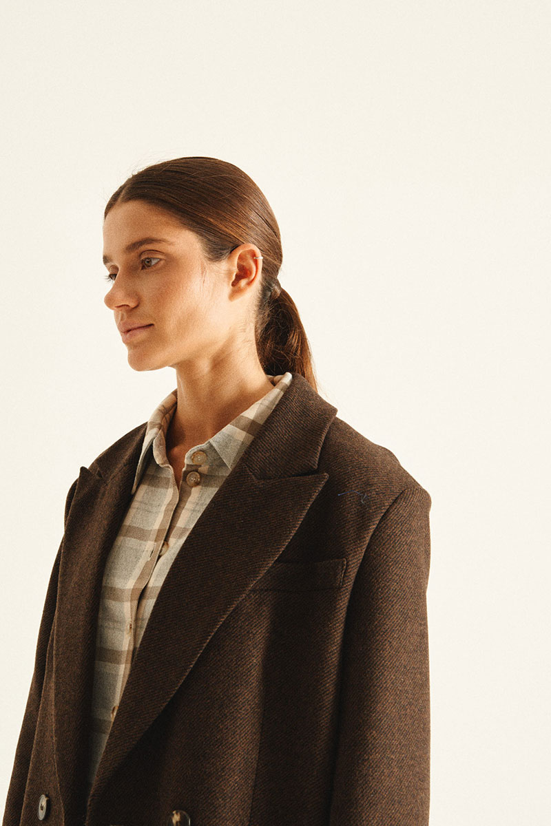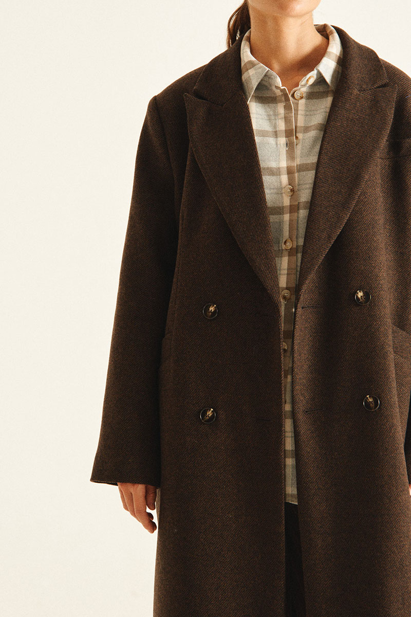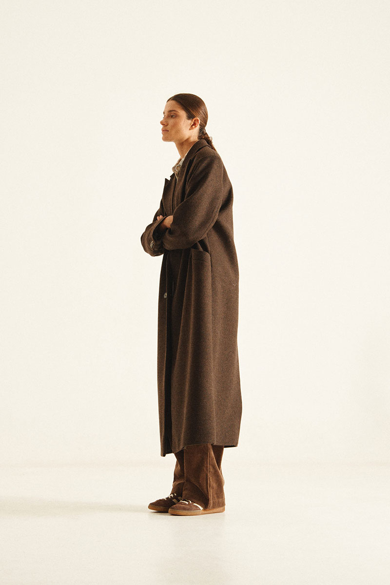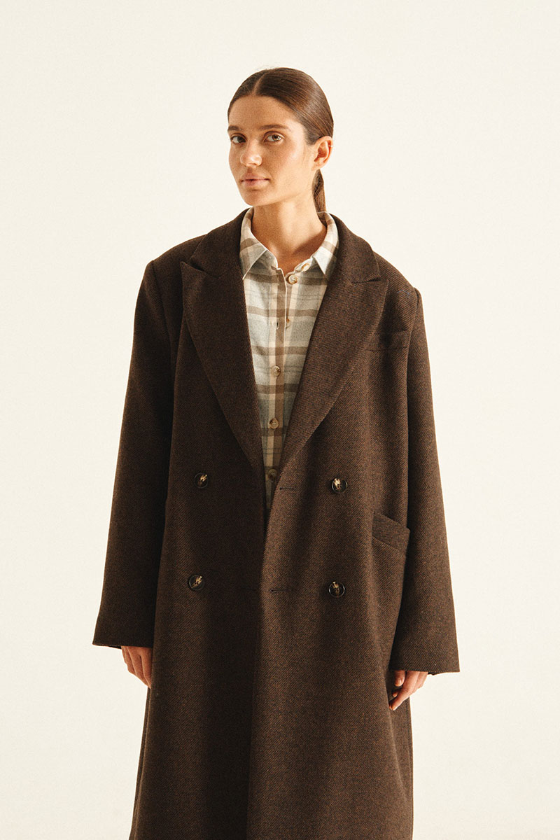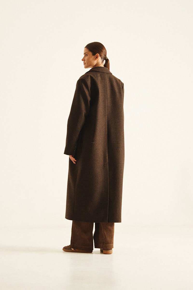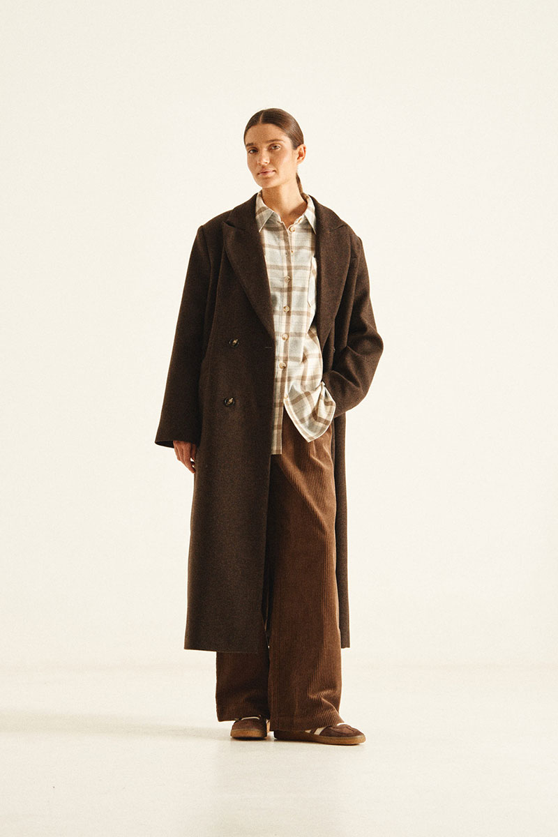 Пальто прямого кроя в длине макси с акцентными плечами. Выполнено на подкладке.