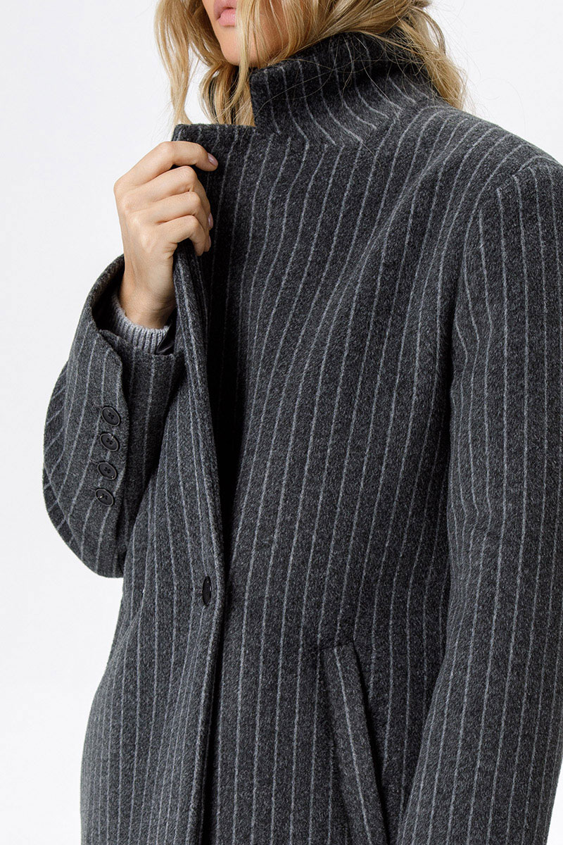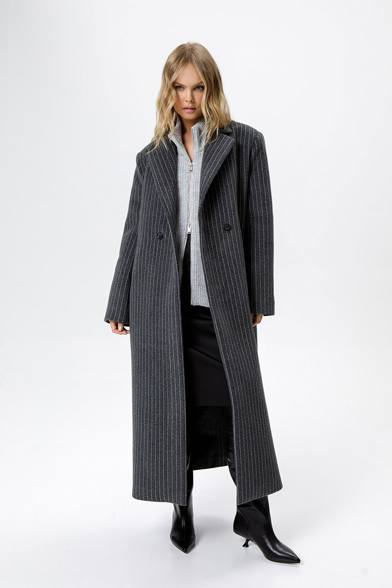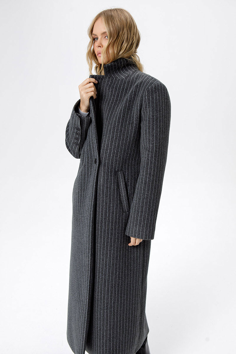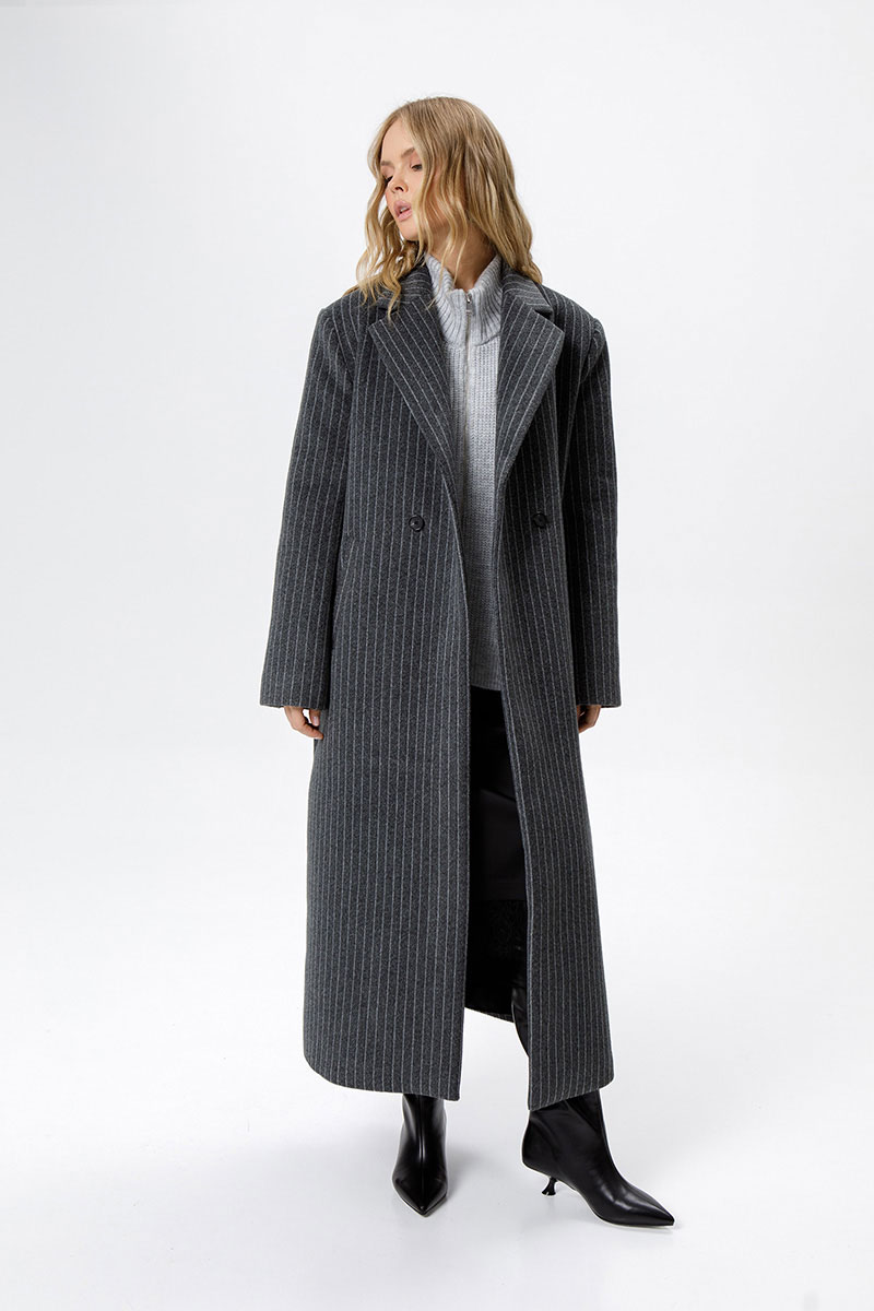 Детали: прямой силуэт, свободный покрой, расширенная линия плеч, пиджачный воротник, двубортная застежка на петли и пуговицы, рукава втачные со шлицей, функциональные карманы, спинка со средним швом и высокой шлицей, пальто на подкладке.