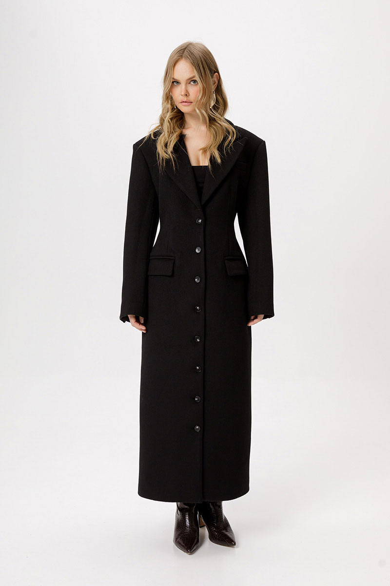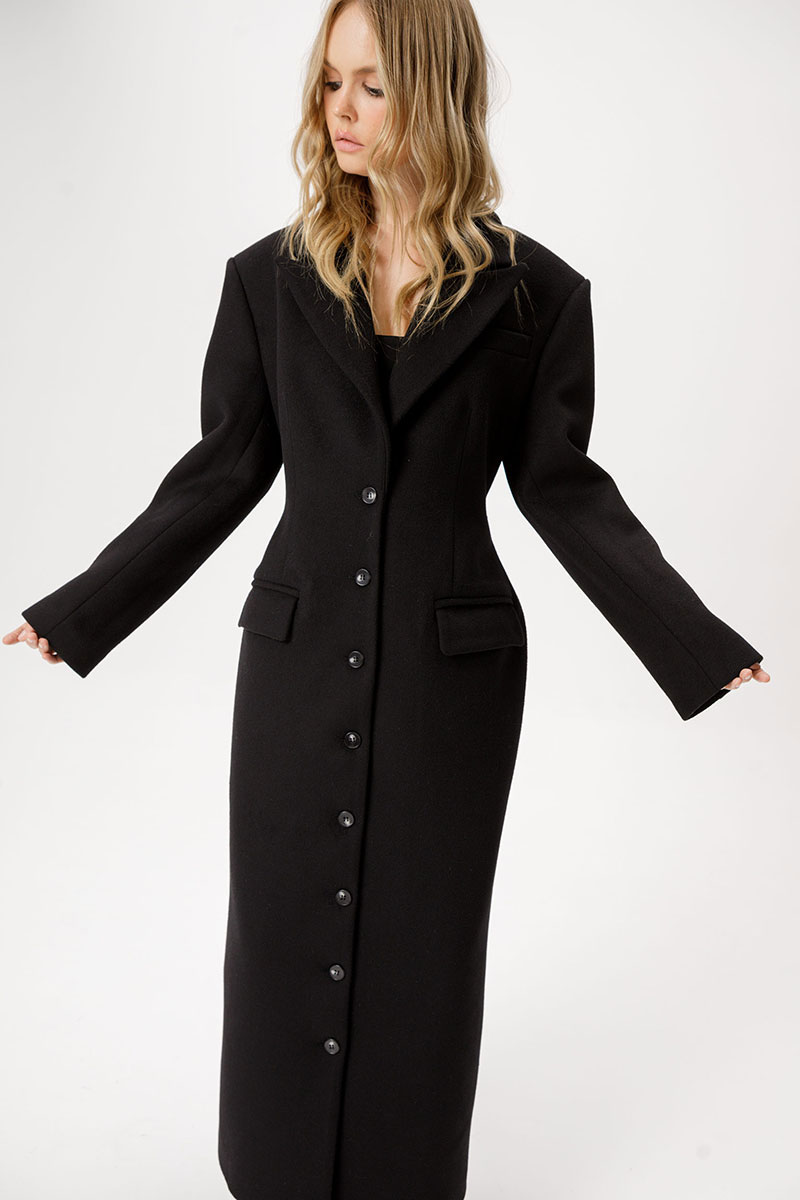 Приталенное шерстянное пальто длины макси.