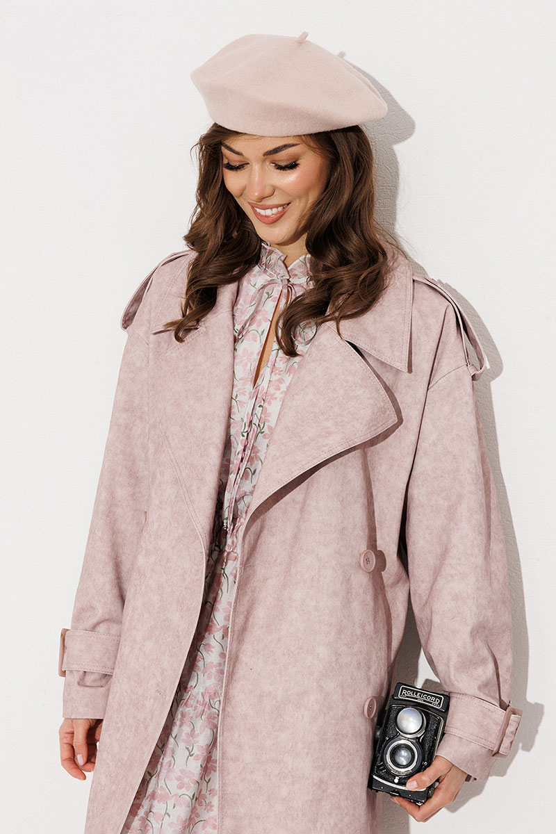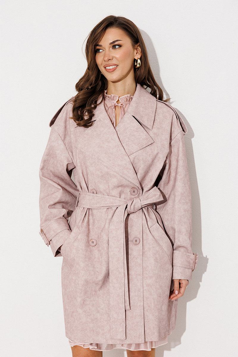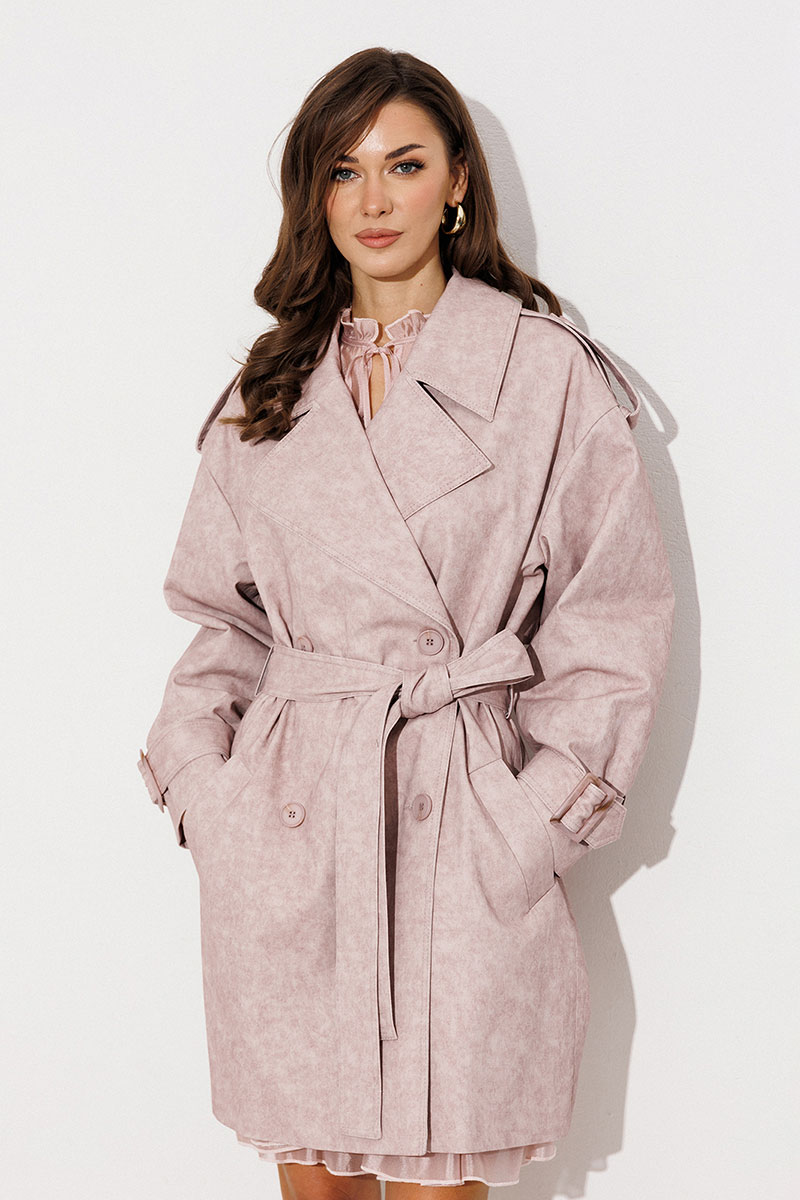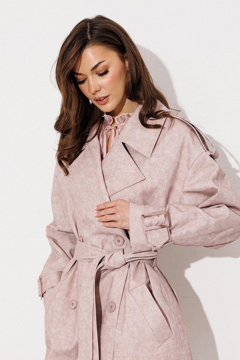 Плащ-тренчкот прямого силуэта с двубортной застежкой на петли-пуговицы, втачным двухшовным рукавом и спущенной линией плеча, по низу рукавов паты с пряжкой. Воротник пиджачного типа - отложной с лацканом. Полочка с карманом-листочкой. Спинка со средним швом и с отлетной кокеткой. По плечевому шву погон с застежкой на петлю-пуговицу. Тренчкот со съемным поясом с пряжкой. Плащ на подкладке.