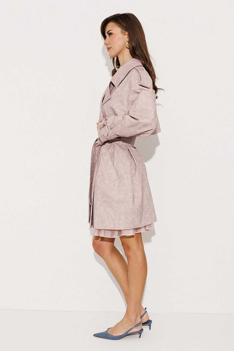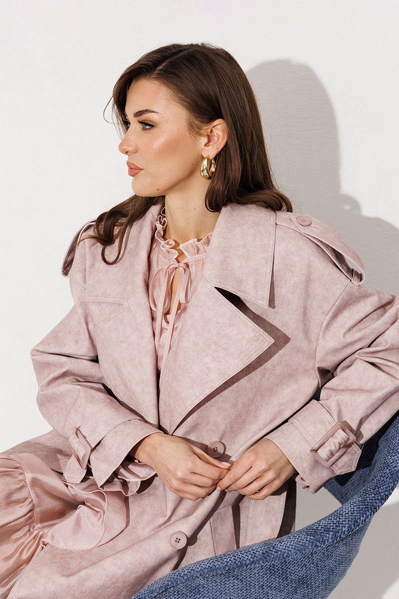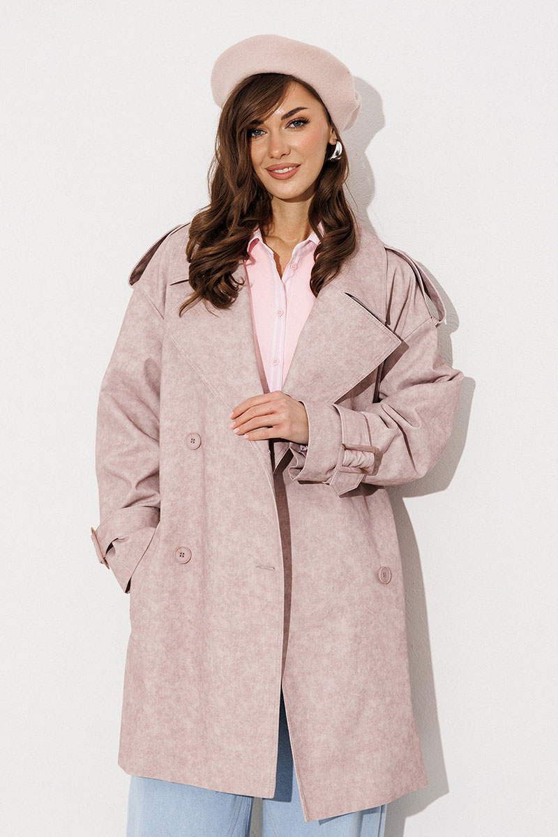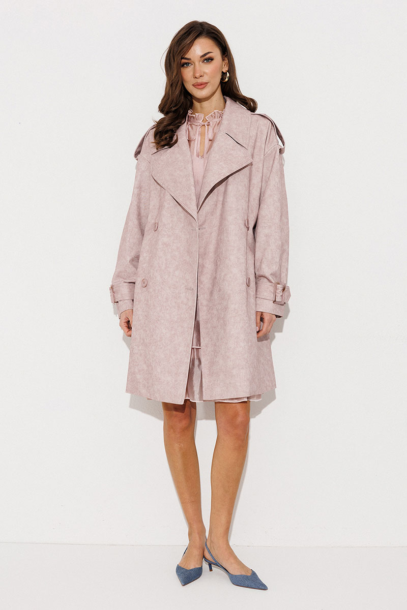 Плащ-тренчкот прямого силуэта с двубортной застежкой на петли-пуговицы, втачным двухшовным рукавом и спущенной линией плеча, по низу рукавов паты с пряжкой. Воротник пиджачного типа - отложной с лацканом. Полочка с карманом-листочкой. Спинка со средним швом и с отлетной кокеткой. По плечевому шву погон с застежкой на петлю-пуговицу. Тренчкот со съемным поясом с пряжкой. Плащ на подкладке.
