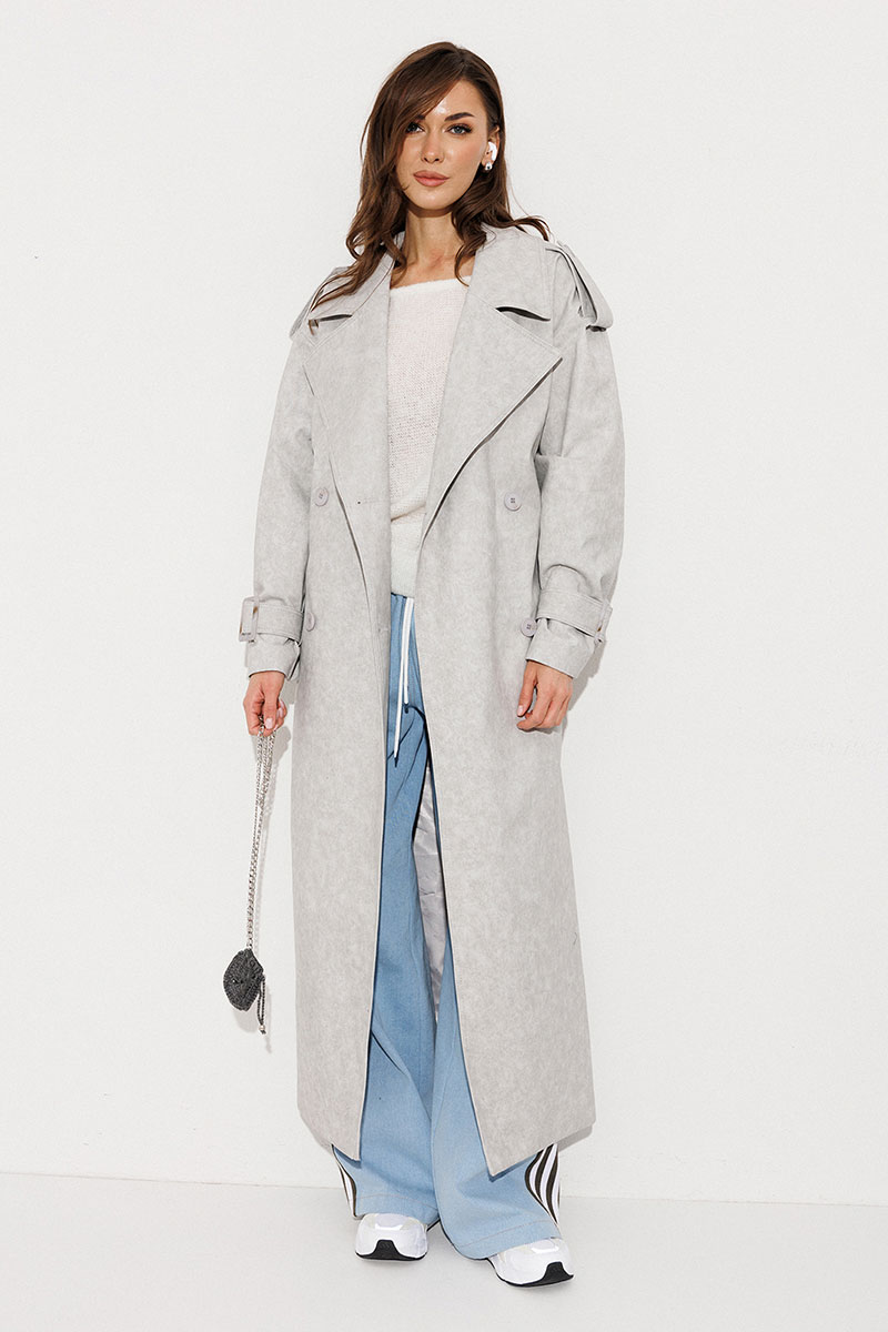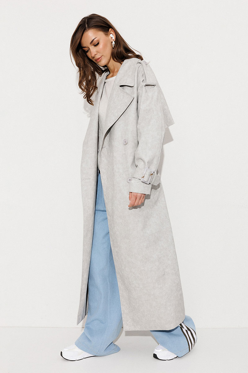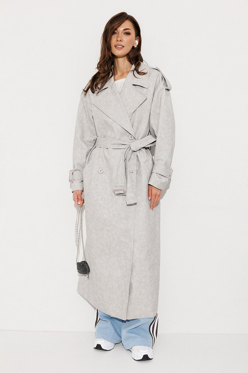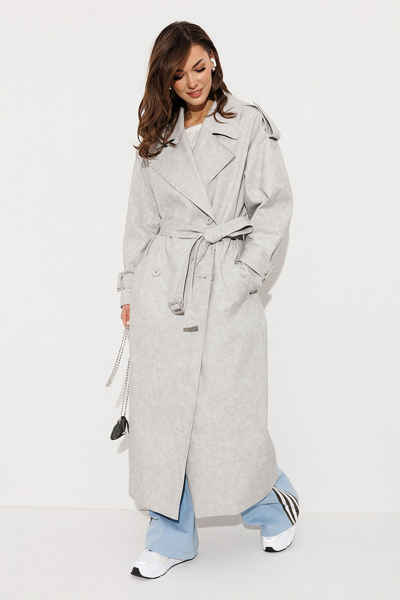 Плащ-тренчкот длинный прямого силуэта с двубортной застежкой на петли-пуговицы, втачным двух шовным рукавом и спущенной линией плеча, по низу рукавов паты с пряжкой. Воротник пиджачного типа - отложной с лацканом. Полочка с карманом-листочкой. Спинка со средним швом заканчивающимся шлицей и с отлетной кокеткой. По плечевому шву погон с застежкой на петлю-пуговицу. Тренчкот со съемным поясом с пряжкой. Плащ на подкладке.