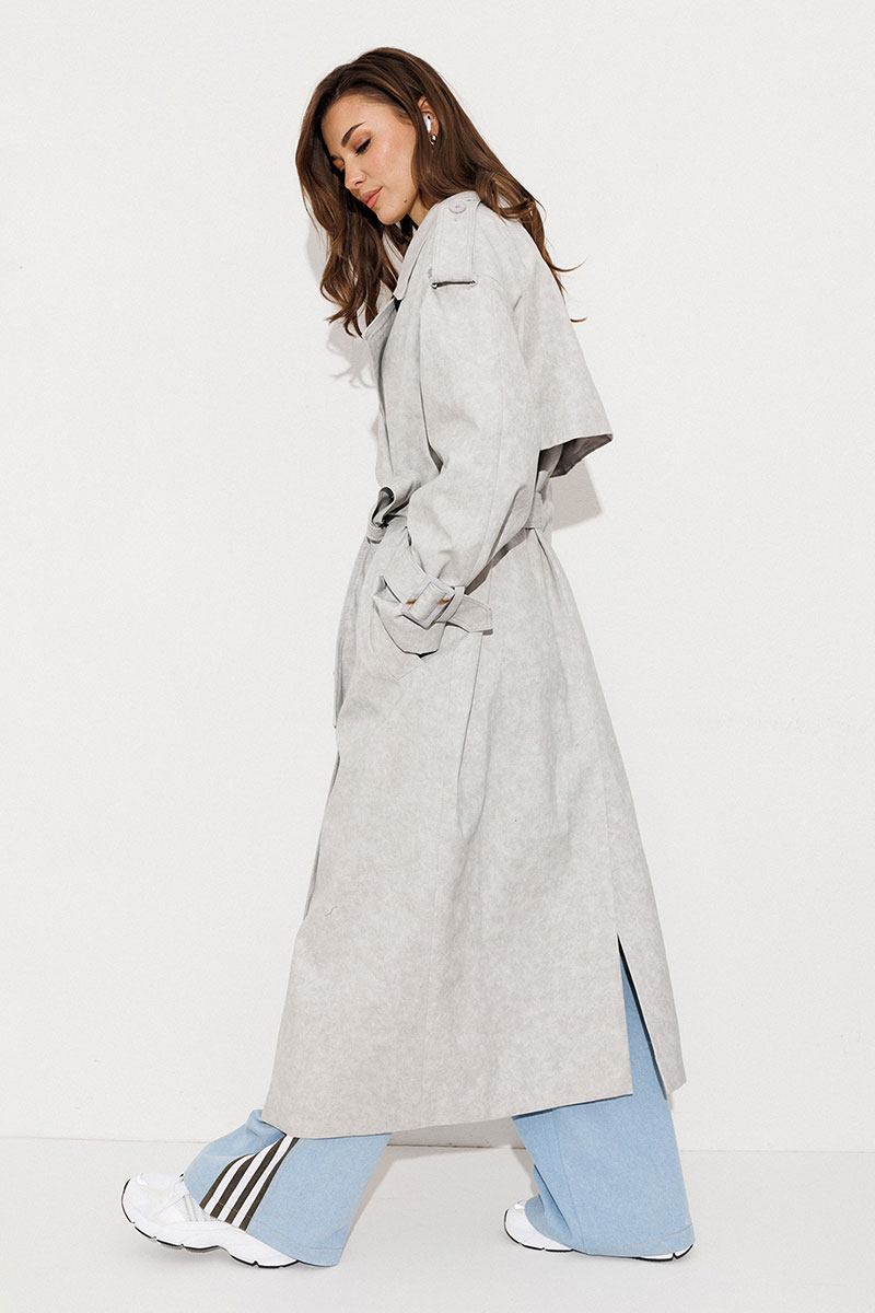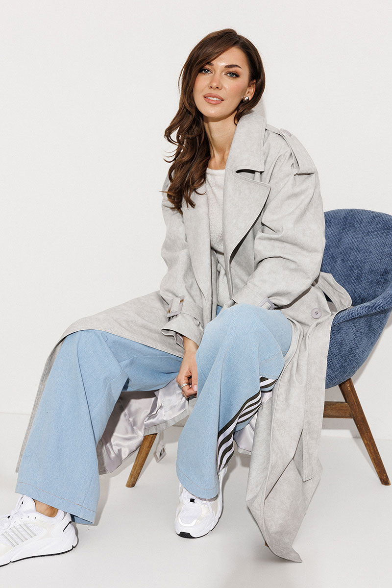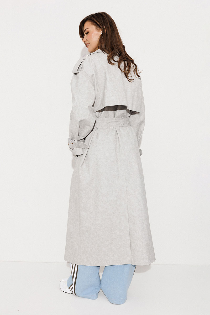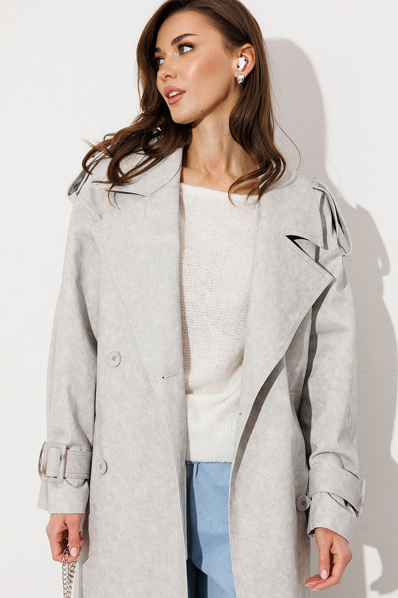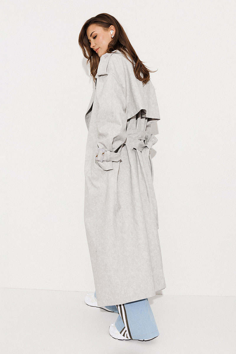 Плащ-тренчкот длинный прямого силуэта с двубортной застежкой на петли-пуговицы, втачным двух шовным рукавом и спущенной линией плеча, по низу рукавов паты с пряжкой. Воротник пиджачного типа - отложной с лацканом. Полочка с карманом-листочкой. Спинка со средним швом заканчивающимся шлицей и с отлетной кокеткой. По плечевому шву погон с застежкой на петлю-пуговицу. Тренчкот со съемным поясом с пряжкой. Плащ на подкладке.