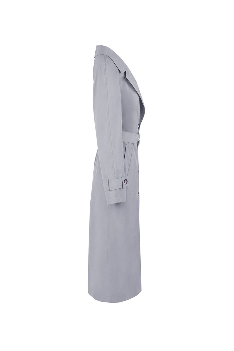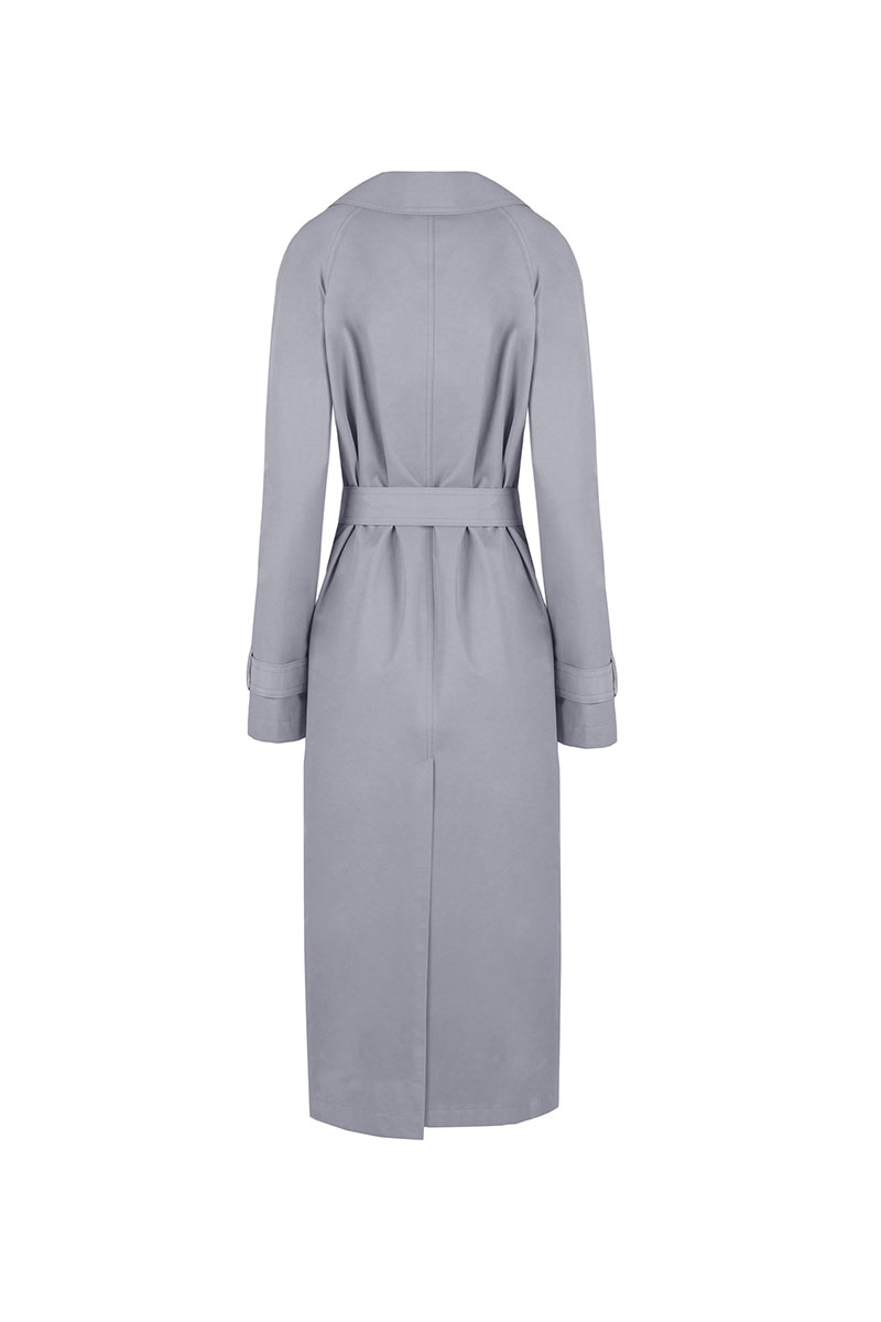 Плащ женский, однобортный, длиной ниже колена, на подкладке. Застежка на петли и пуговицы. Карман листочка. По среднему шву спинки шлица. Рукав реглан длинный, двухшовный с пристегивающейся на петлю и пуговицу патой. Воротник и лацкана отложные. В комплекте съемный пояс с пряжкой и люверсами.
