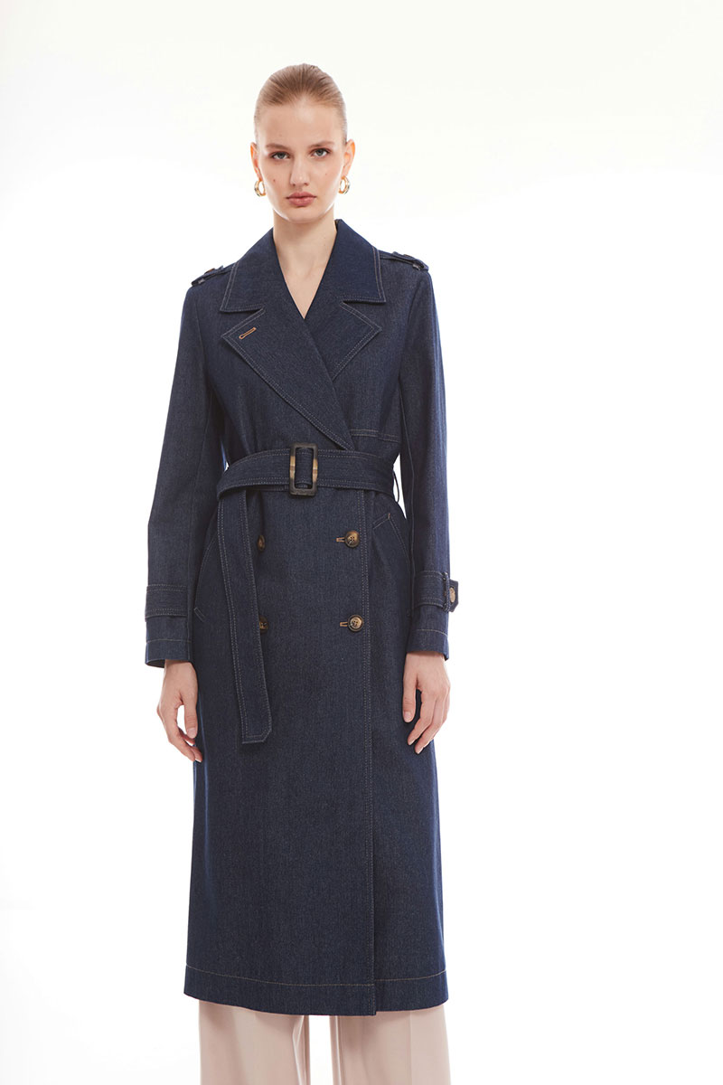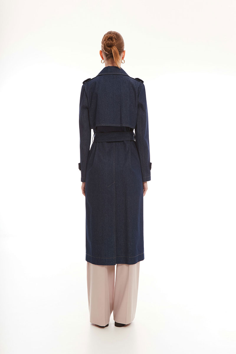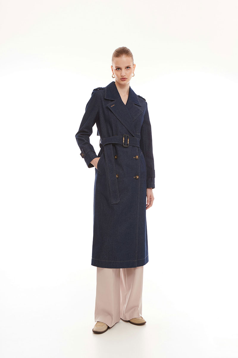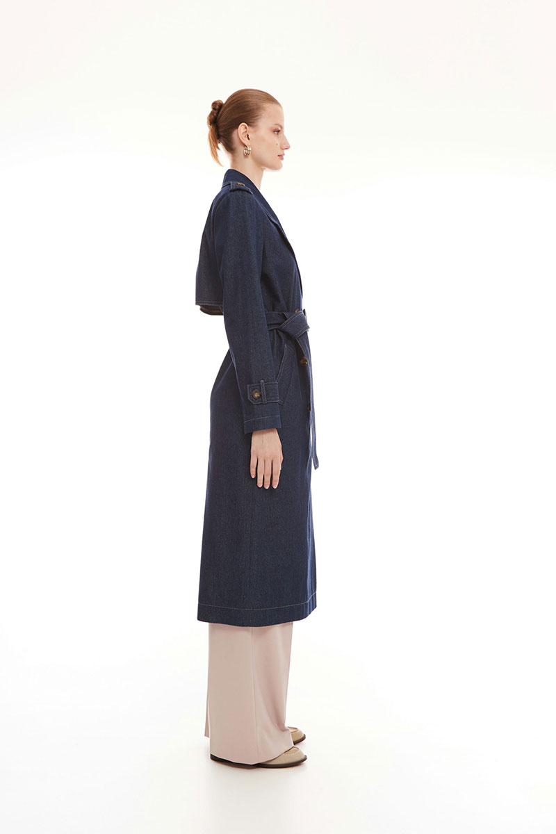 Плащ женский, двубортный, длиной «миди», без подкладки. Застежка на петли и пуговицы. На спинке отлетная кокетка, в нижней части среднего шва шлица. На переде карман- листочка с втачными концами. Рукав длинный, втачной, по низу пата пристегивающаяся на петлю и пуговицу. Воротник и лацкана отложные. По плечам погоны. В комплекте пояс.