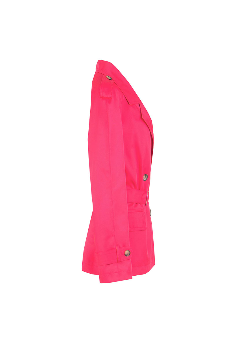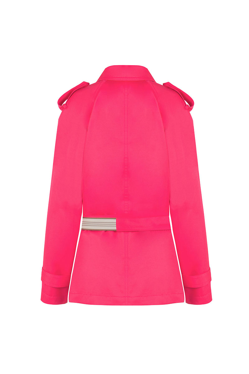 Женский плащ прямого кроя, двубортный, длиной до середины бедра, выполнен на подкладке. Передняя часть украшена карманами «в рамку» с клапанами и застежками на петли и пуговицы. По плечам расположены погоны, застегивающиеся на пуговицы. Длинные рукава реглан с манжетами, украшенными пуговицами. Воротник и лацканы отложные, придающие образу элегантность. Пояс с декоративной тесьмой и пряжкой вставляется в шлевки, подчеркивая талию и создавая завершенный силуэт.