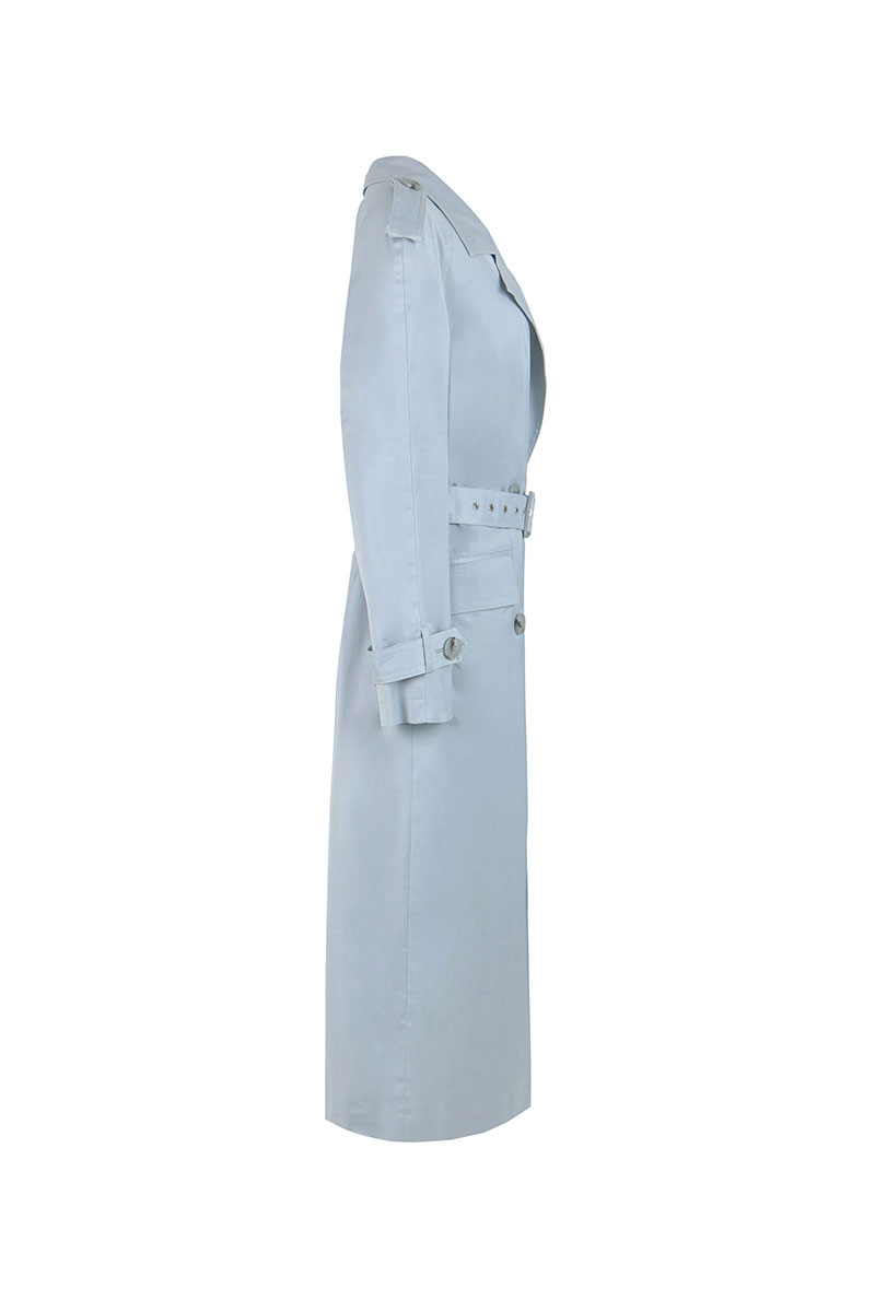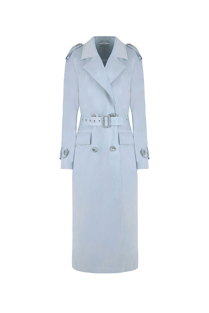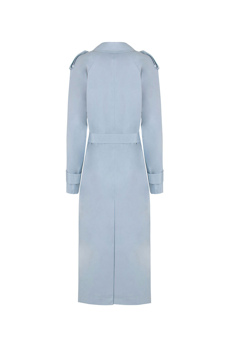 Плащ женский прямого силуэта, двубортный, длиной ниже колена, на подкладке. В нижней части среднего шва спинки шлица. На переде карманы «в рамку» с клапаном, застежка на петли и пуговицы. По плечам погоны, застегивающиеся на пуговицы. Рукава реглан, длинные, по низу паты застегивающиеся на пуговицы . Воротник и лацкана отложные Пояс с пряжкой и люверсами, вдевается в шлевки.
