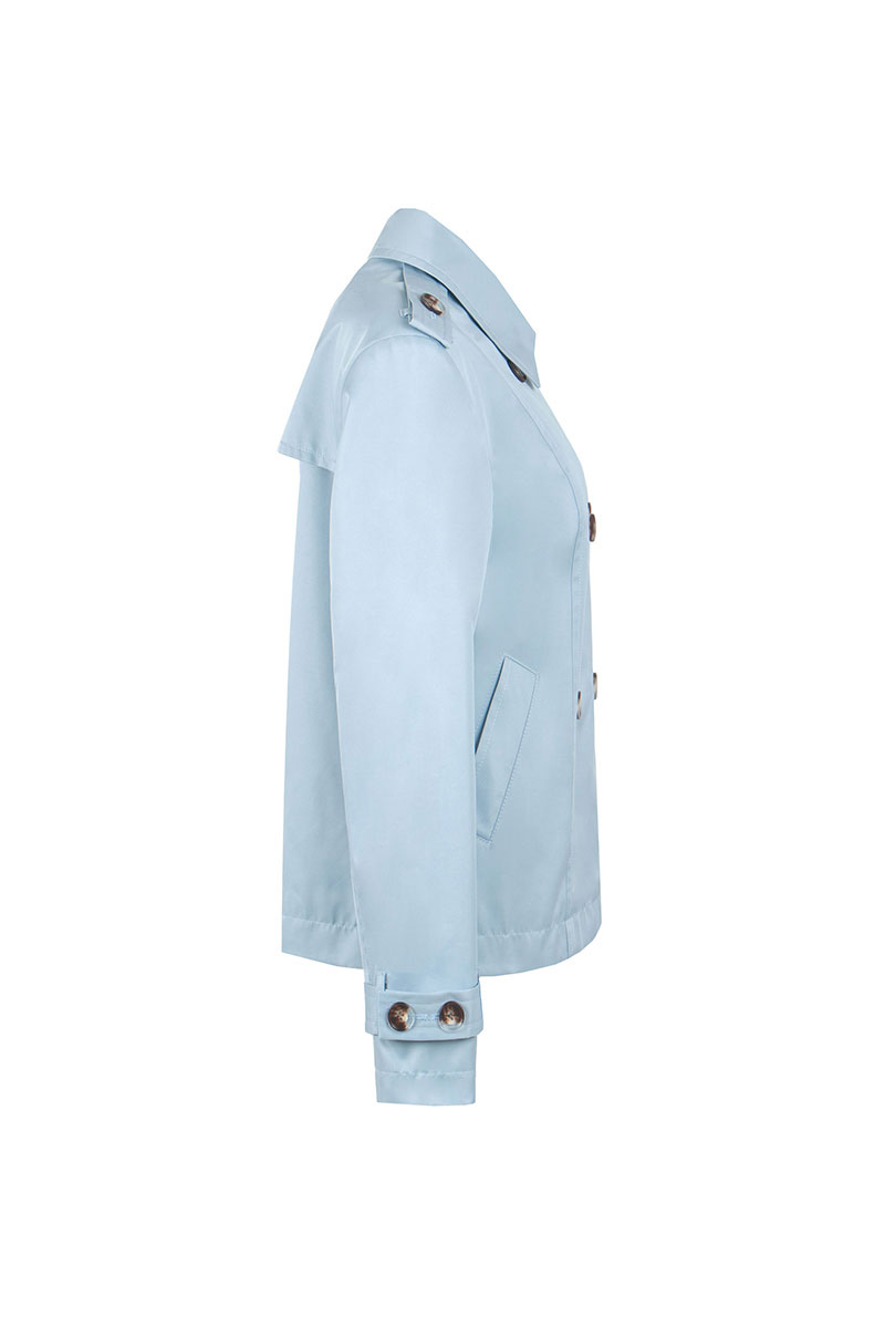 Плащ женский прямого силуэта, двубортный, короткий, на подкладке. Спинка с отлетной кокеткой, в нижней части среднего шва шлица. На переде карманы с листочкой, застежка на петли и пуговицы. На левом переде отлетная кокетка. По плечам погоны, застегивающиеся на пуговицы. Рукава втачные, длинные, по низу паты вдеты в шлевки и застегнуты на пуговицы. Воротник рубашечного типа, стойка застегивается на крючок и петлю.