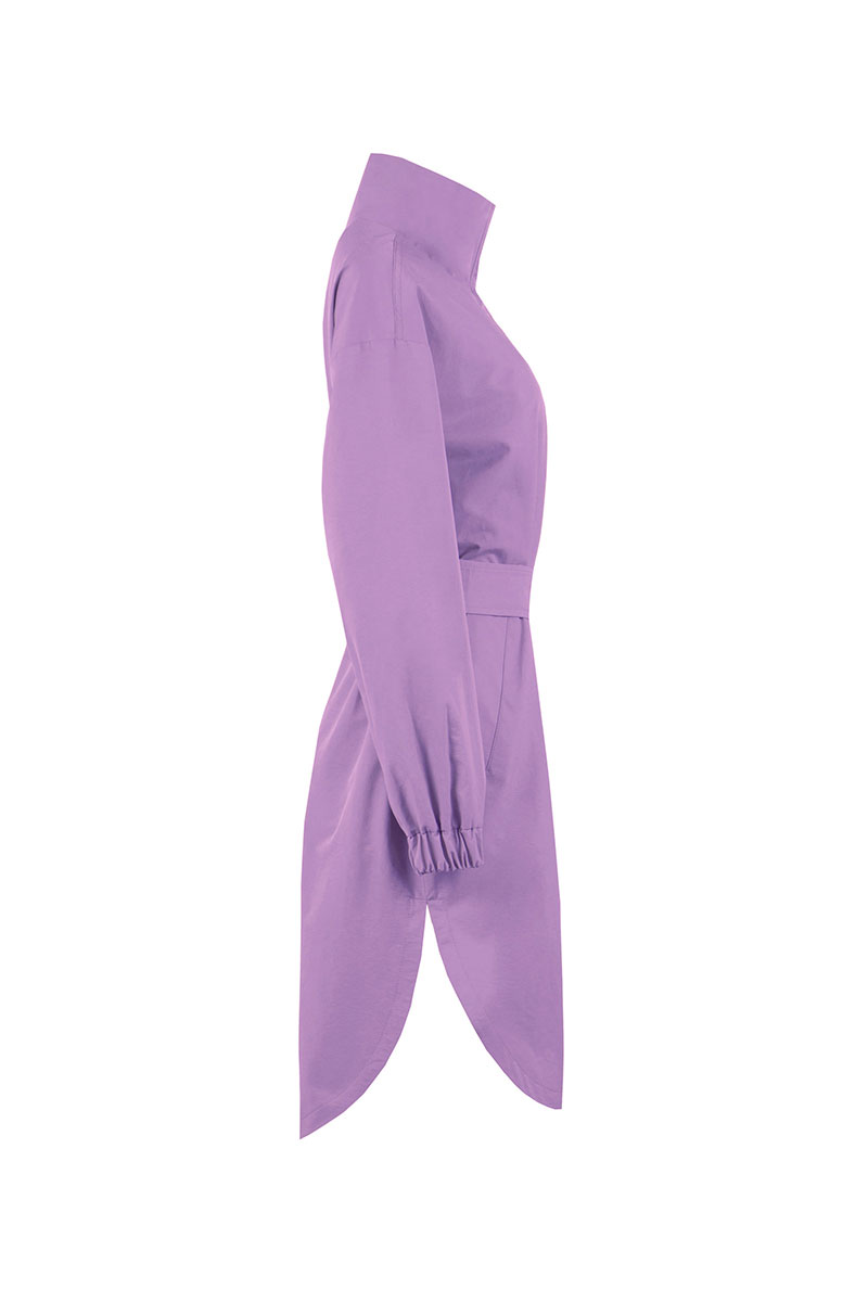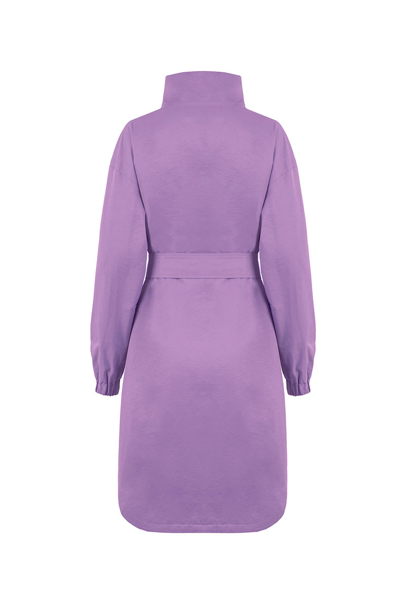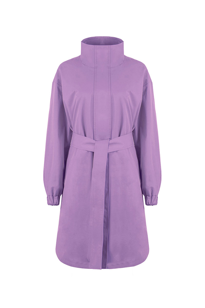 Плащ женский, длиной выше колена, на подкладке. Застежка на металлическую молнию и планку с кнопками. Перед с карманами: «листочка с втачными концами». По боковым швам фигурные разрезы. Рукав длинный, одношовный, по низу притачная манжета с резинкой. Плечо спущено. Воротник стойка. В комплекте- пояс.