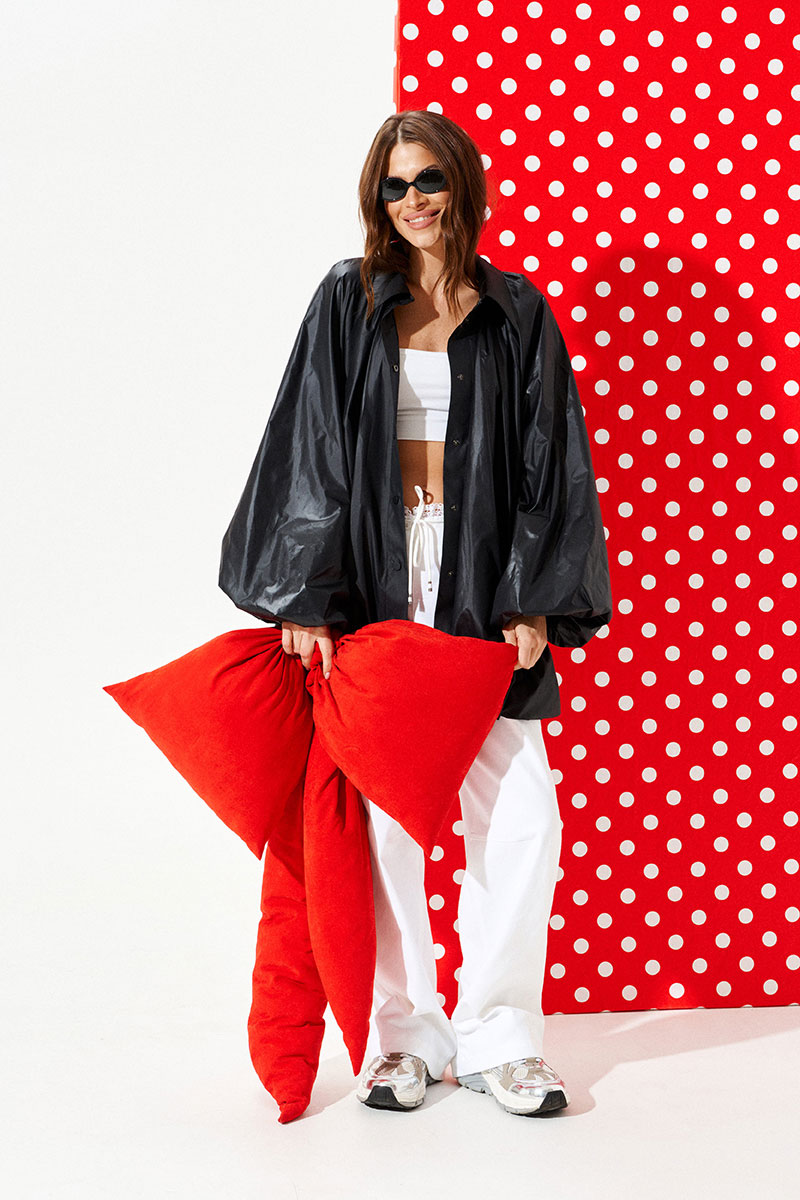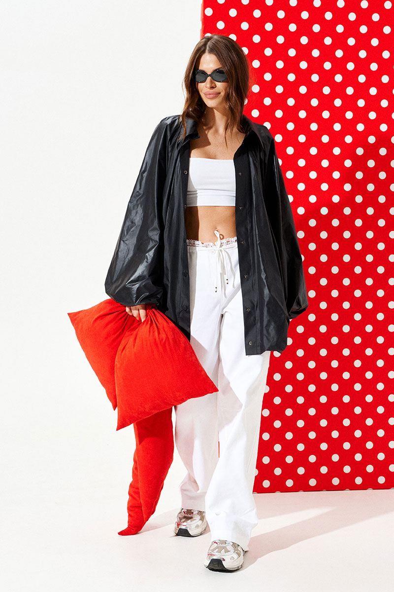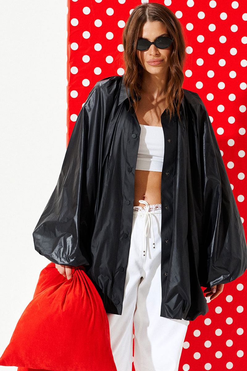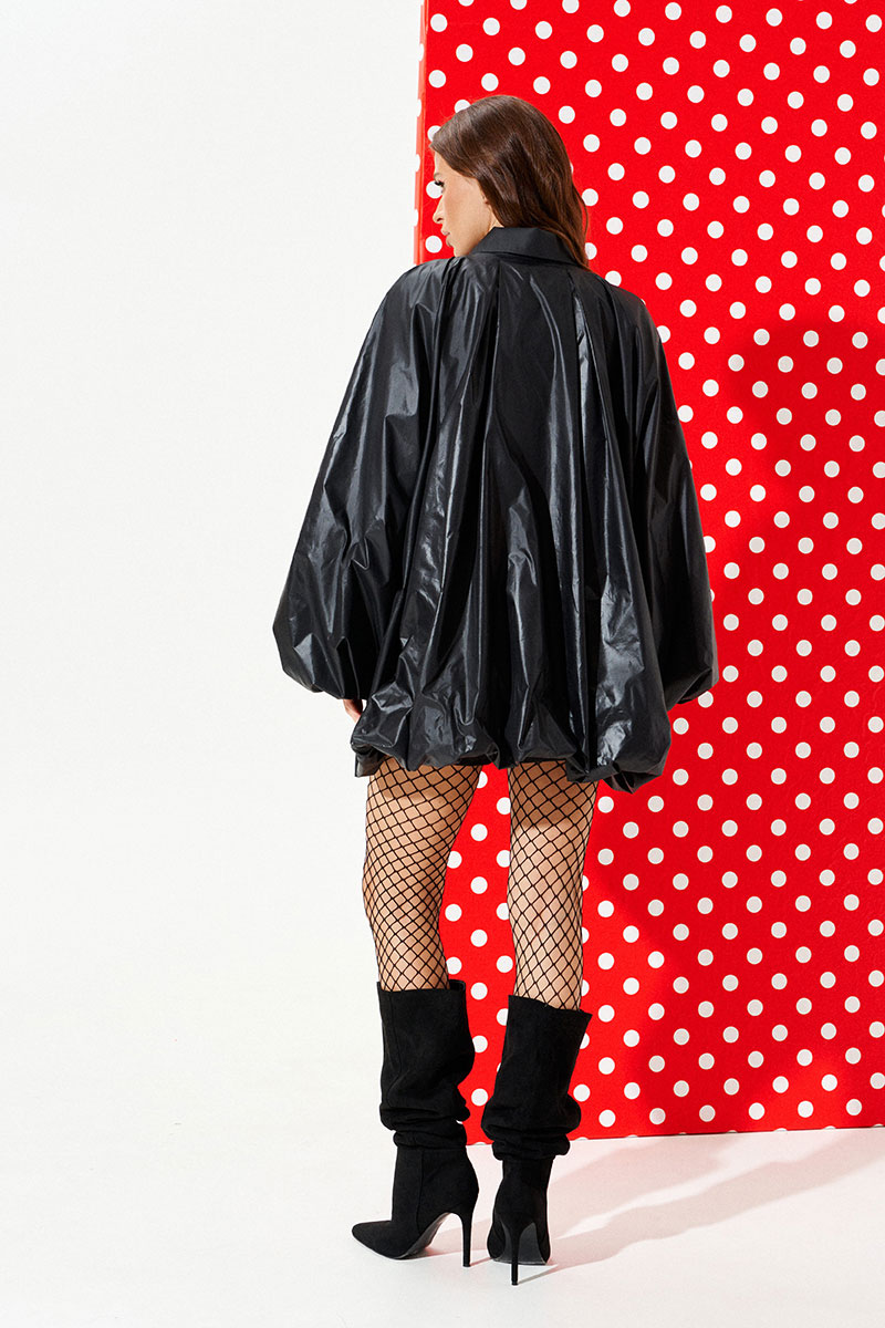 Плащ из курточно-плащевой ткани свободного объема, расширенный к низу, с центральной застежкой на кнопки, отложным воротником, на подкладке. На деталях переда расположены прорезные карманы с листочкой. Спинка цельная. Детали переда, спинка и рукав со встречными складками. Рукав покроя реглан. Нижний срез изделия и рукавов обработан эластичной тесьмой.