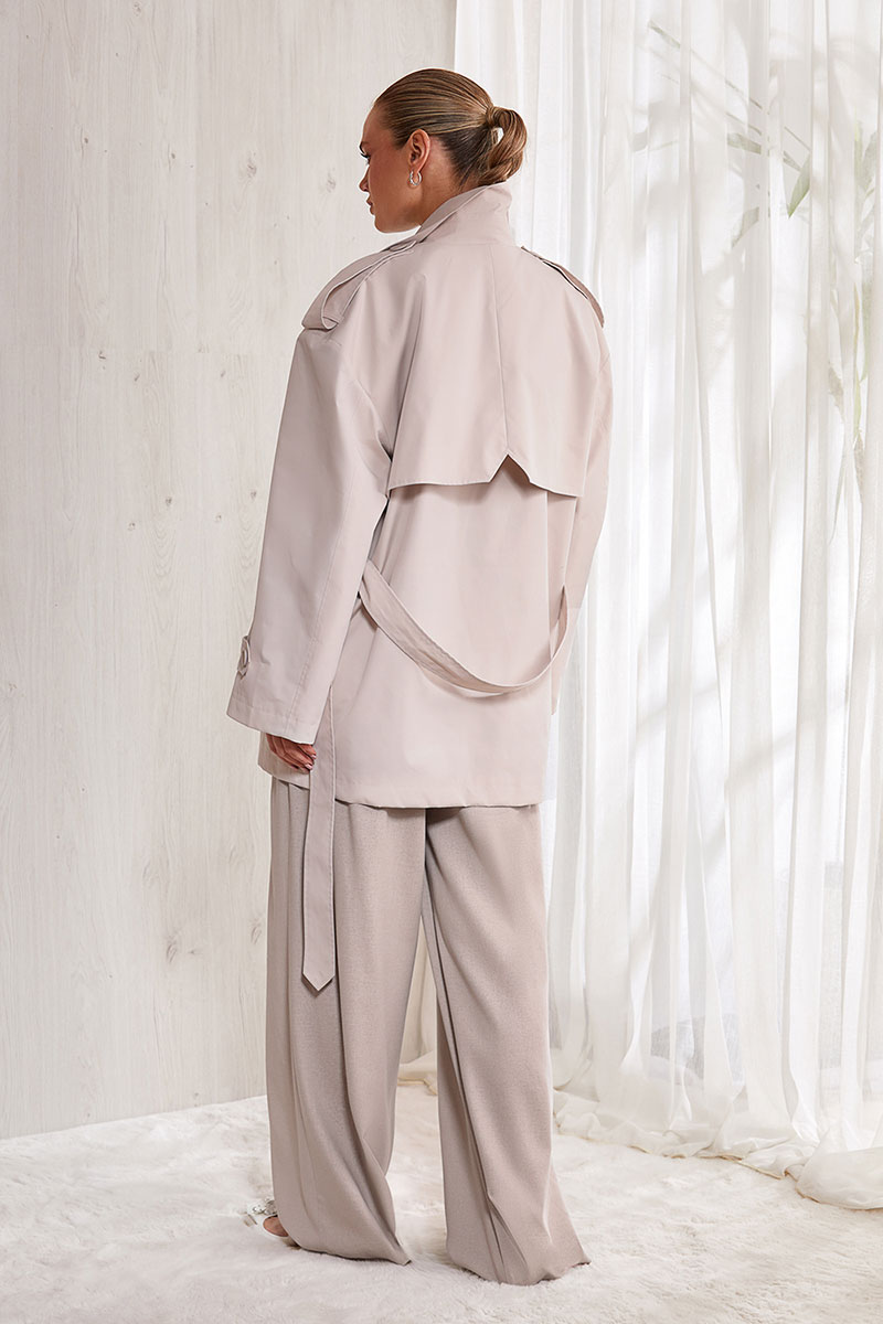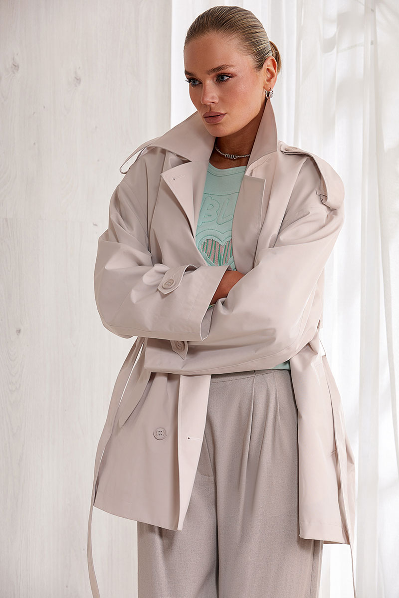 Плащ прямого силуэта длиной до середины бедра с двубортной застежкой в два ряда пуговиц. На передних половинах отлетные кокетки и прорезные карманы с клапанами. Спинка прямая без среднего шва, с фигурной отлетной кокеткой. Плечо спущено. На плечах декоративные паты. Рукав прямой, длинный, низ рукава также с декоративной патой. Воротник стояче-отложной.
