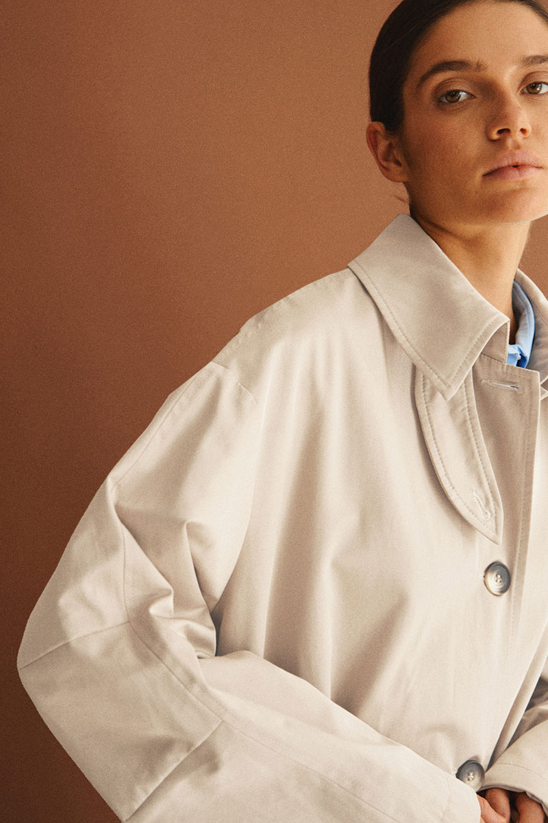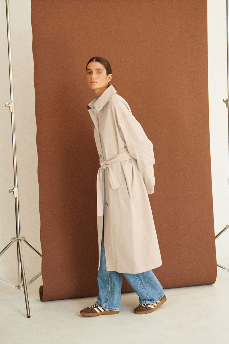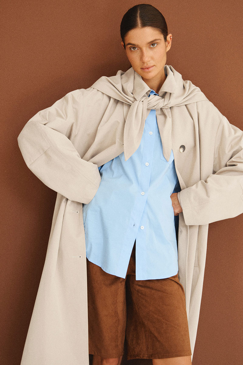 Базовый тренч прямого кроя, слегка расширяется к низу. Спущенная линия плеча. Ткань обработана водоотталкивающей и грязеотталкивающей отделкой. В комплекте идет съемный пояс и косынка.
