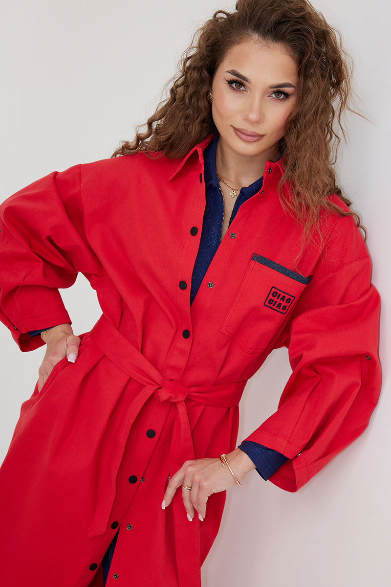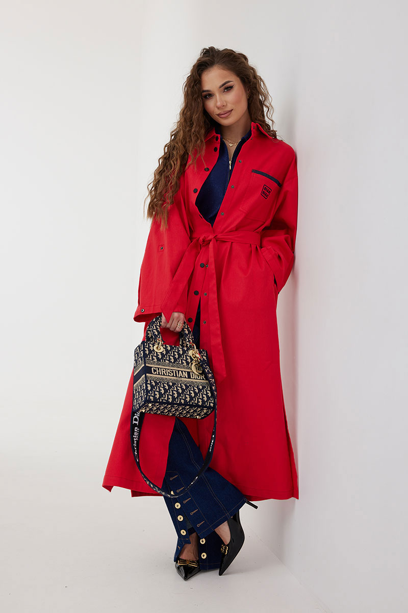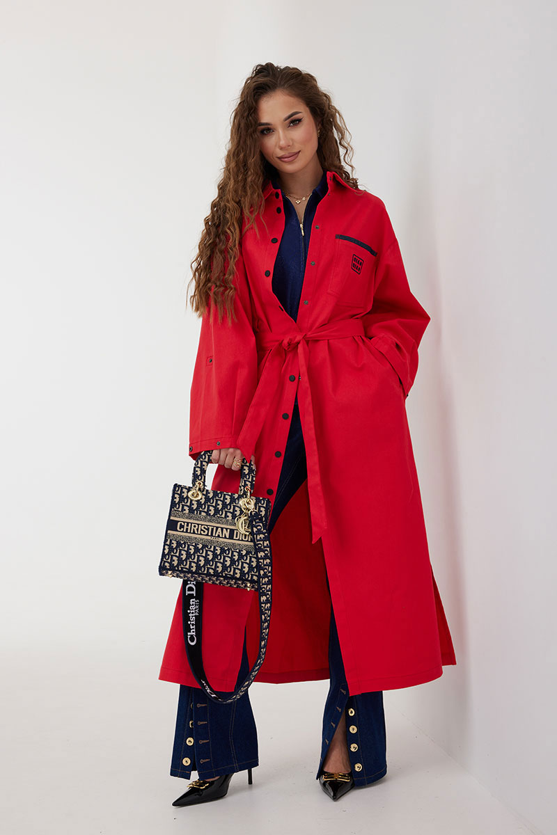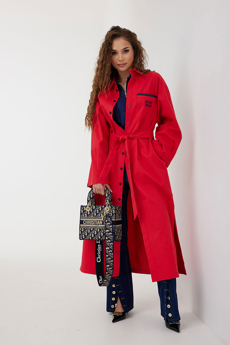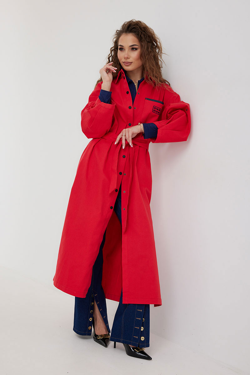 Плащ женский, свободного силуэта без подкладки. Воротник отложного типа. Рукав широкий спущенный с патой. В боковых швах карманы и высокие разрезы. Застежка на кнопки. По левой части переда накладной карман с вышивкой.