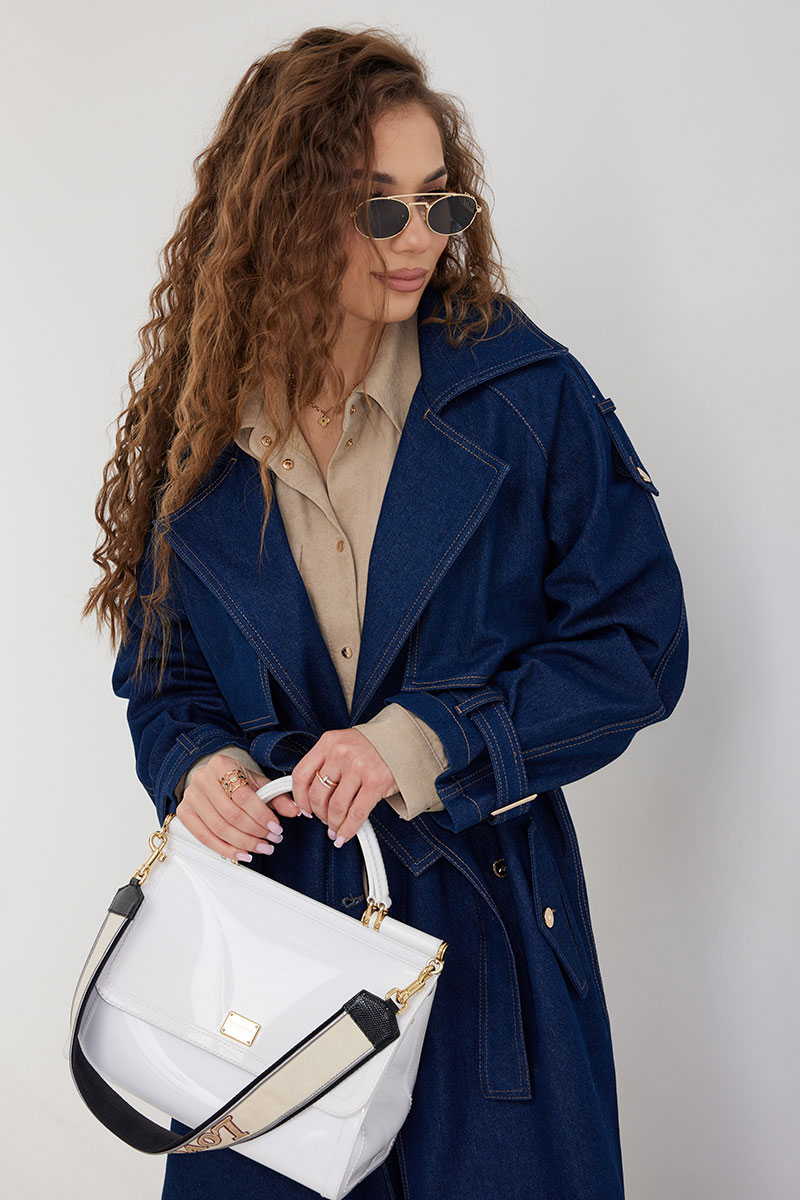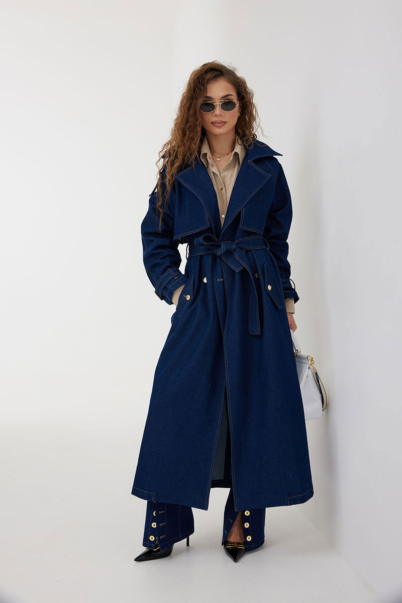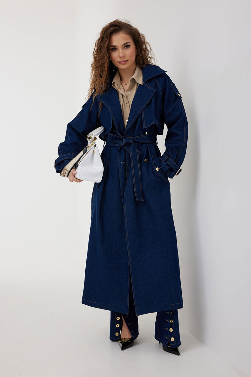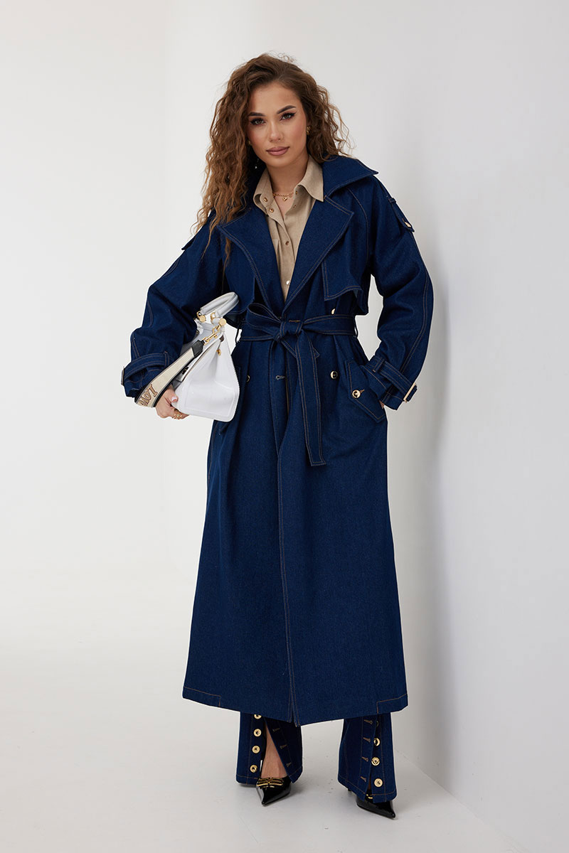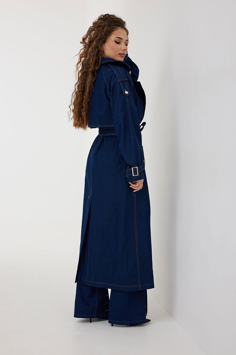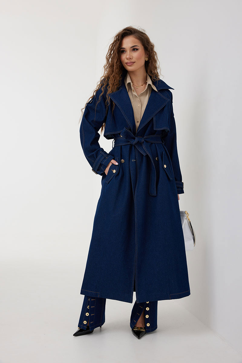 Плащ свободной формы из джинсовой ткани. Длина макси. Застёжка двубортная на петли и пуговицы-болты. По переду и спинке отлетные кокетки. Спинка с высокой шлицей. Воротник стояче-отложной. По переду прорезной карман с клапаном на петлю и пуговицу-болт. Рукав-реглан прямой с погоном на петлю и пуговицу-болт. По