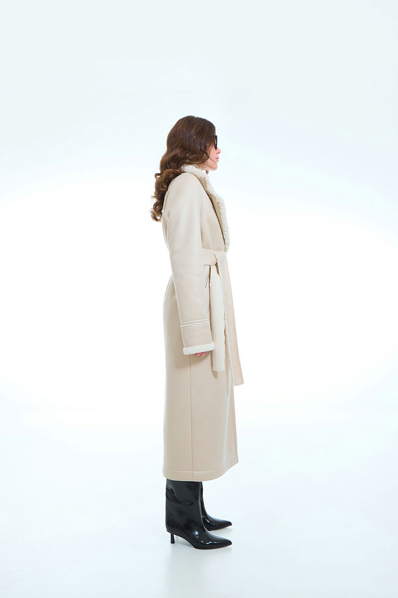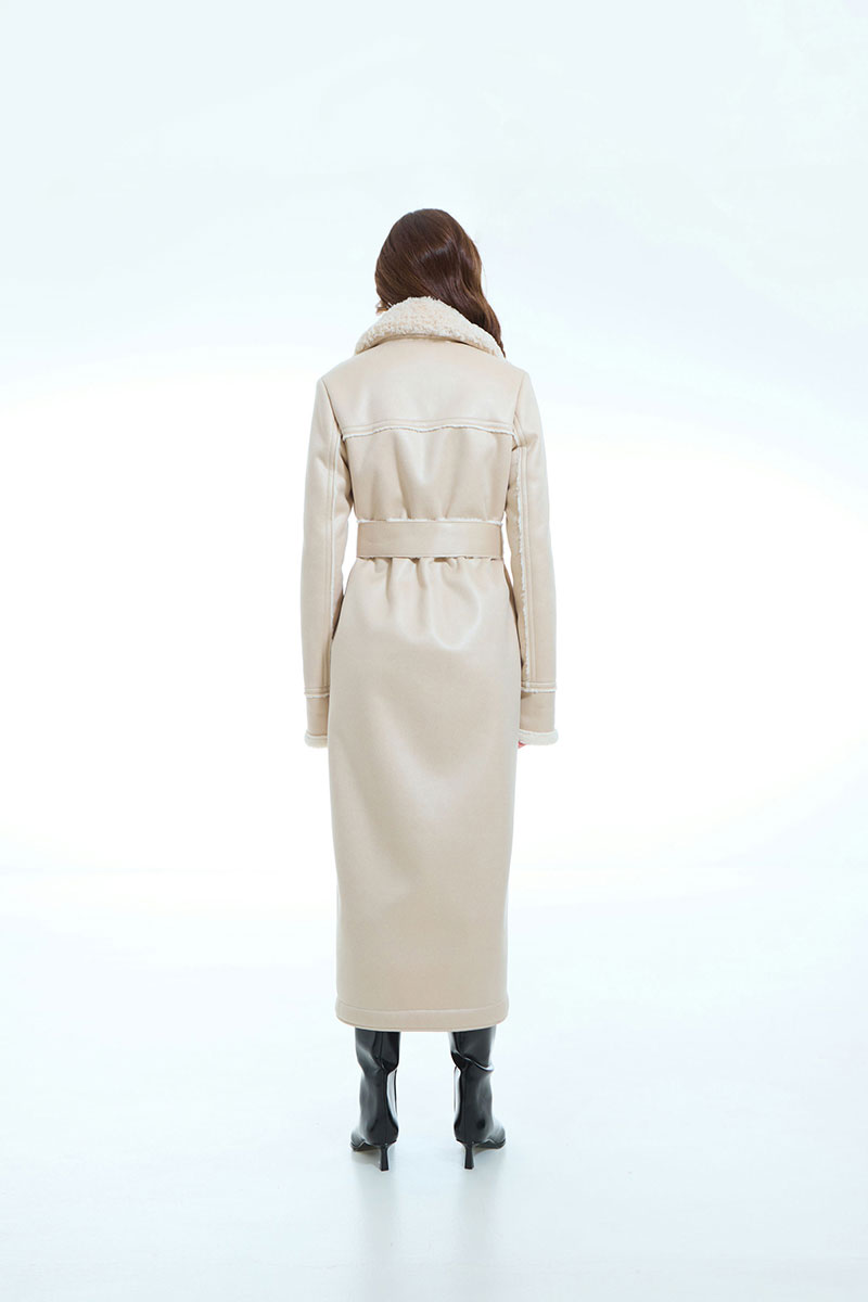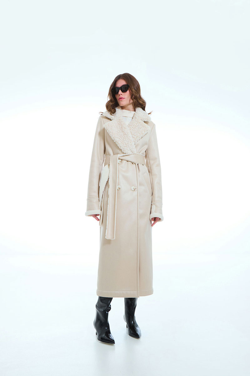 Модель украшена эффектными отложным воротником и лацканами из отделочного меха, которые придают образу благородную мягкость и утончённую роскошь. Втачной рукав завершается аккуратным отворотом манжеты — деталь, добавляющая изделию структурированности и изысканности.
