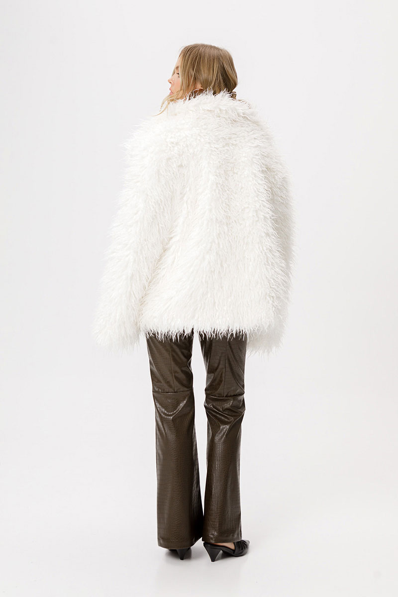 Шуба свободного покроя из длинноворсового меха под ламу.