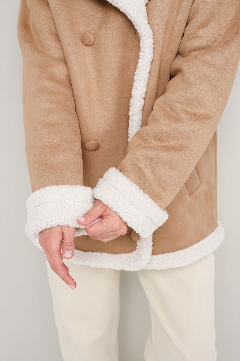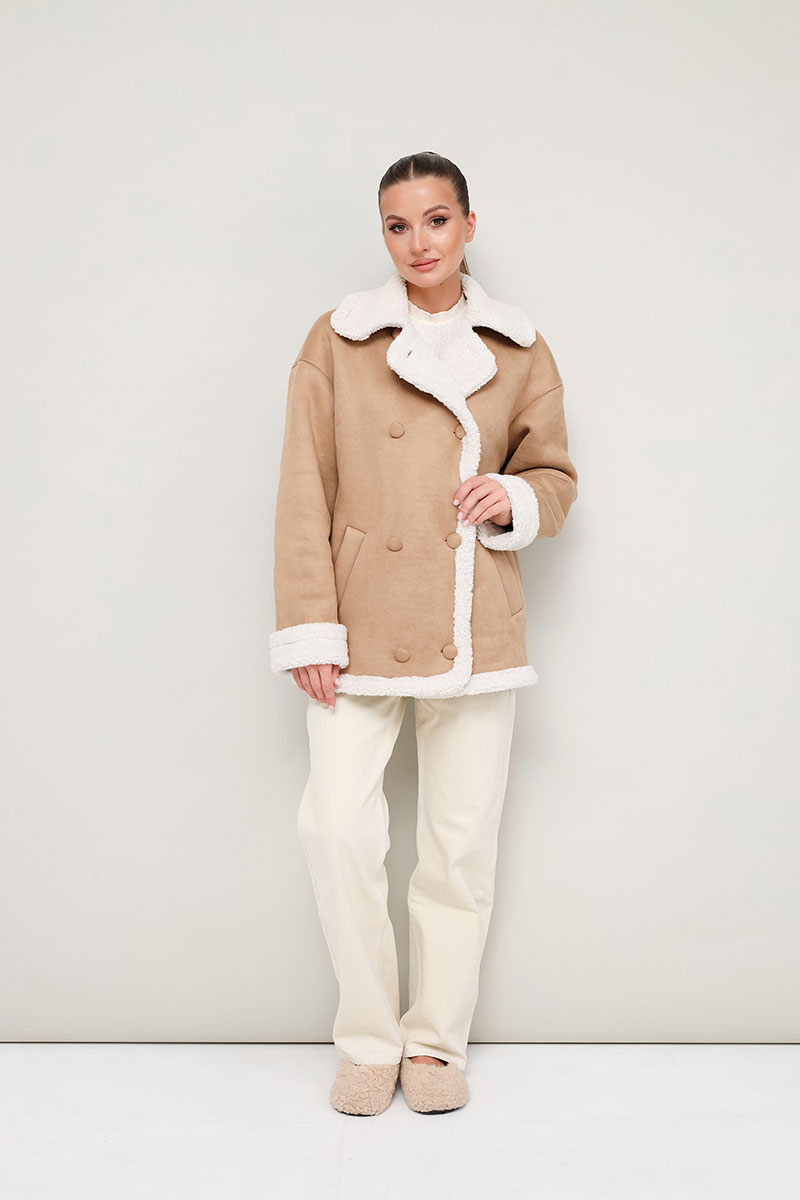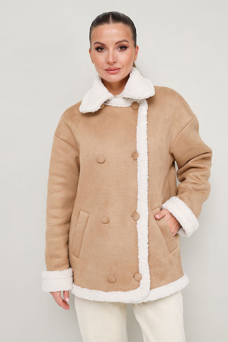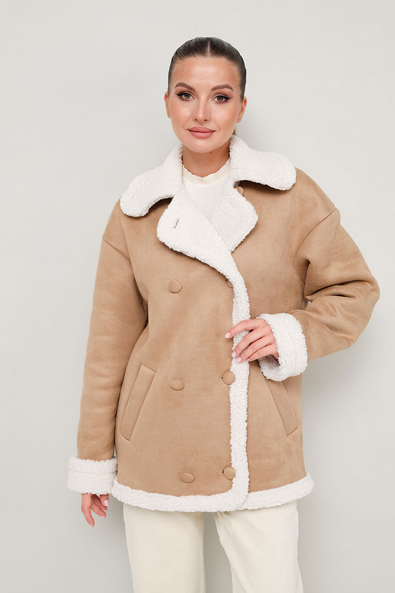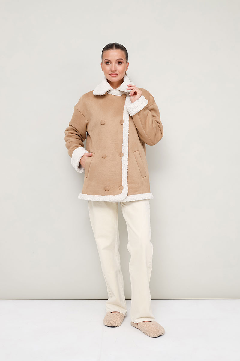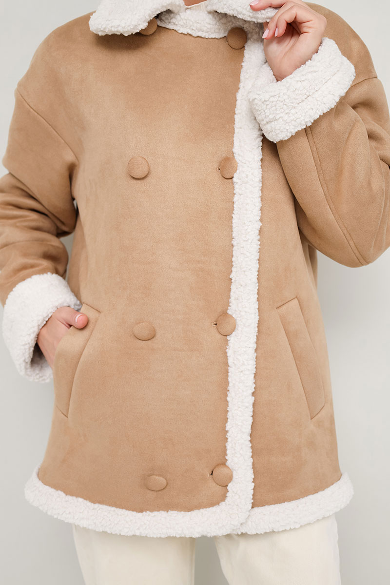 Дубленка декорирована искусственным мехом, который придает образу благородную мягкость и уют.