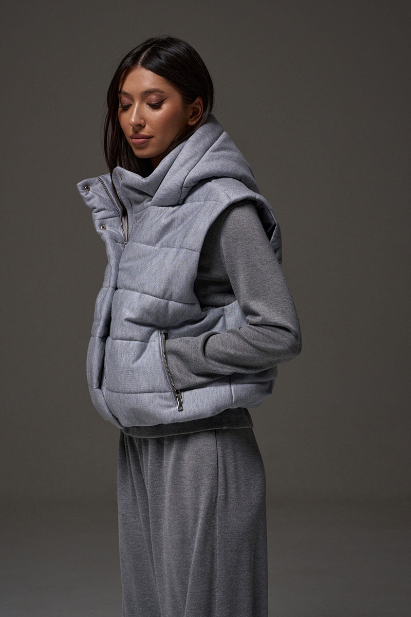 Жилет укороченный, выполнен из стеганной трикотажной ткани серого цвета. Характеристика: Жилет укороченный, выполнен из стеганной трикотажной ткани графитового цвета. Характеристика: жилет А-силуэта, вортник стойка, капюшон цельный с жилетом, центральная застежка на молнию, скрывается под планкой на кнопках, боковые карманы на молнии, по низу изделия резинка с фиксаторами, брендированный подклад, спинка цельнокройная.