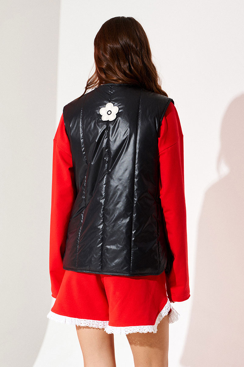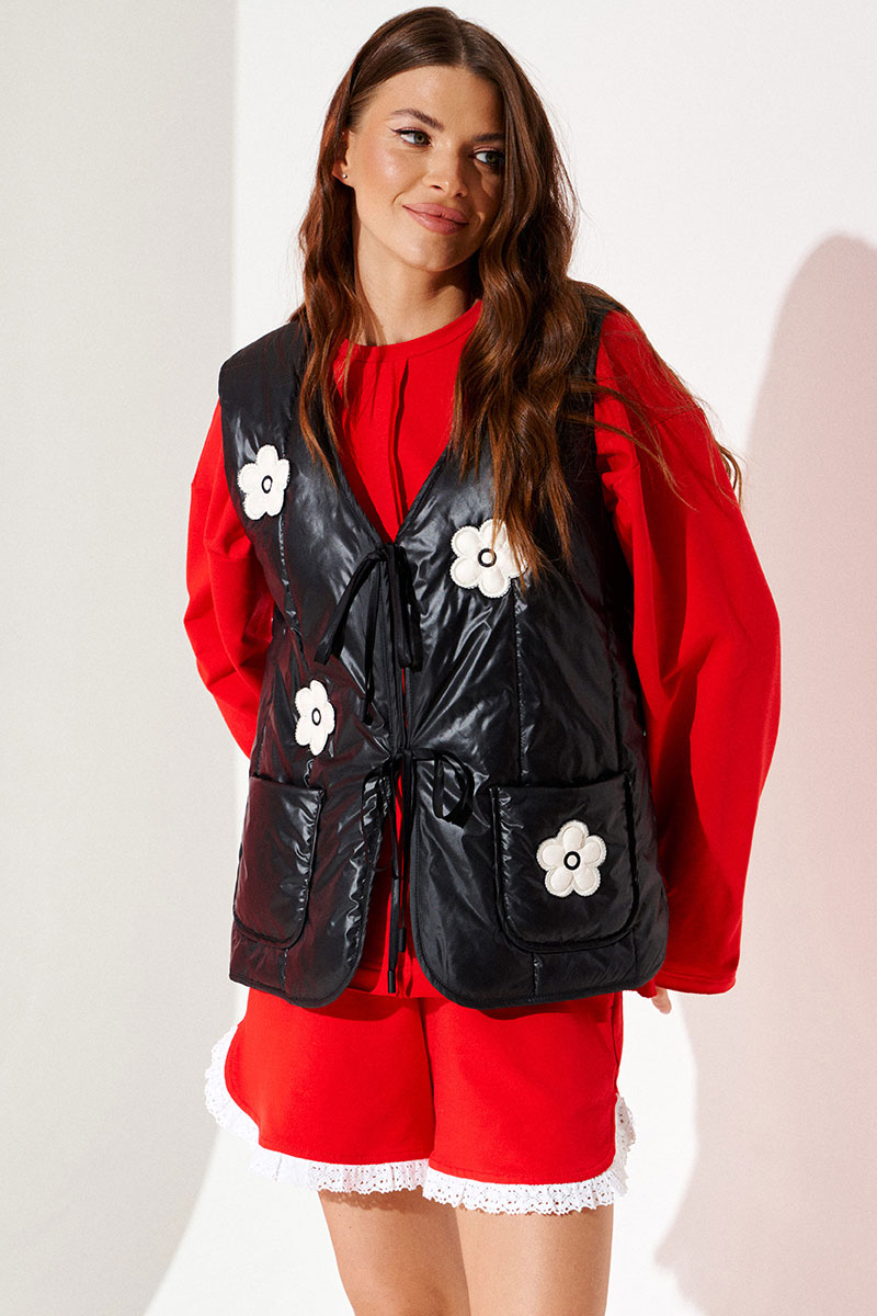 Жилетка из плащевой стеганой ткани с утеплителем изософт 150г/м2, прямая, свободного объема, с V-образным вырезом горловины. Детали переда с накладными карманами и вышивками-аппликациями «Цветы». Спинка цельная. Застежка центральная на завязках. Горловина, борт, рукава и низ жилетки обработаны окантовочной бейкой.