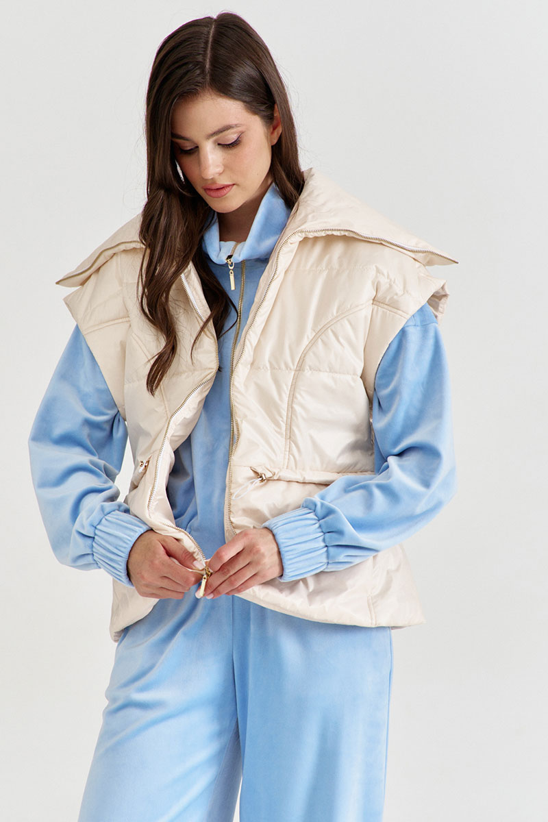 Жилетка полуприлегающего силуэта, длиной чуть выше линии бедер. Жилетка отрезная по линии талии. Лиф спинки и переда с рельефами от пройм до талии. Баска с фигурными подрезами, по переду обработаны карманы. По талии вставлена кулиса, в которую протянута резинка с фиксаторами. По горловине объемная стойка. Линия плеча спущена. по переду застёжка на декоративную тесьму-«молнию». Жилетка на подкладке и утеплена синтепоном.