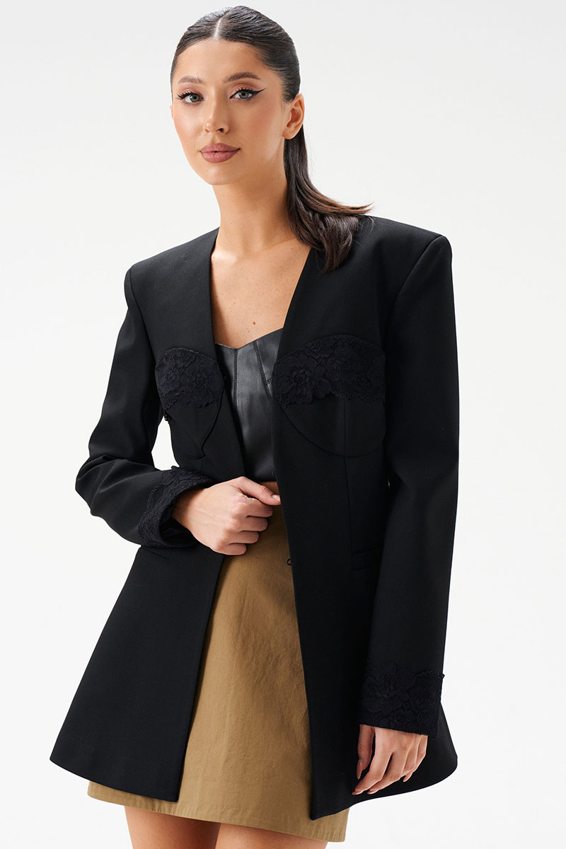 Жакет прилегающего силуэта без воротника выполнен из костюмной ткани черного цвета. Характеристики: прилегающий силуэт, без воротника, подплечники, подкладка, застежка центральная на крючки, рукав втачной, по низу рукава декоративные элементы из гипюра, по переду прорезные карманы без клапана, на линии груди декоротивные чашечки с элементами кружева.