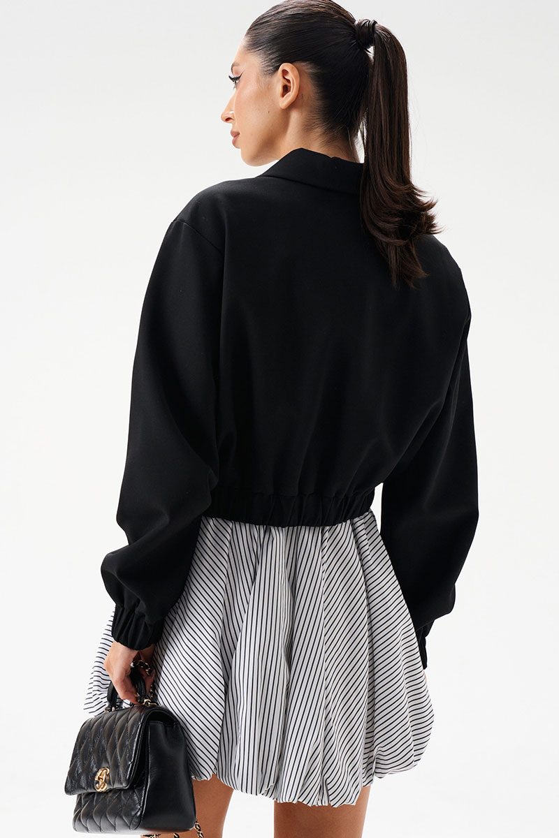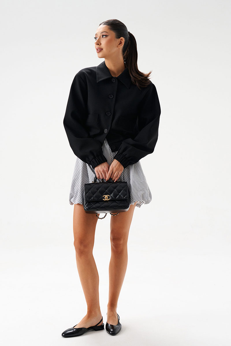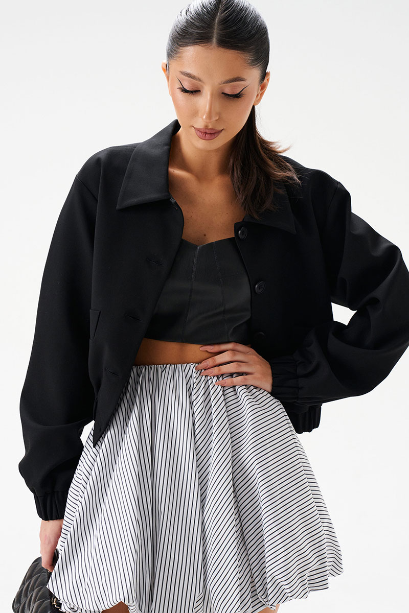 Стильный укороченный жакет выполнен из черной ткани. Укороченный жакет - модный и стильный элемент в гардеробе, который придаст индивидуальность Вашим повседневным образам. Характеристики: укороченный, подкладка, отложной воротник, застежка центральная на пуговички, рукав втачной, по переду прорезные кармашки, низ рукава и низ изделия эластичные на резинке.