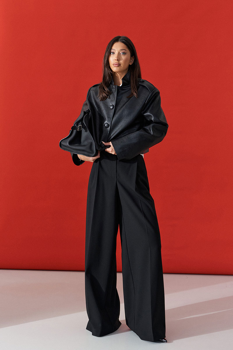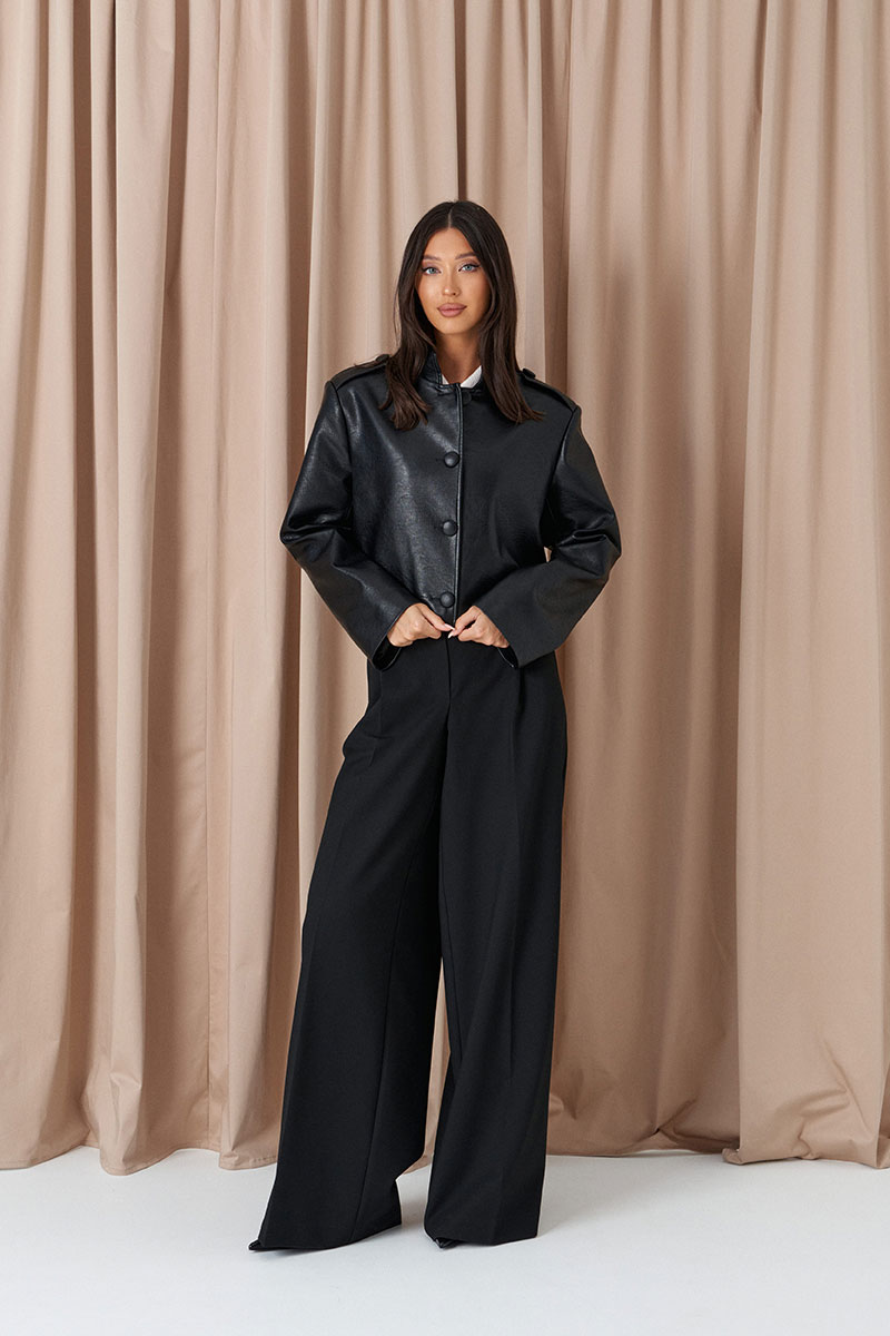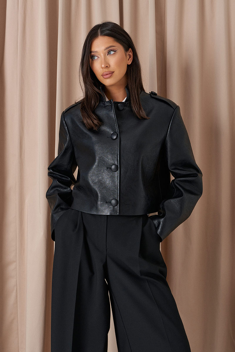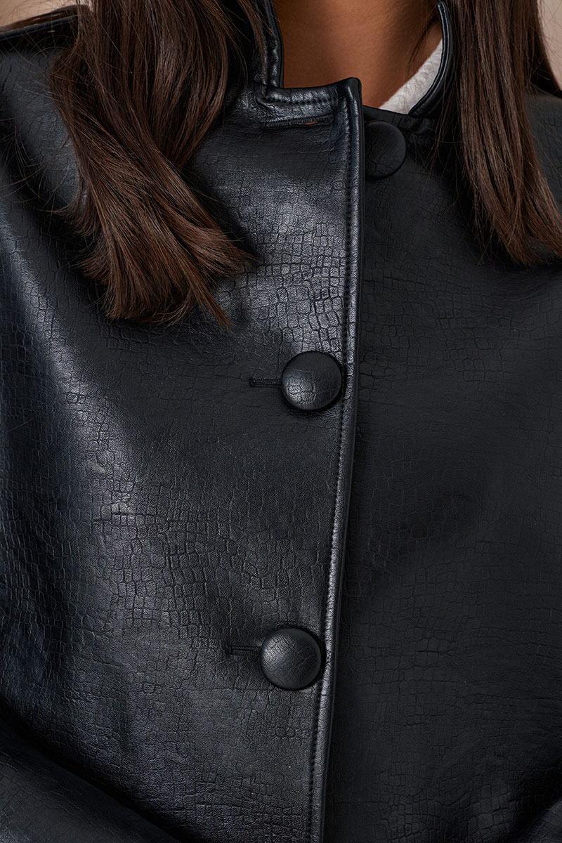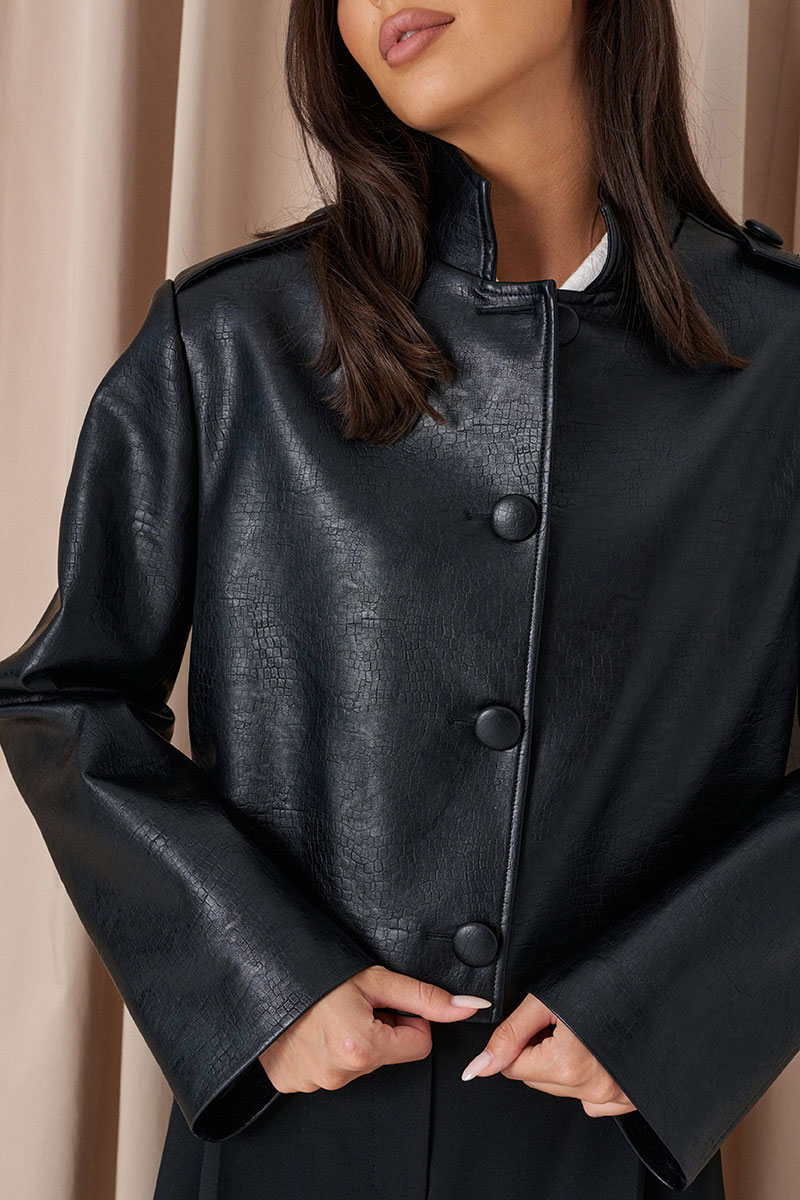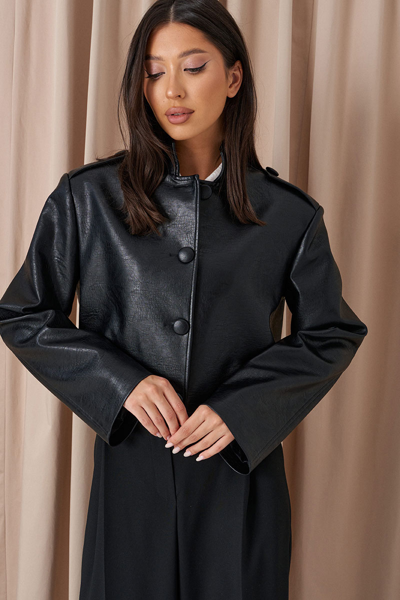 Жакет прямого свободного кроя, выполнен из экокожи черного цвета с теснением. Характеристики: горловина стойка, застежка центральнаяна петли пуговицы,рукав прямой, по плечевому шву пата на пуговице.