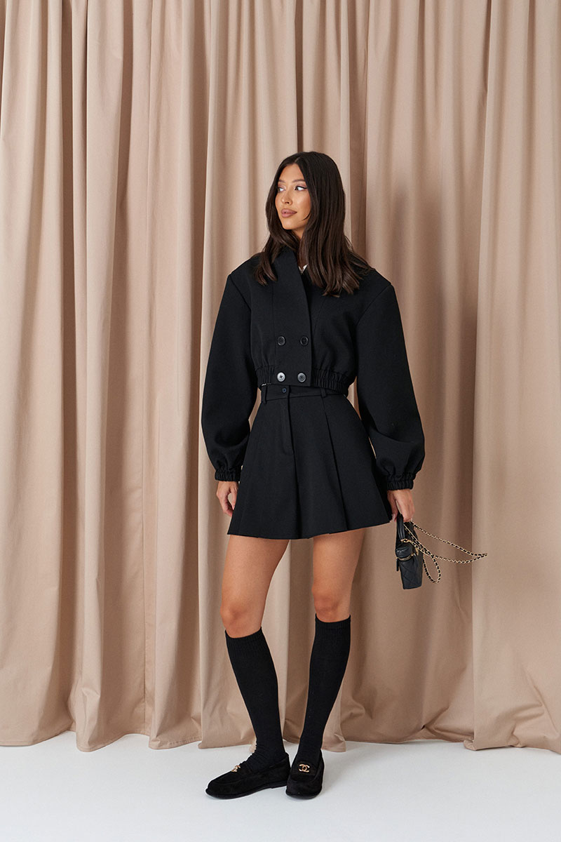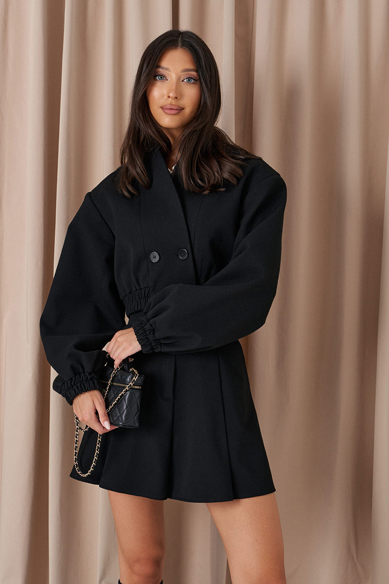 Укороченный жакет выполнен из костюмной ткани черного цвета. Воротник-стойка переходяший в V-образный вырез. Центральная застежка на пуговицах. Нижний край изделия на резинке. Рукав втачной, свободного кроя, манжета на резинке, подпелчники. Брендированная подкладка.