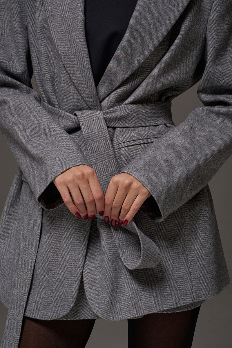 Жакет прямого свободного кроя. Выполнен из шерстяной (смесовой) ткани серого цвета. Характеристика: подкладка, воротник отложной с лацканами, рукав втачной и чуть спущен, по переду карманы с клапанами, застёжка центральная - пуговицы, в среднем шве заднего полотна шлица (29,5 см). В комплекте пояс из ткани основного изделия.