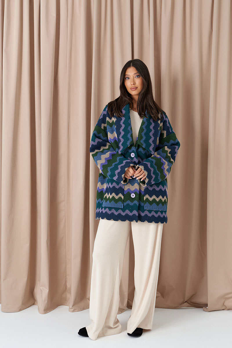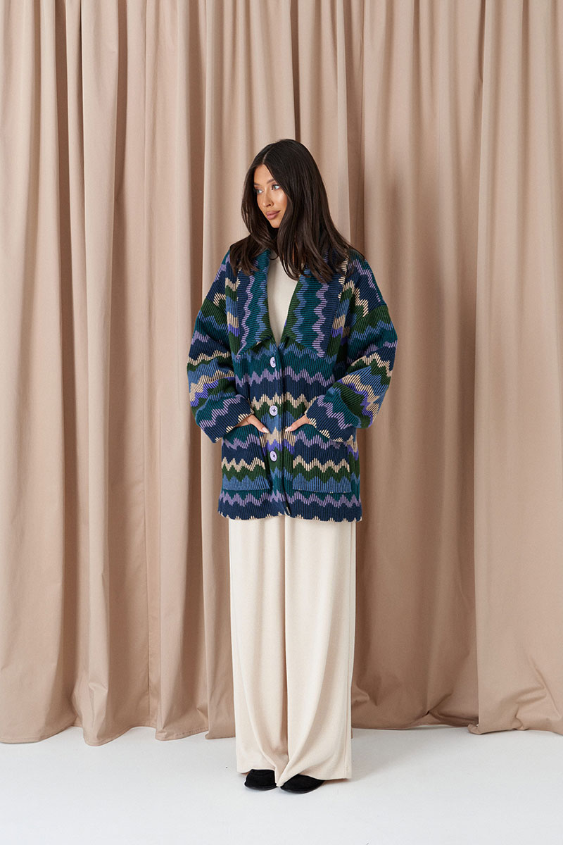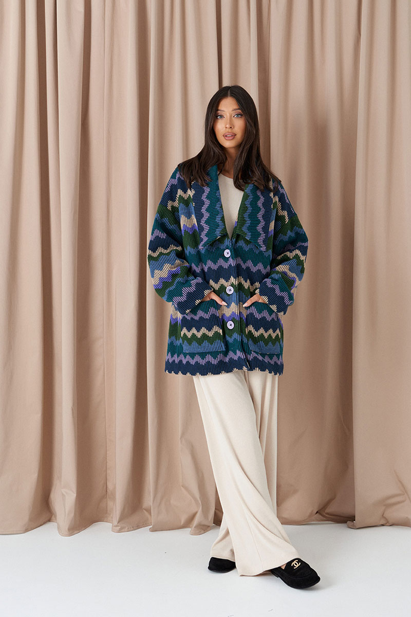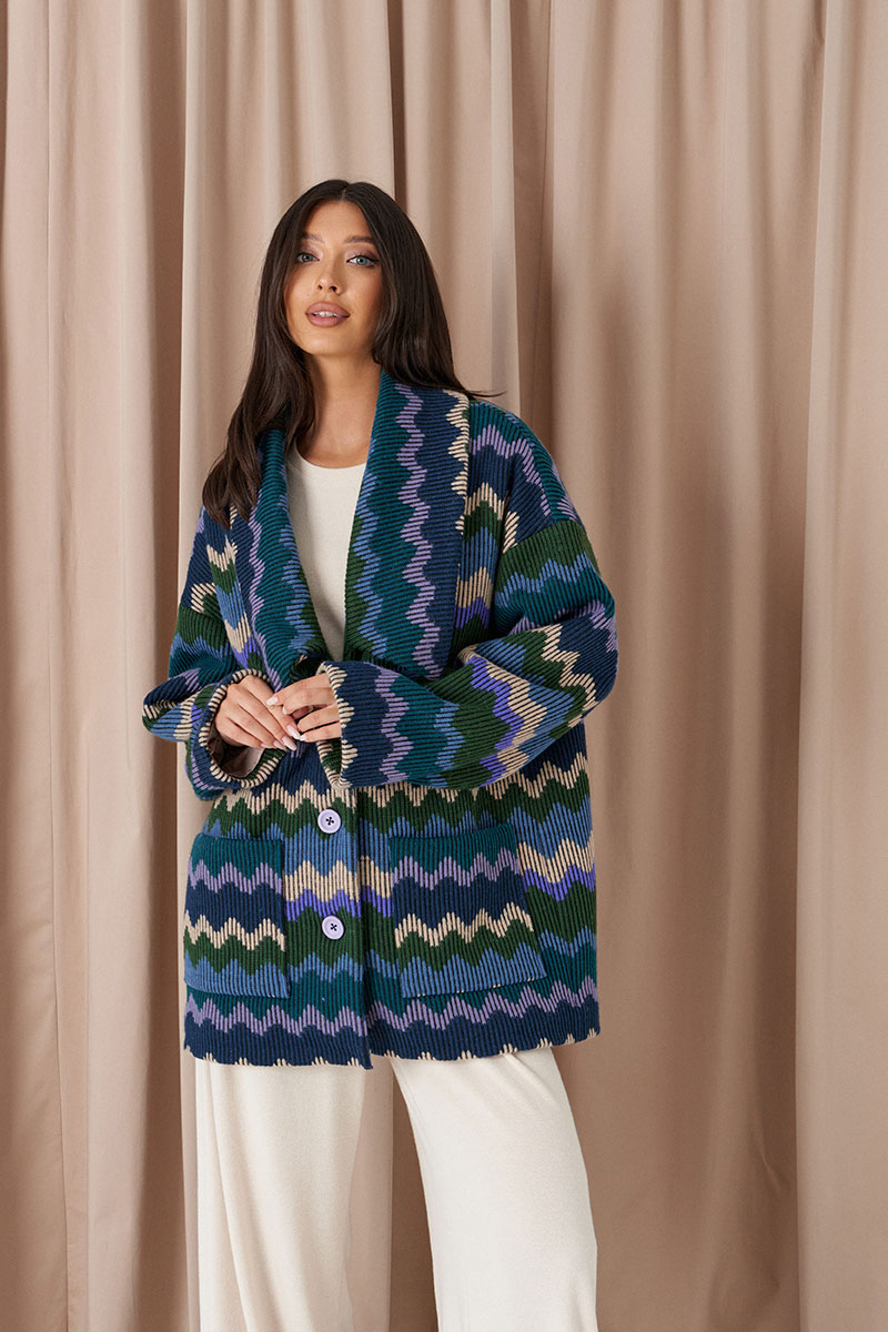 Жакет прямого свободного кроя, выполнен из полотна трикотажа крупной вязки. Характеристика: жакет прямого кроя, отложной воротник, центральная застежка на петли-пуговицы, по переду изделия два накладных кармана,брендированная подкладка, рукав свободный, линия плеча спущена, спинка цельнокройная.