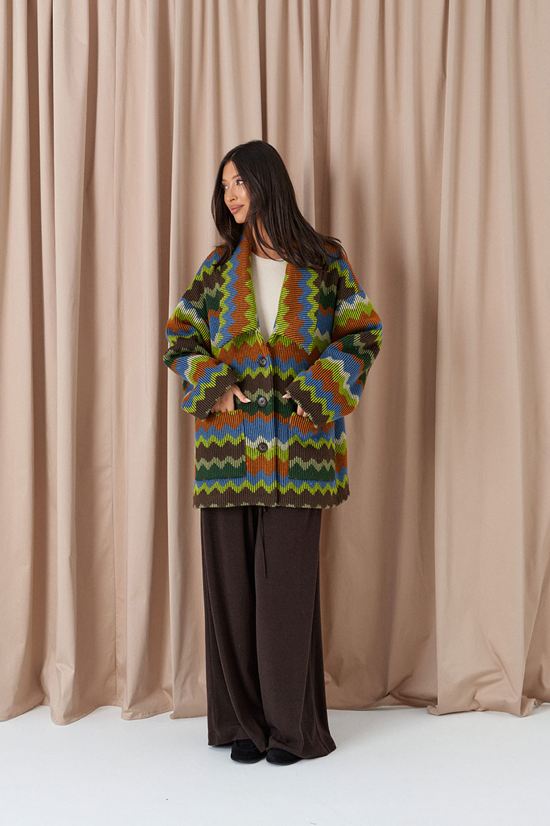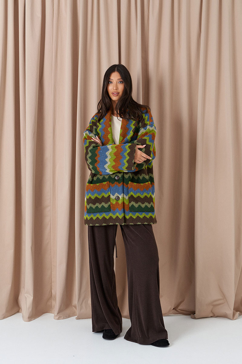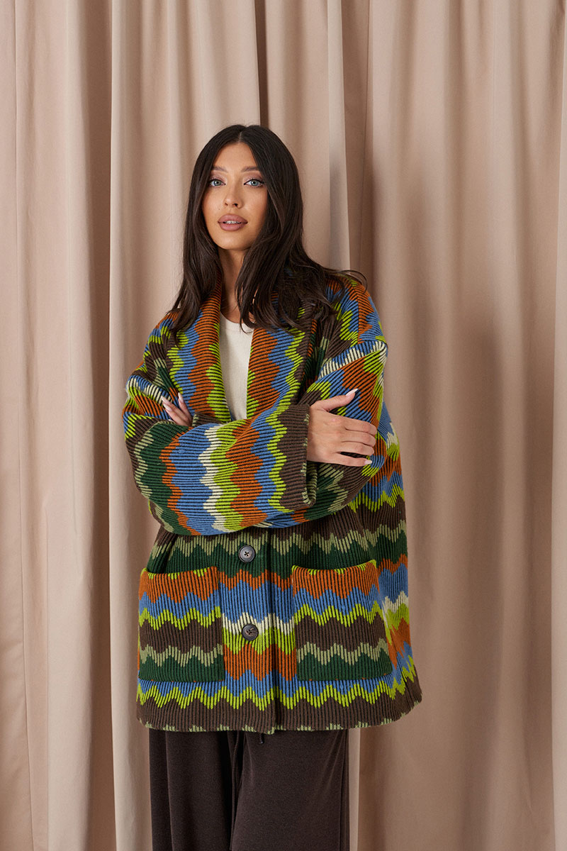 Жакет прямого свободного кроя, выполнен из полотна трикотажа крупной вязки. Характеристика: жакет прямого кроя, отложной воротник, центральная застежка на петли-пуговицы, по переду изделия два накладных кармана,брендированная подкладка, рукав свободный, линия плеча спущена, спинка цельнокройная.