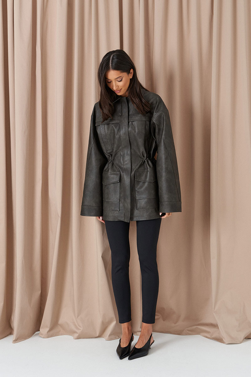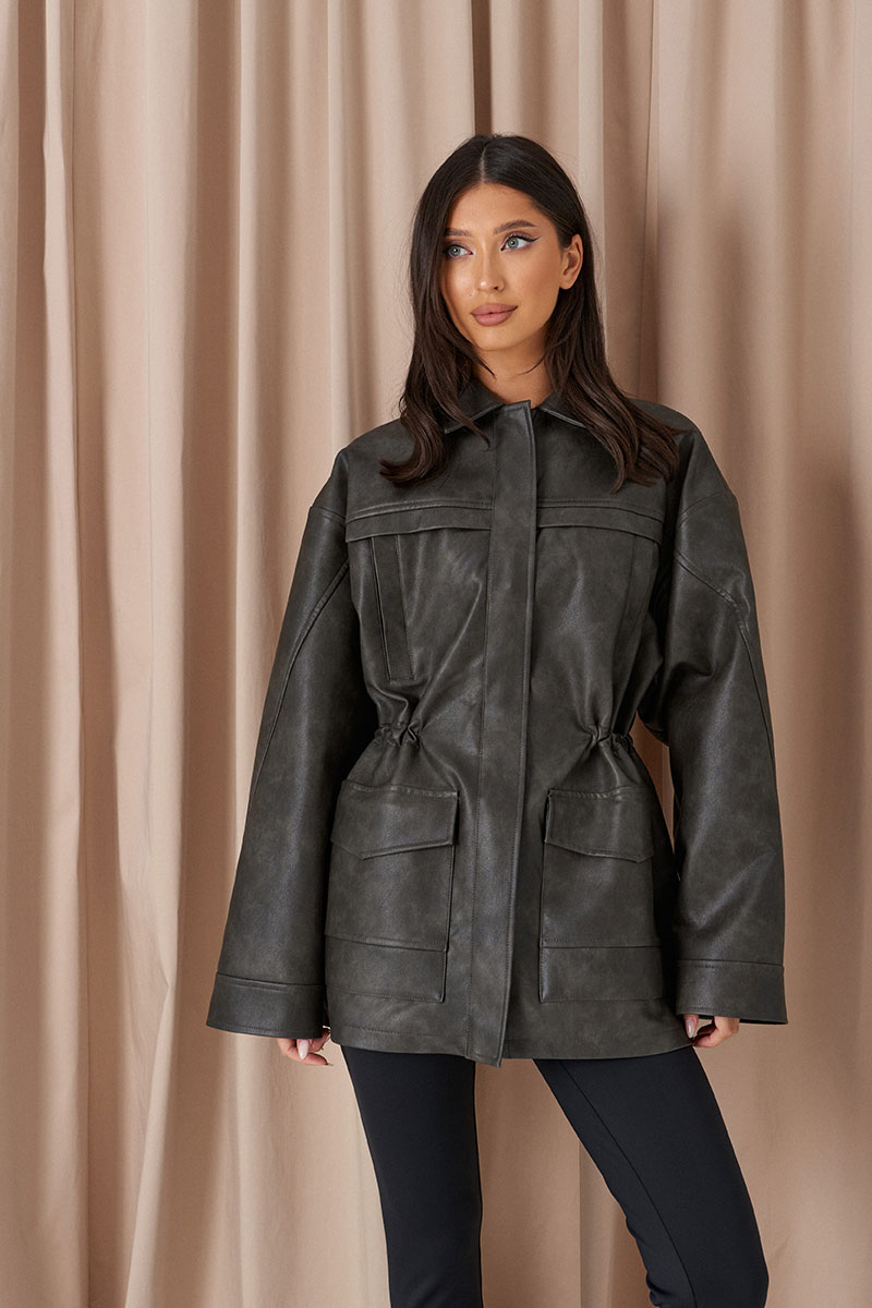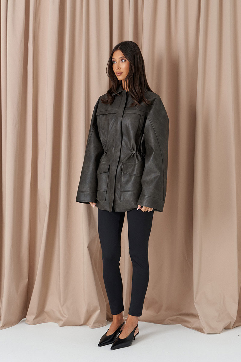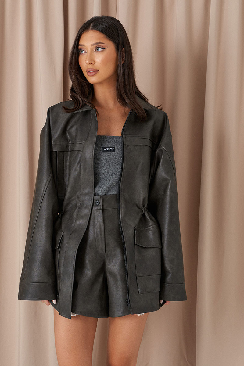 Жакет с акцентной талией выполнен из экокожи. Характеристики: прямой крой, на поясе изделия резинка, брендированная подкладка, отложной воротник, скрытые карманы на молнии на груди, и накладные карманы с клапанами ниже талии, застёжка центральная на молнии прикрытая планкой, отрезная спинка, рукав свободный.