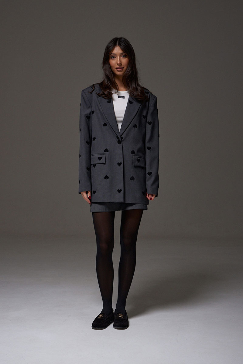 Жакет прямого свободного кроя выполнен из костюмной ткани серого цвета, декорированной черными сердечками. Характеристики: прямой свободный крой, брендированная подкладка, подплечники, воротник с остроугольным лацканом, застежка центральная на петлю - пуговицу, по переду функциональные карманы с клапаном, рукав втачной, по низу рукава нашиты пуговички, спинка со средним швом, в среднем шве разрез 24 см.