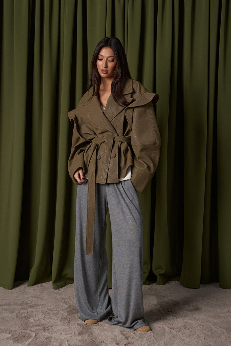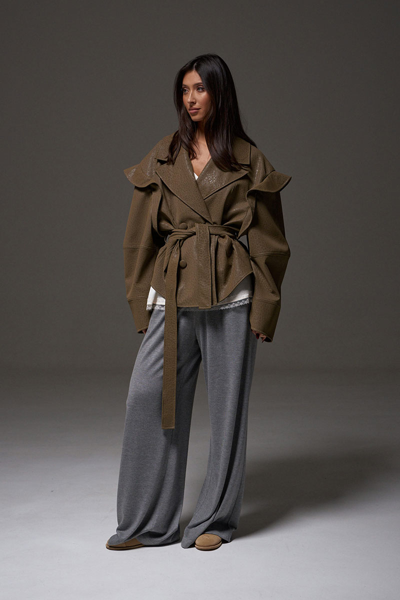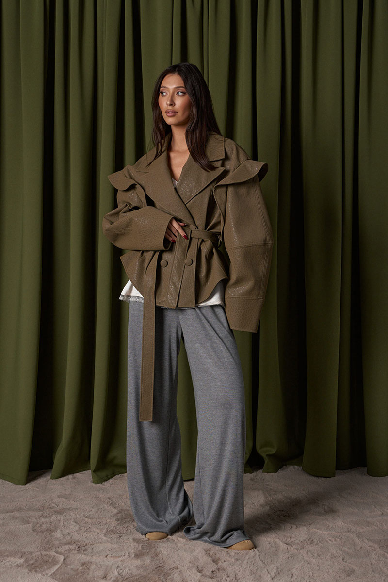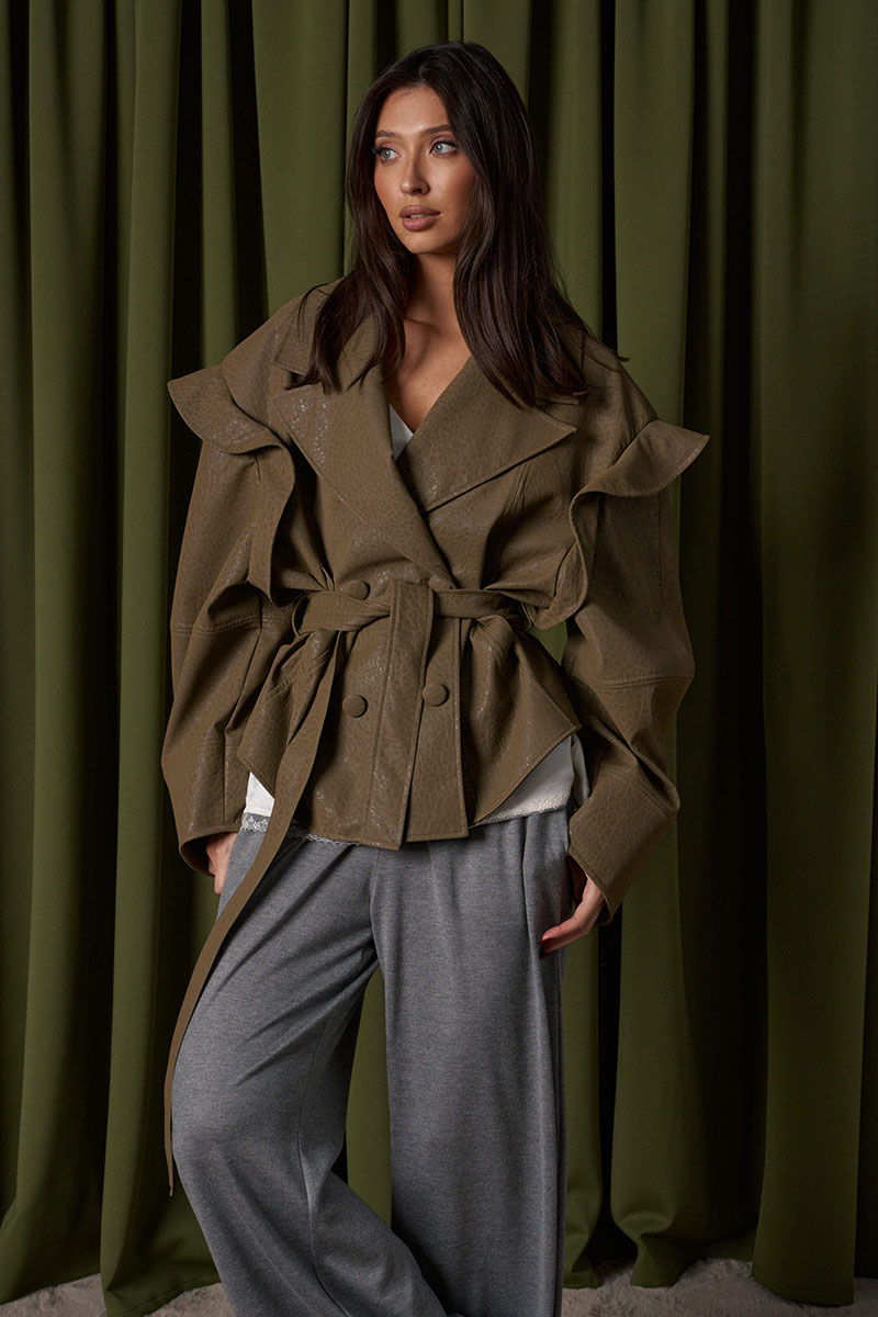 Укороченный жакет, выполнен из мягкой экокожи. Характеристики: прямой свободный крой, воротник стойка, по переду нашиты два кармана с клапанами, брендированная подкладка, застежка центральная на молнии скрыта под планкой. Плечо спущенно, манжета рукава на резинке с фиксатором. Низ изделия на резинке с фиксатором.