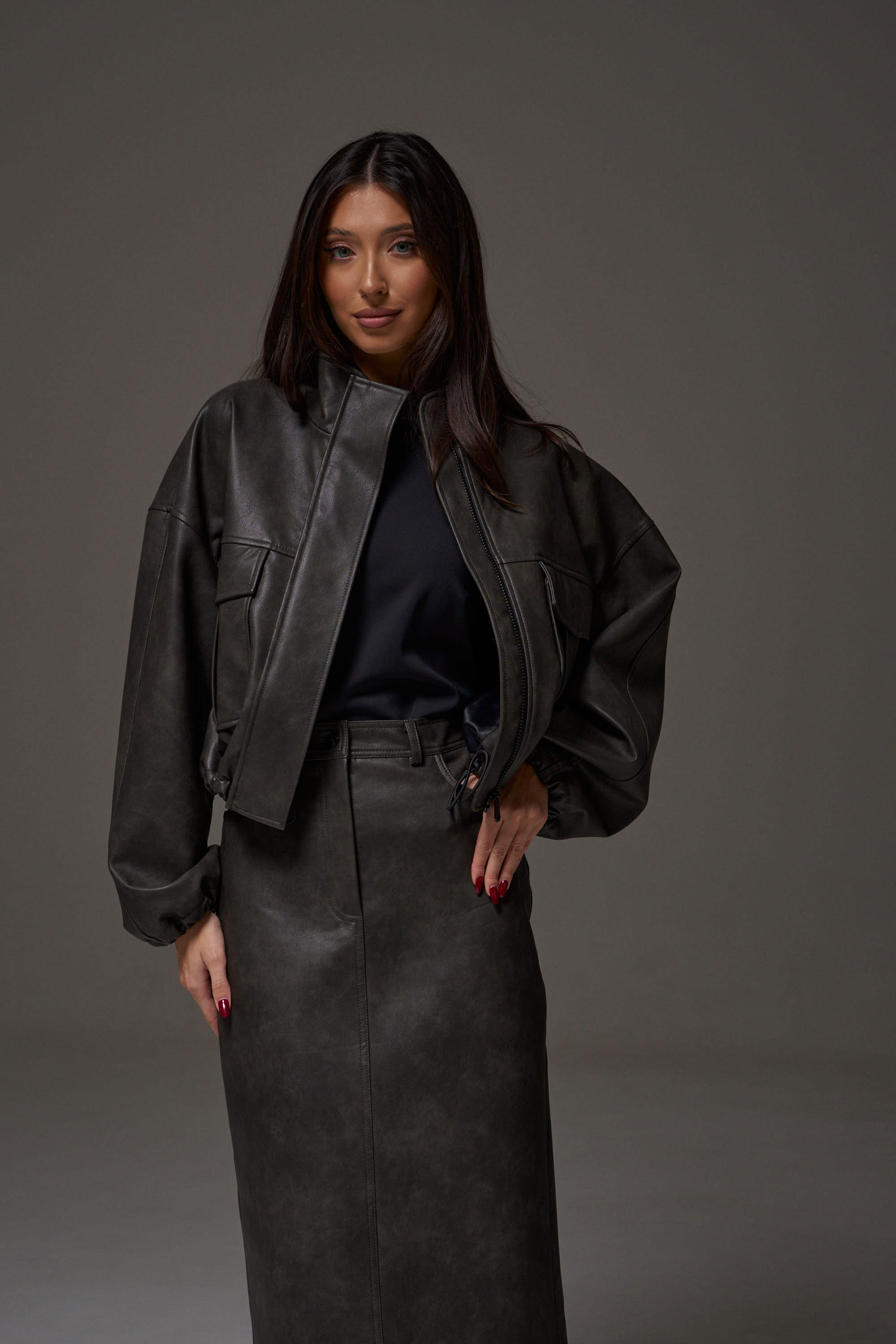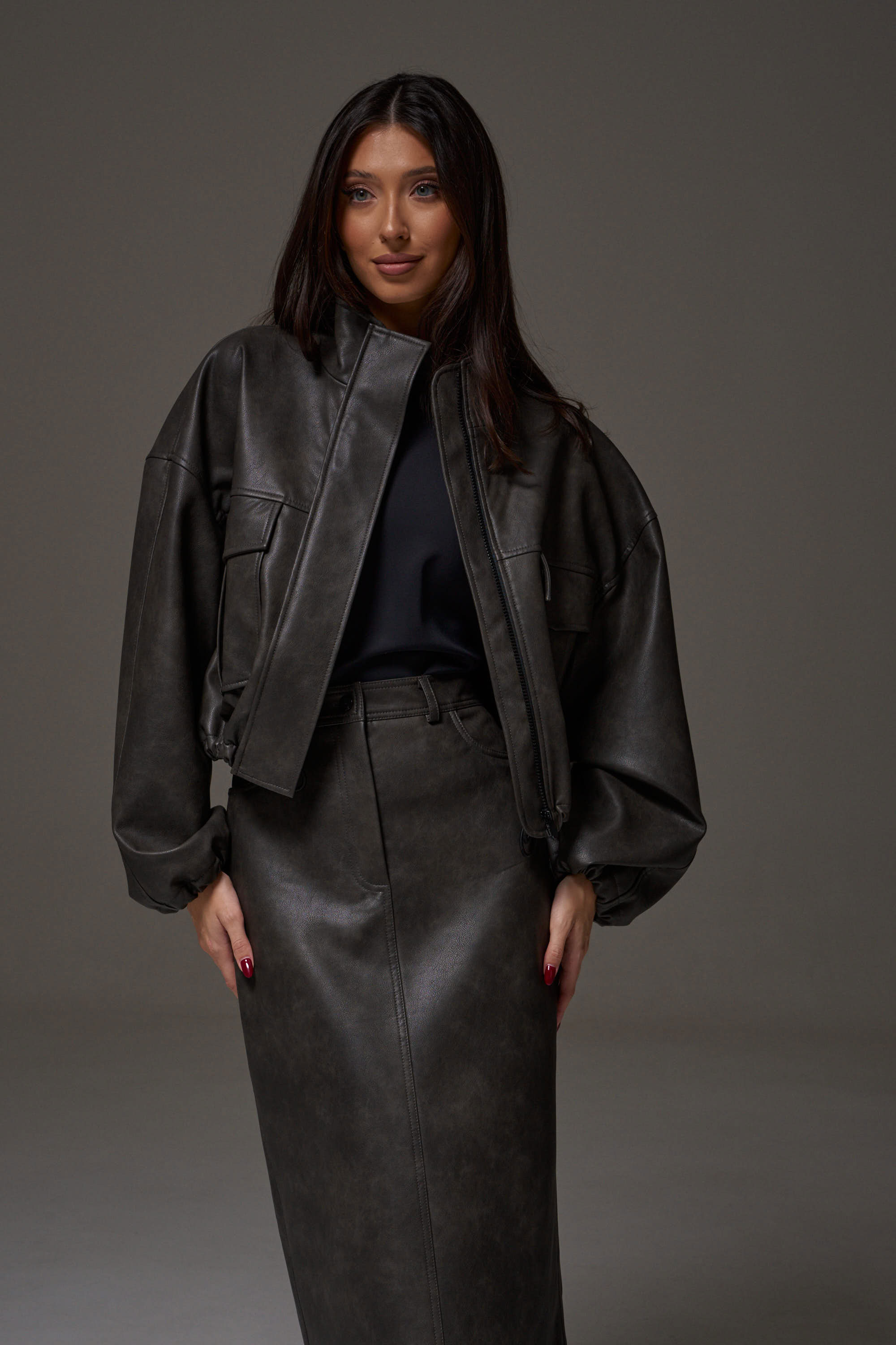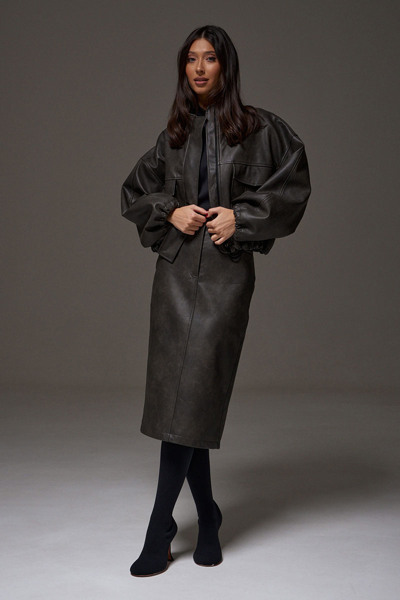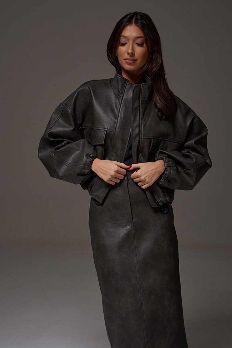 Укороченный жакет, выполнен из мягкой экокожи. Характеристики: прямой свободный крой, воротник стойка, по переду нашиты два кармана с клапанами, брендированная подкладка, застежка центральная на молнии скрыта под планкой. Плечо спущенно, манжета рукава на резинке с фиксатором. Низ изделия на резинке с фиксатором.