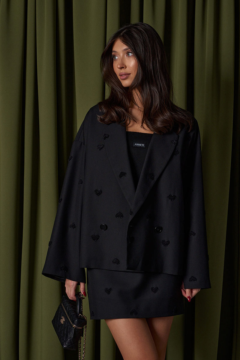 Жакет прямого кроя, выполнен из костюмной ткани черного цвета с шитем в форме сердец. Характеристика: Жакет двубортный, подклад, воротник с остроугольным лацканом, в боковых швах изделия карманы, рукав спущеный, прямой.