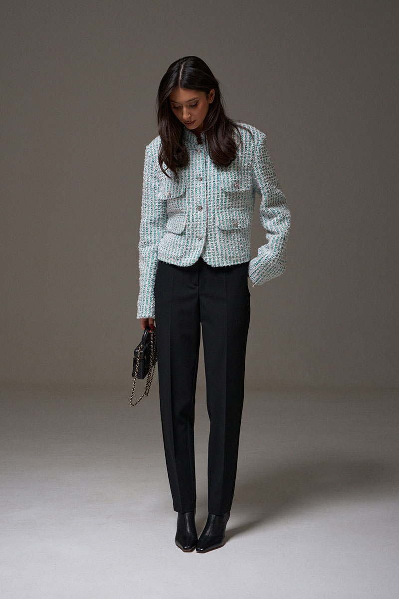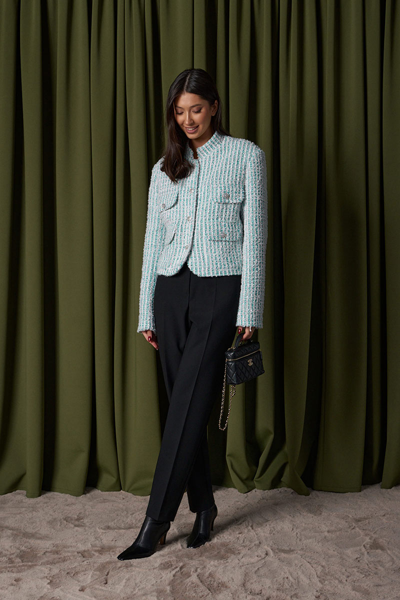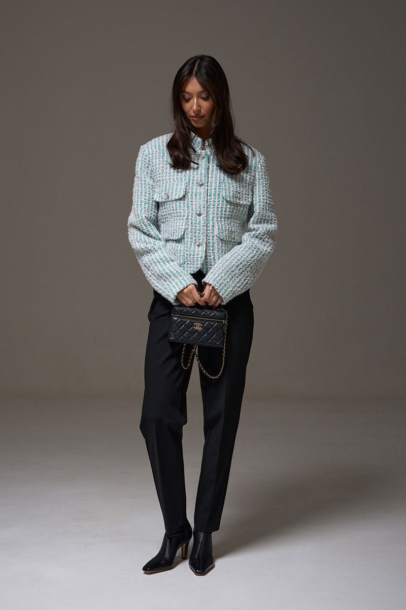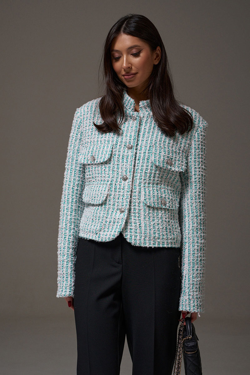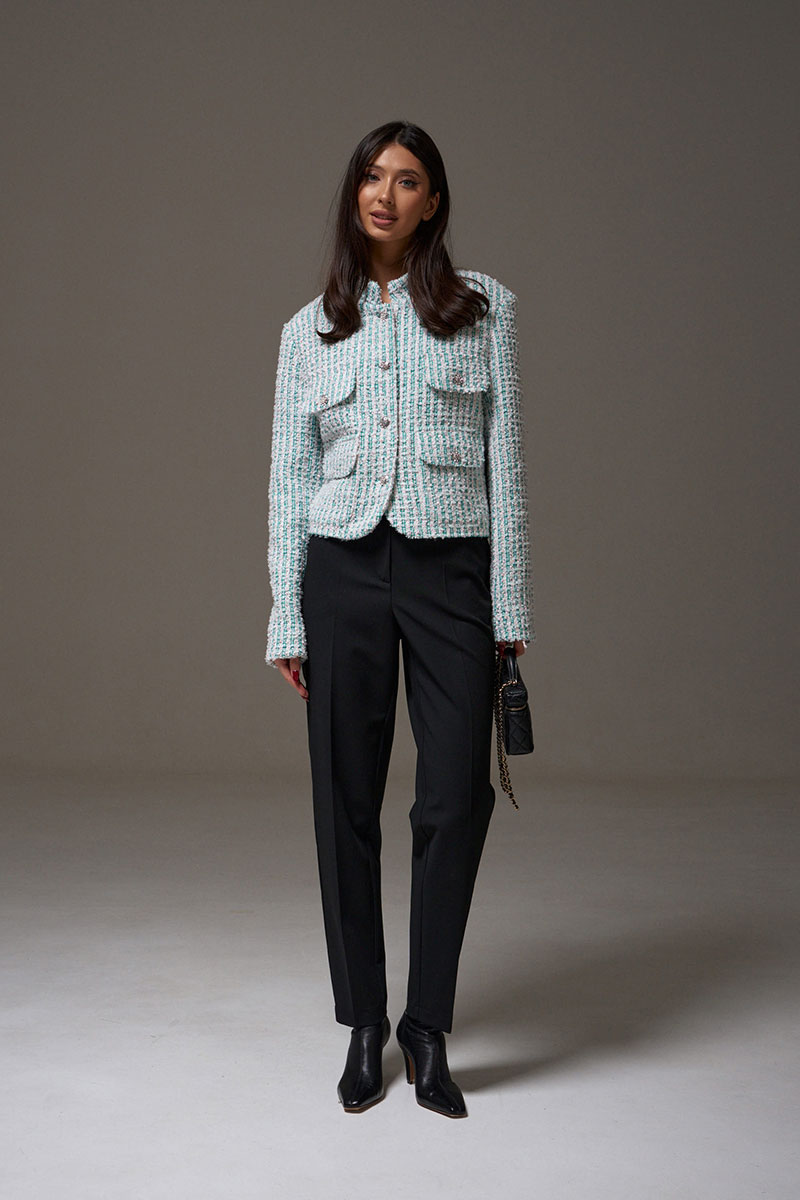 Жакет прямого свободного кроя, выполнен из фактурного твидового полотна. Характеристики: горловина стойка, застежка центральнаяна петли пуговицы, подплечники, рукав прямой, внутри брдендированная подкладка. На уровне линии груди декоративные карманы с клапаном, внизу накладные карманы с клапаном.
