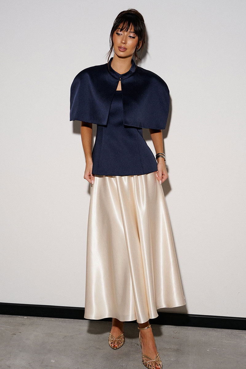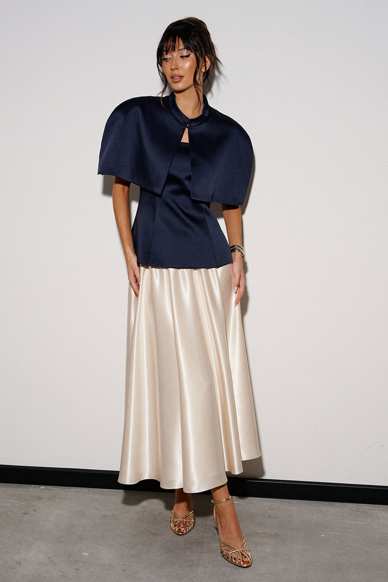Кейп выполнен из костюмной сатиновой ткани глубокого синего цвета. Характеристики: горловина стойка, застежка центральная на крючок, подплечники, брендированная подкладка.