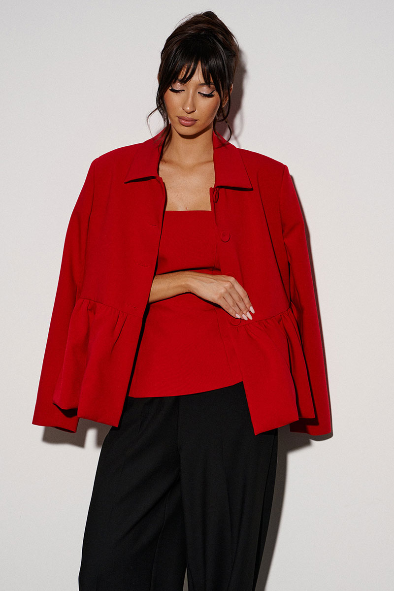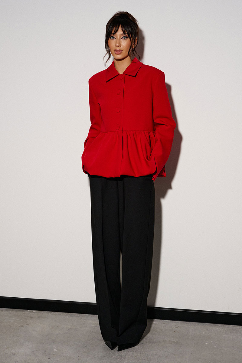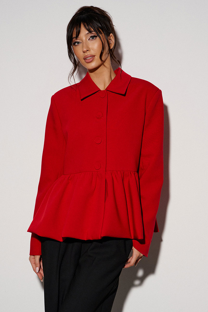 Жакет прямого кроя, с баской по нижней части изделия. Выполнен из костюмной ткани. Характеристики: брендированая подкладка, отложной воротник, застежка центральная на пуговички, рукав втачной.