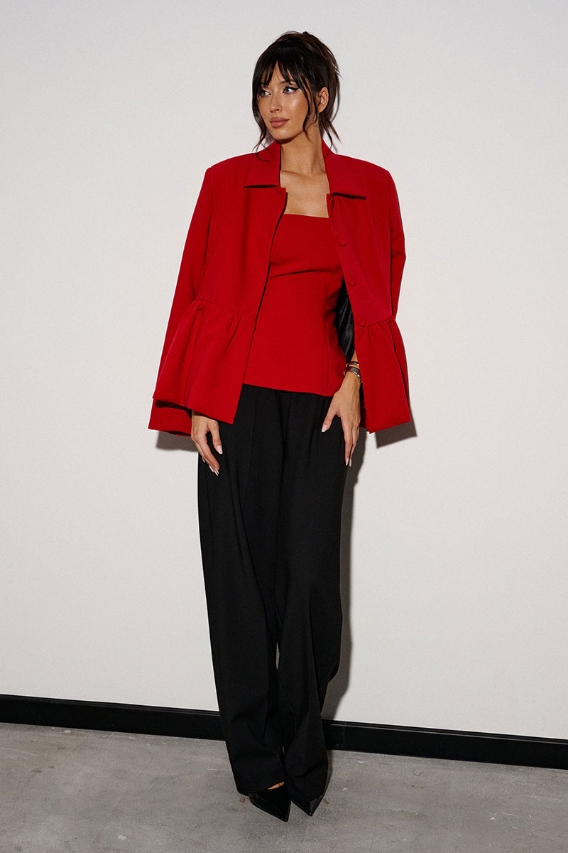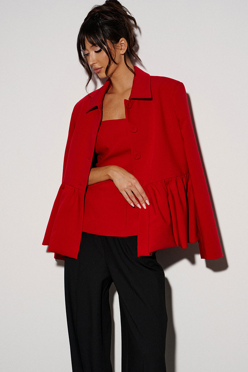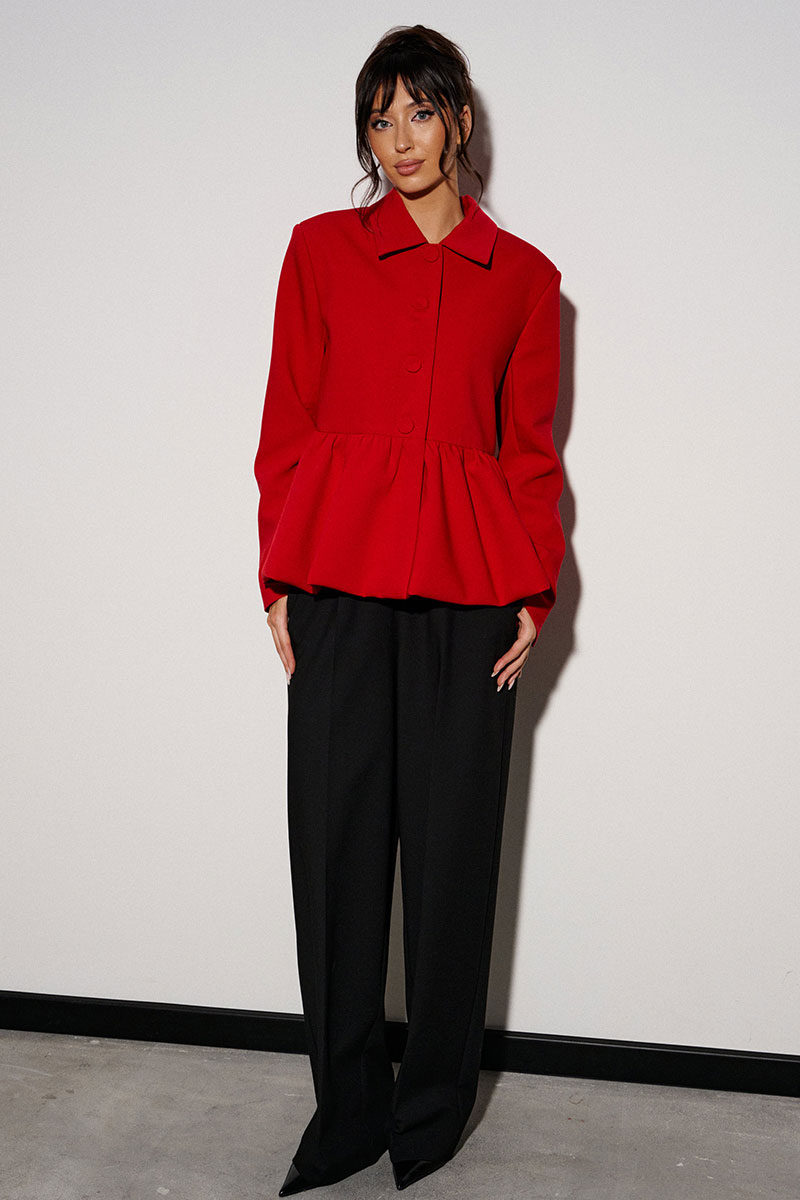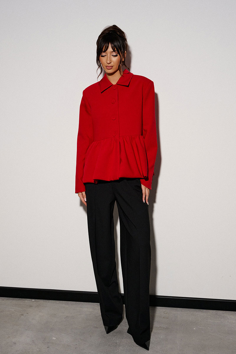 Жакет прямого кроя, с баской по нижней части изделия. Выполнен из костюмной ткани. Характеристики: брендированая подкладка, отложной воротник, застежка центральная на пуговички, рукав втачной.