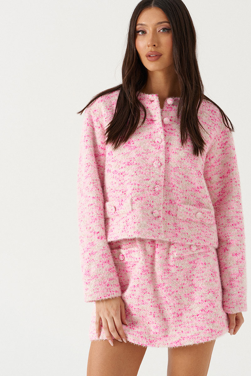 Жакет уороченный прямого кроя, выполнен из твидовой ткани бежево-розового цвета. Характеристика: прямой крой, овальная горловины, центральная застежка на петли-пуговицы, спереди изделия имитация карманов, подклад.