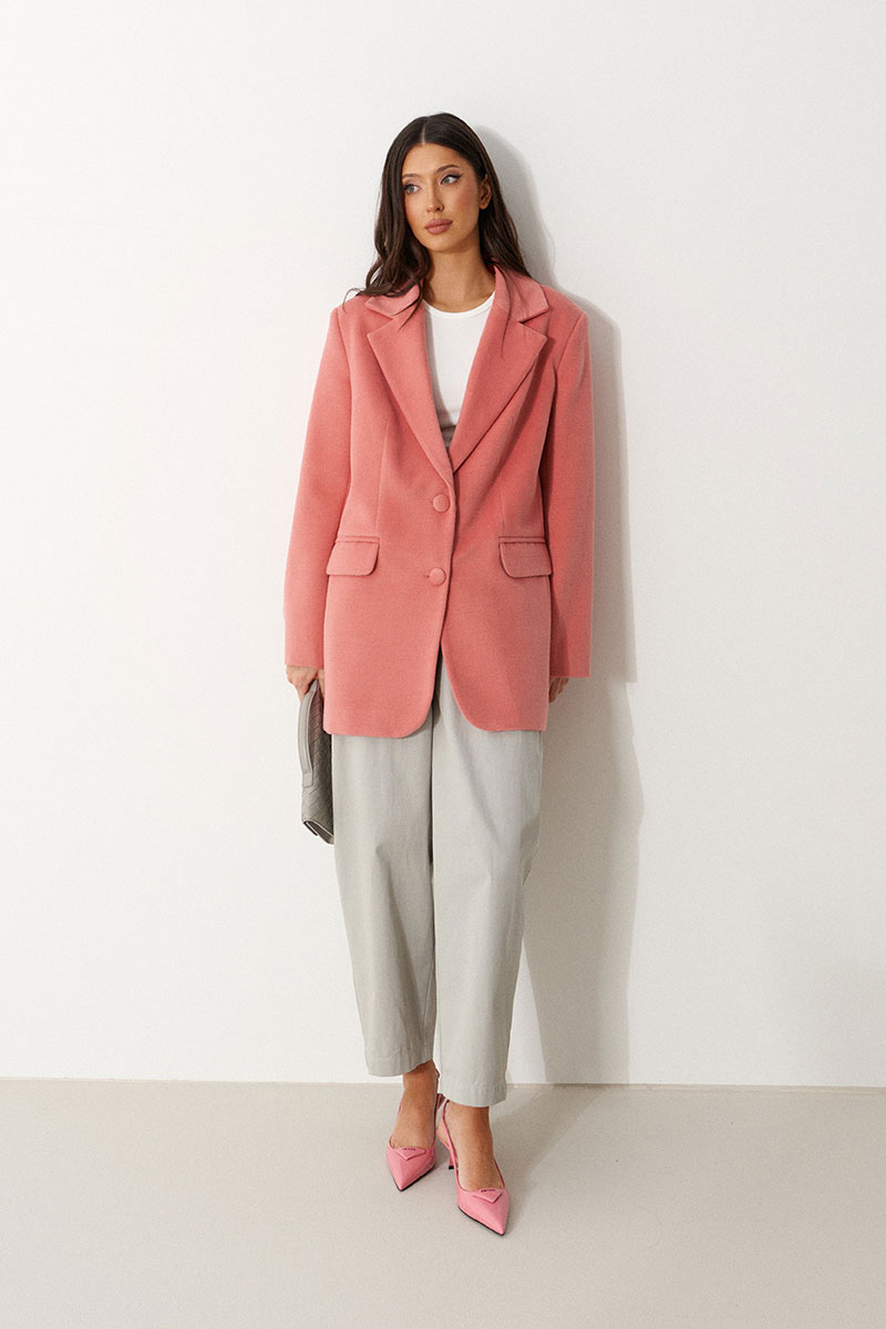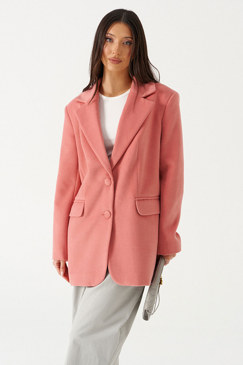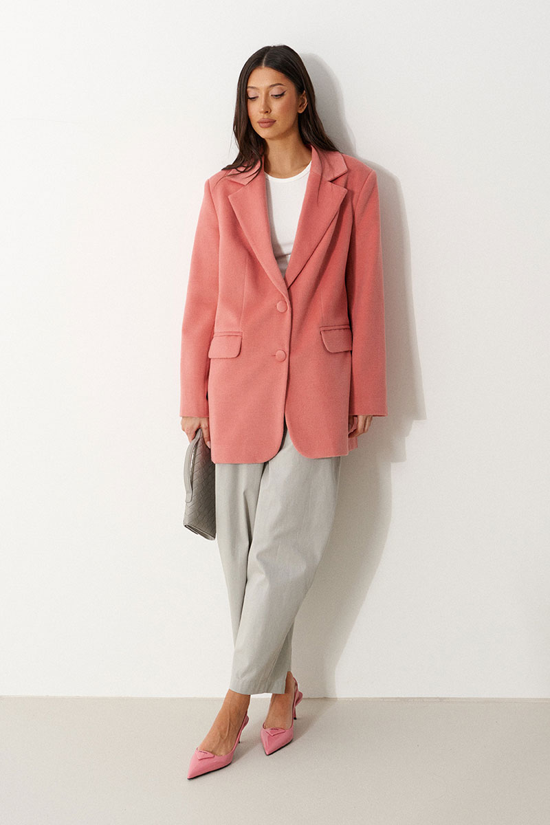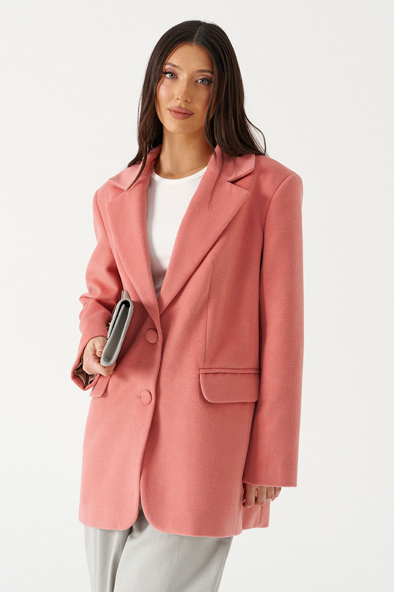 Жакет прямого свободного кроя. Выполнено из пальтовой ворсовой ткани нежного розового цвета. Характеристика: брендтрованная подкладка, воротник отложной с лацканами, рукав втачной и чуть спущен, по переду карманы с клапанами, застёжка центральная - пуговицы, в среднем шве заднего полотна шлица (29,5 см). В комплекте пояс из ткани основного изделия. В комплекте идет пояс из основной ткани изделия.