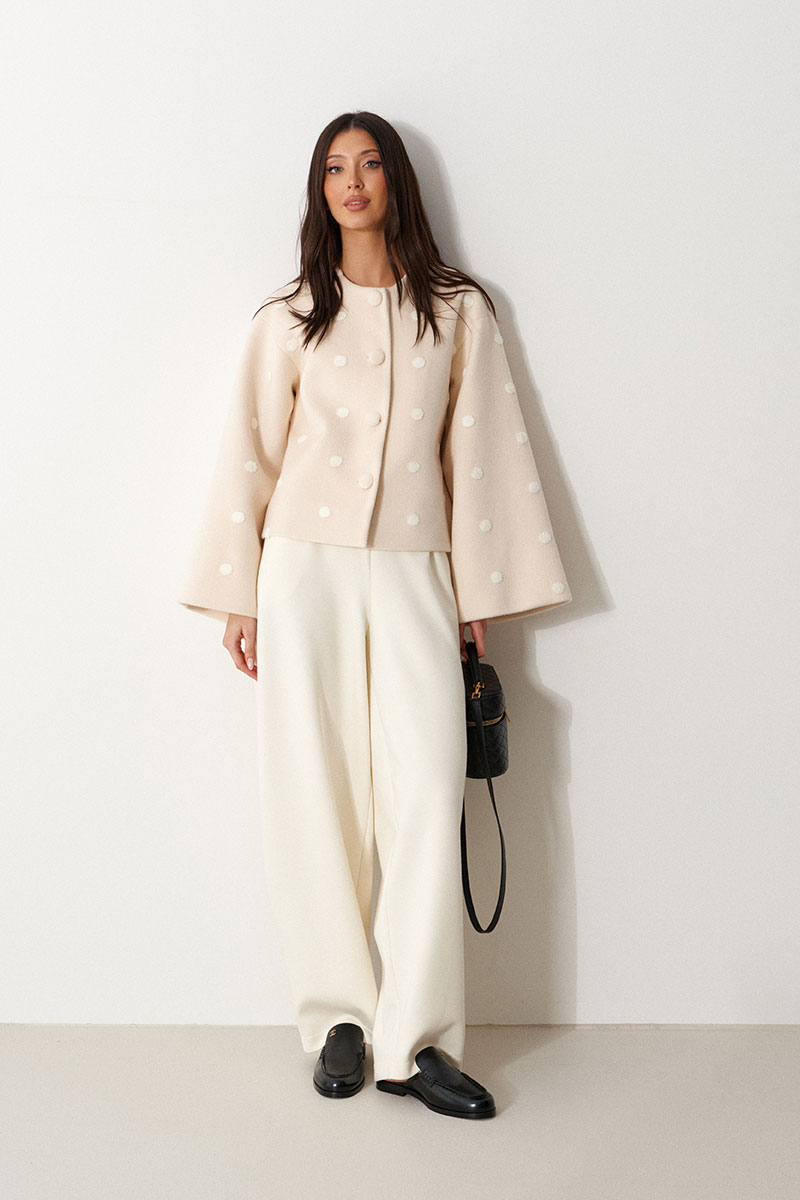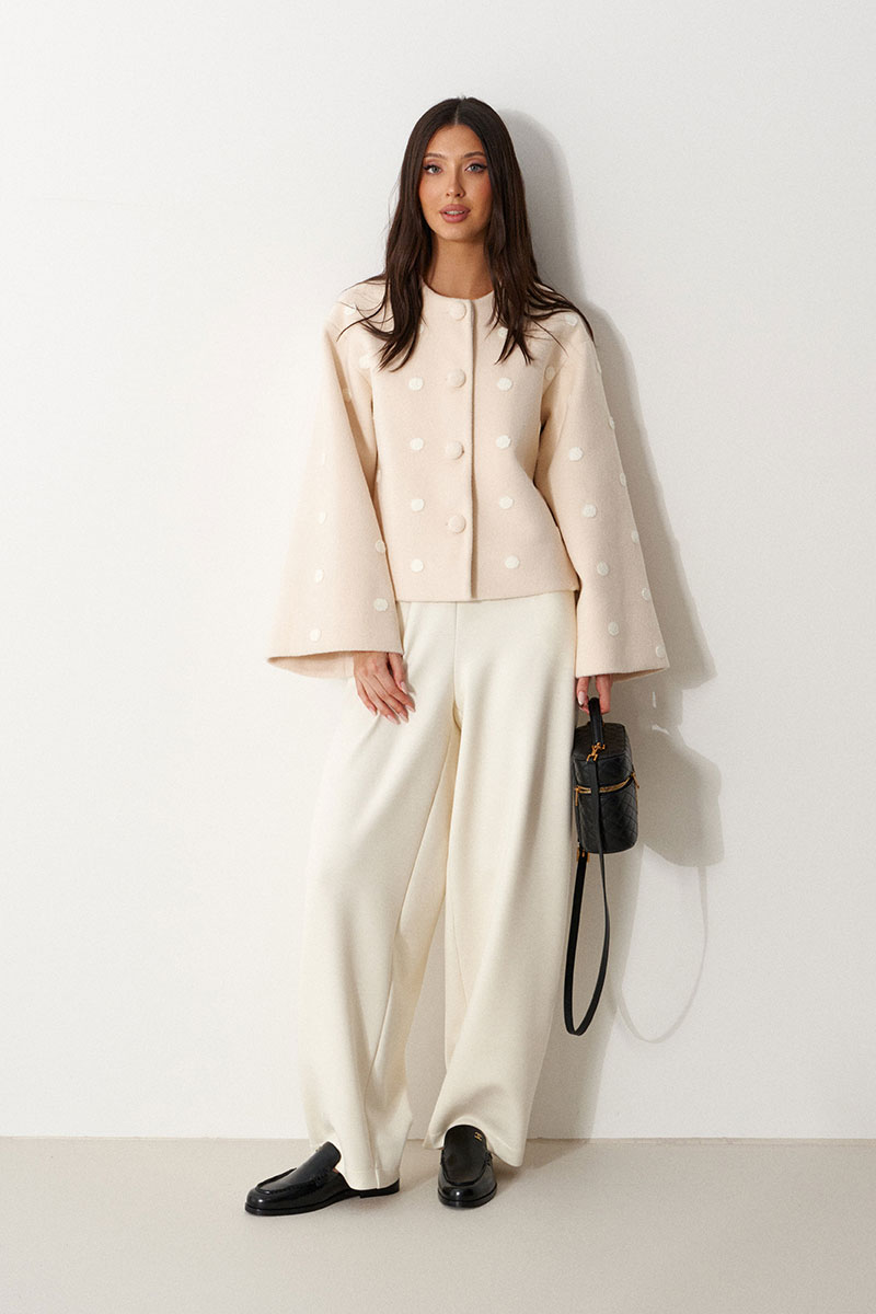 Жакет свободного прямого кроя, выполнен из мягкой ткани светло-бежевого цвета в белый горох. Характеристика: прямой крой, горловина круглая, застежка центральная на петли-пуговицы, рукав втачной спущенный, расширяется к манжету, брендированный подклад.