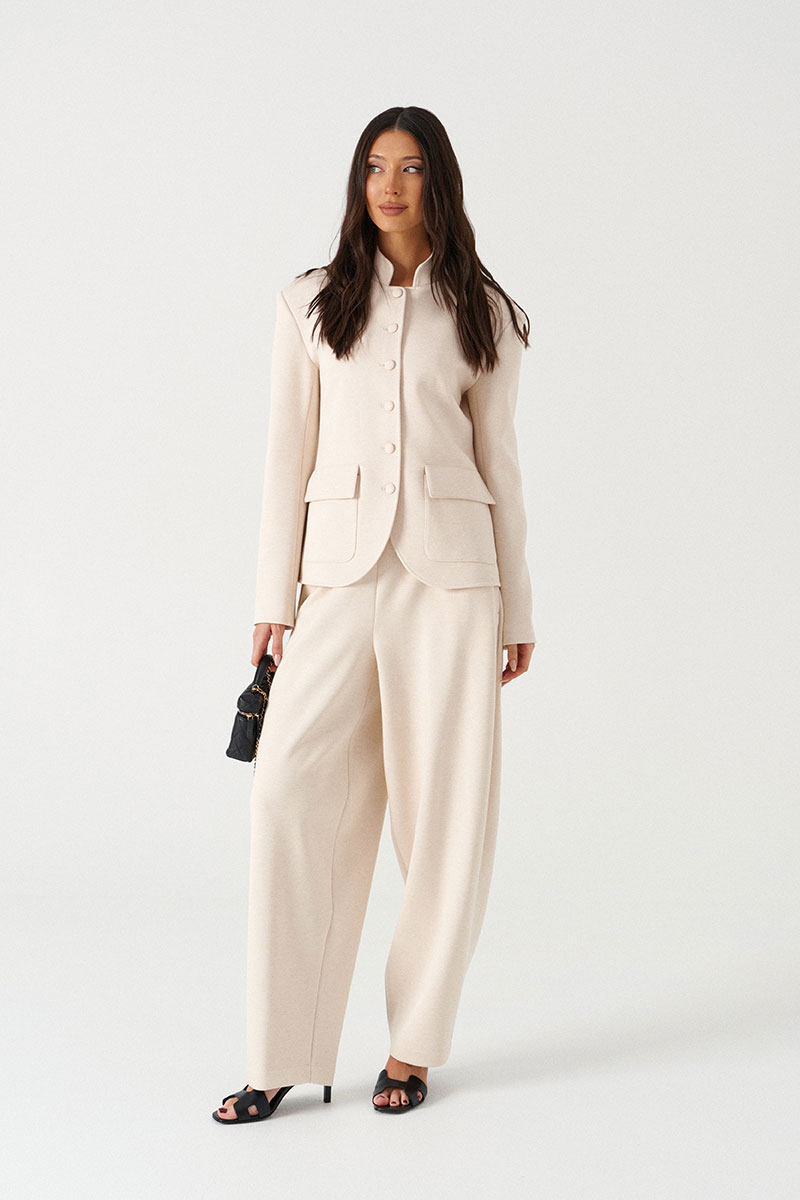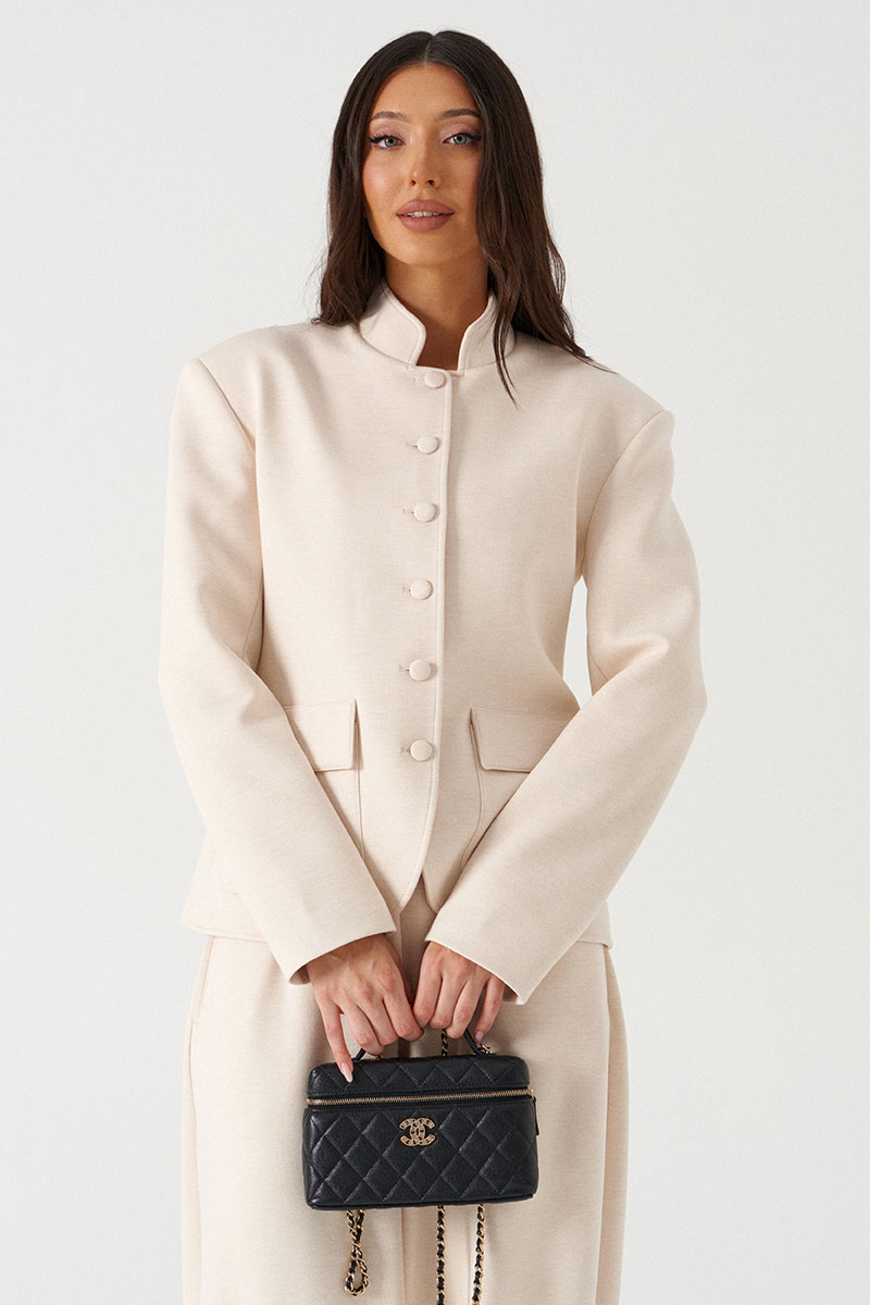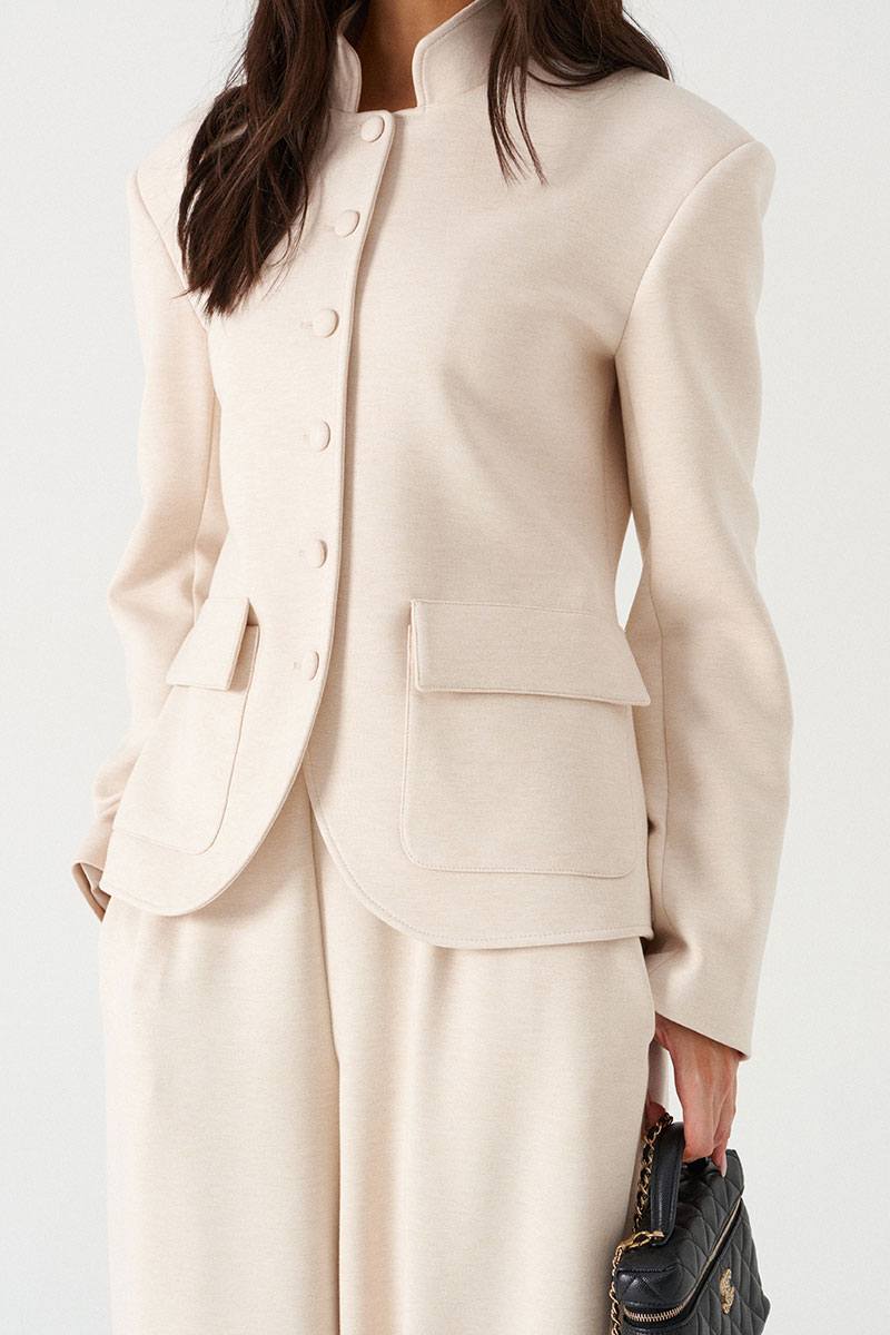 Жакет прямого кроя, выполнен из трикотажного полотна молочного цвета. Характеристики: прямой крой, на подкладке, вырез горловины круглый с притачным воротником-стойкой, накладные карманы с клапанами, спинка цельная, рукав втачной, застежка центральная бортовая, застегивающаяся на пробивные петли и пришивные пуговицы.